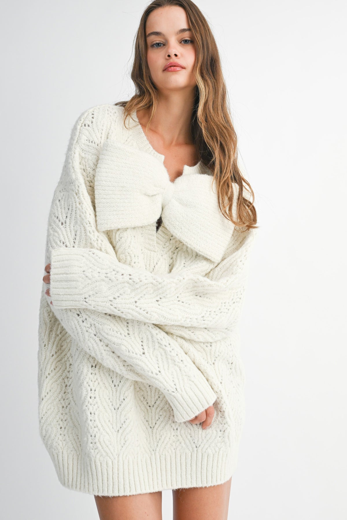 Our Pretty Baby Sweater Dress is perfect for your next holiday party! Features long sleeves, a scoop neck and an oversized bow at the chest. Oversized, generous fit.