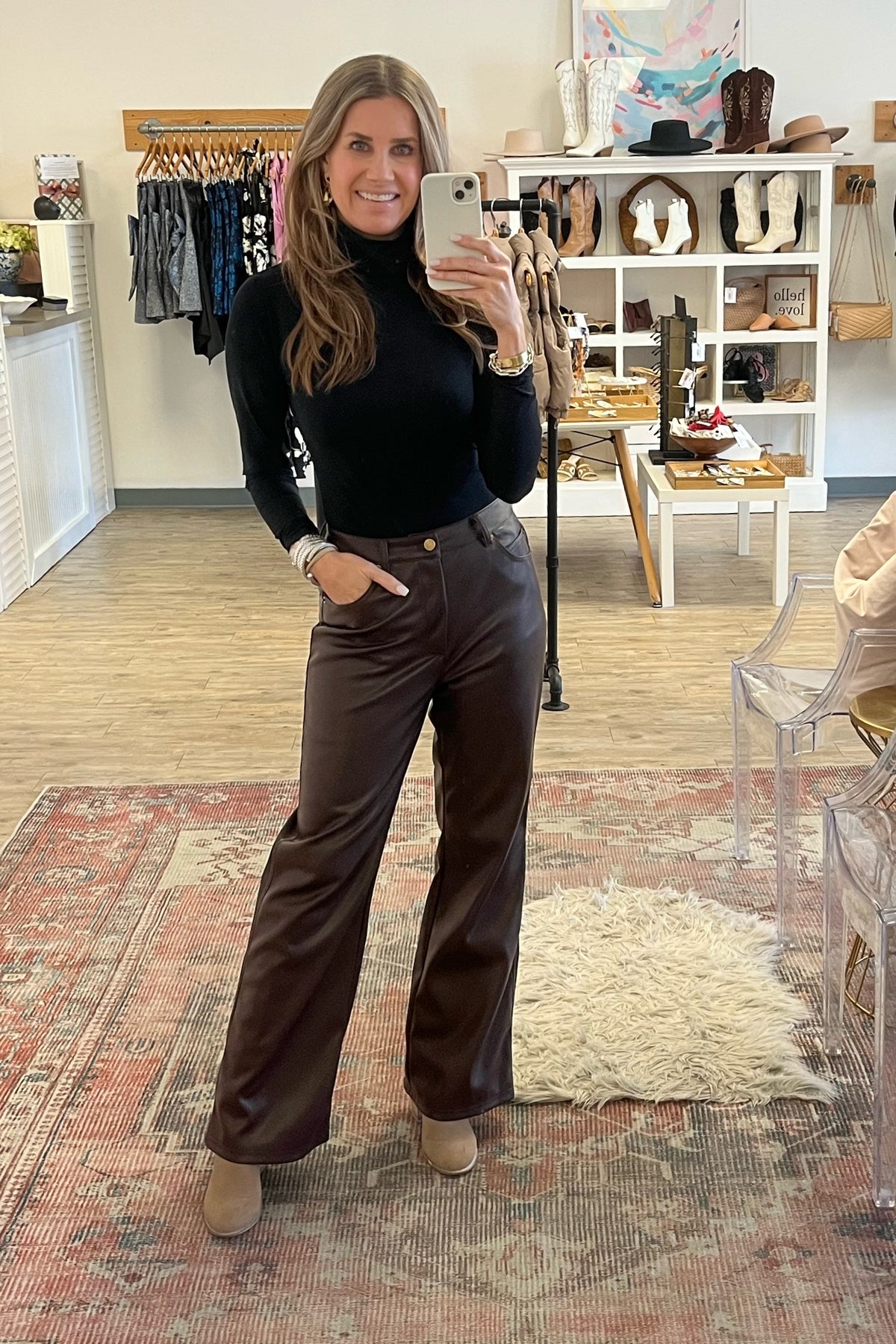 Faux leather straight-leg pant. Classic four-pocket styling (patch pockets in back). Zip fly finished with a brushed bronze button. Styled with our Spanx Suit Yourself Turtleneck Bodysuit and Shiloh Knee-High Boot.