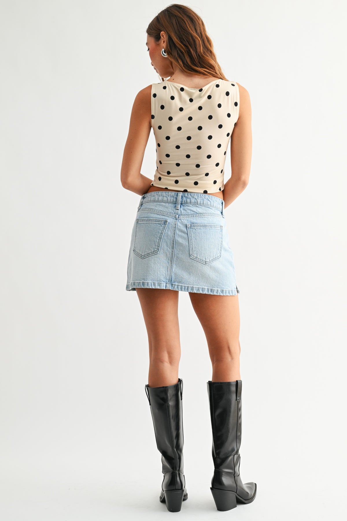 Every girl needs a denim mini in her closet! This denim skirt boasts a playful micro length and a chic slit, adding a hint of flirty sophistication. The light denim wash offers a bright, versatile look, perfect for mixing and matching with your favorite tops. Styled with our Classic Cardigan and Vivian Loafer Slides.