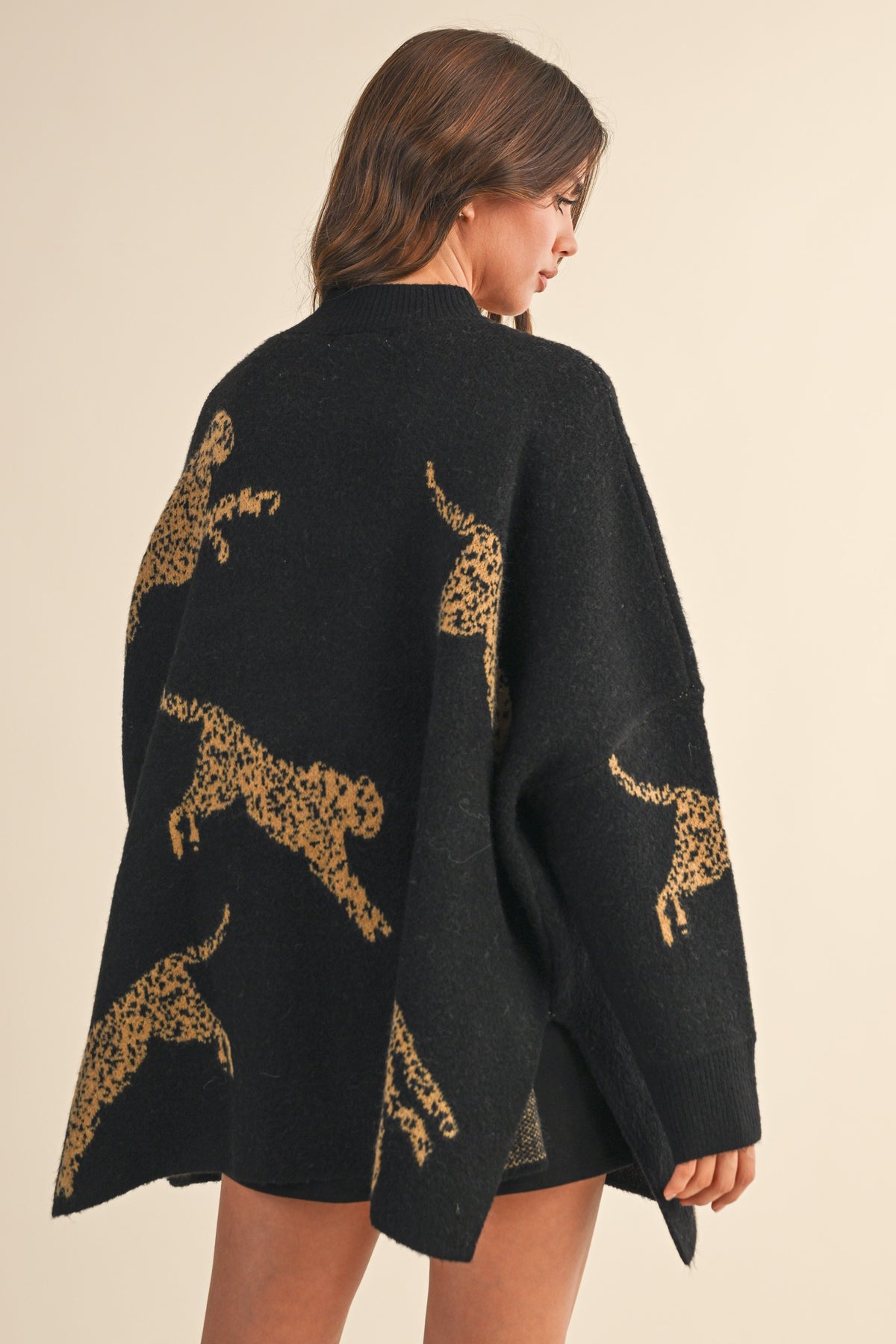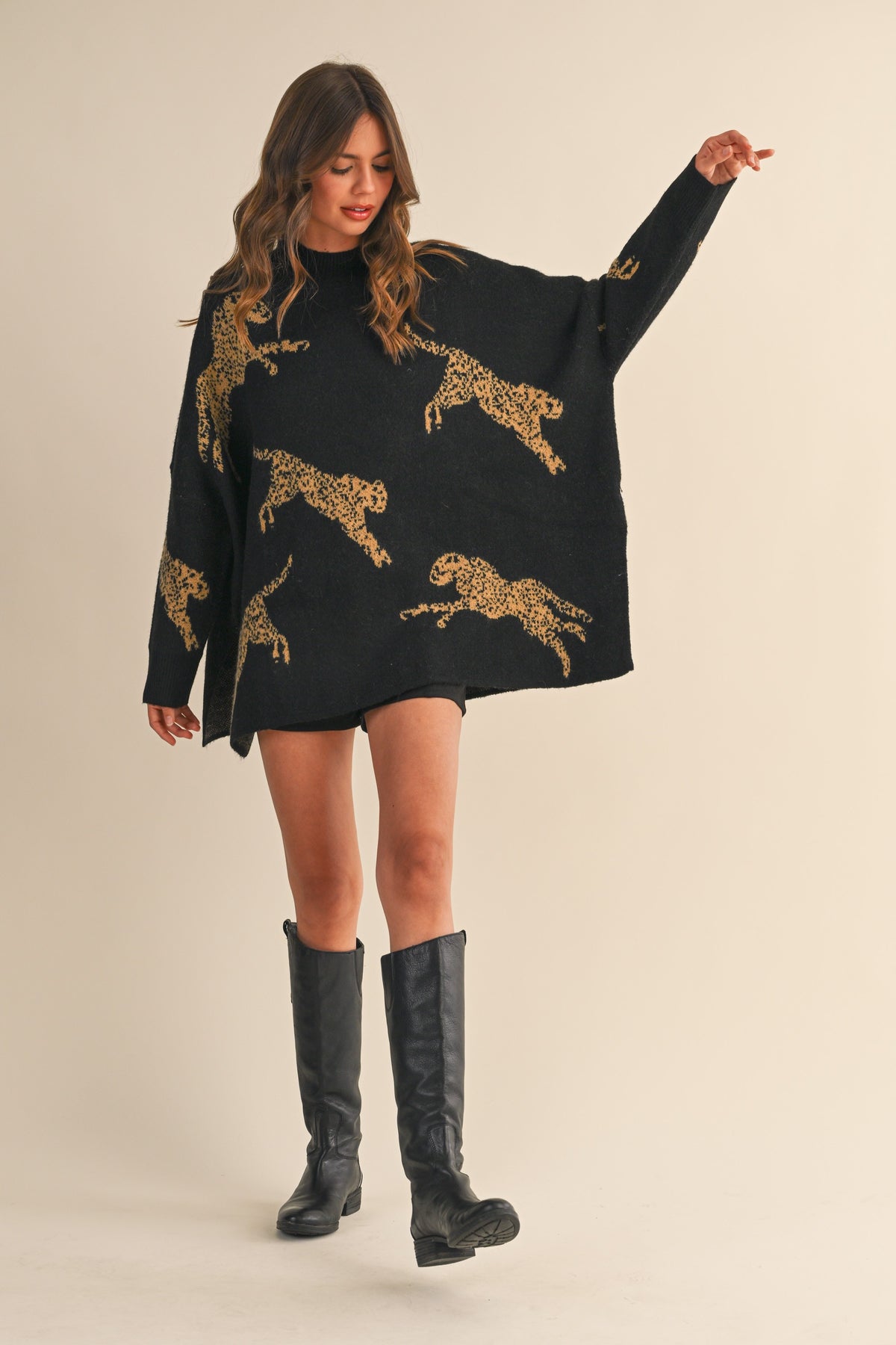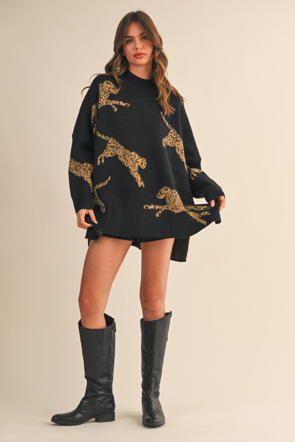 Super-soft, oversized sweater tunic featuring a mock neck and graphic cheetahs all over. Styled with our Hayley Shorts and Shiloh Knee-High Boot.