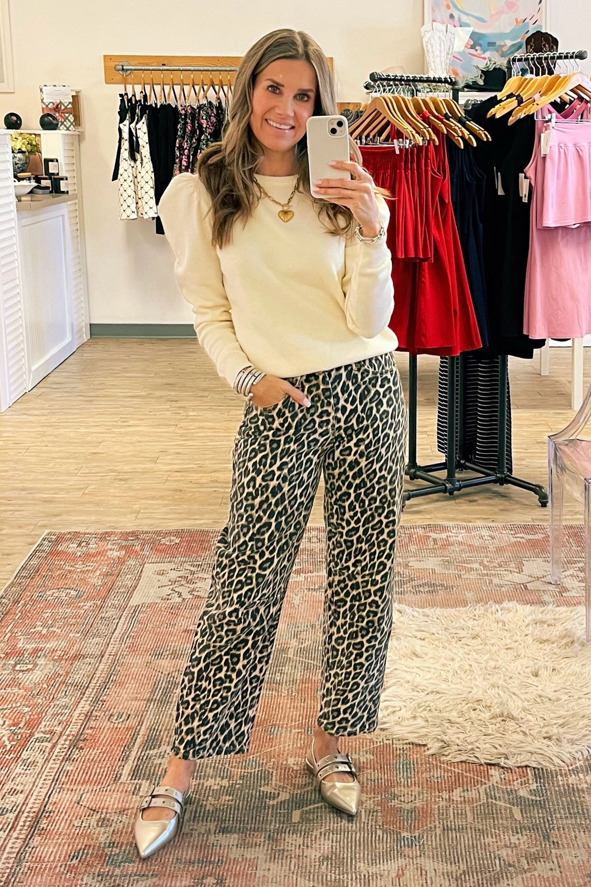 Leopard print barrel jean featuring a high rise and cropped leg. Classic five-pocket styling. Comfort stretch denim. Styled with our Teddy Sweater and Fabiola Flat.