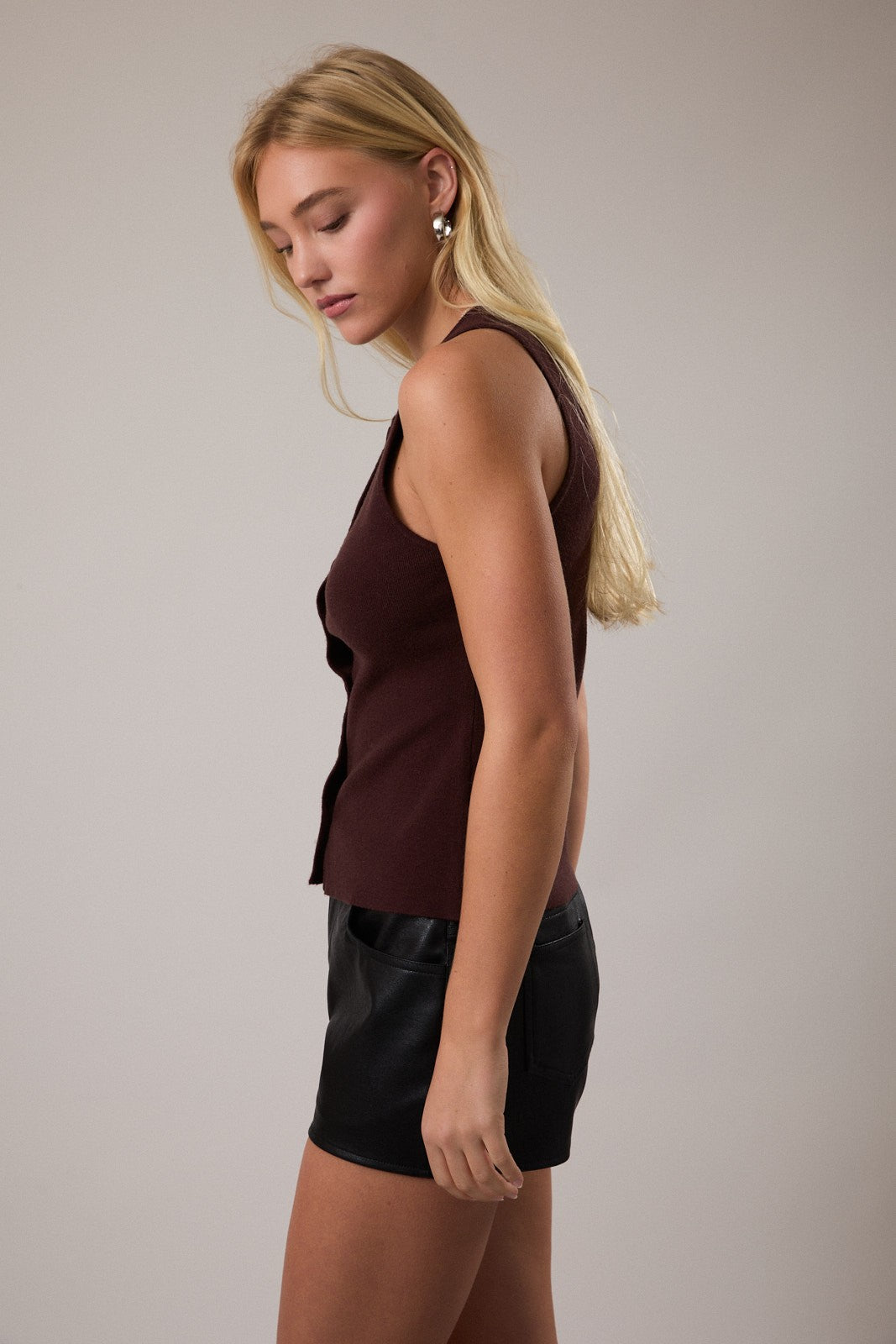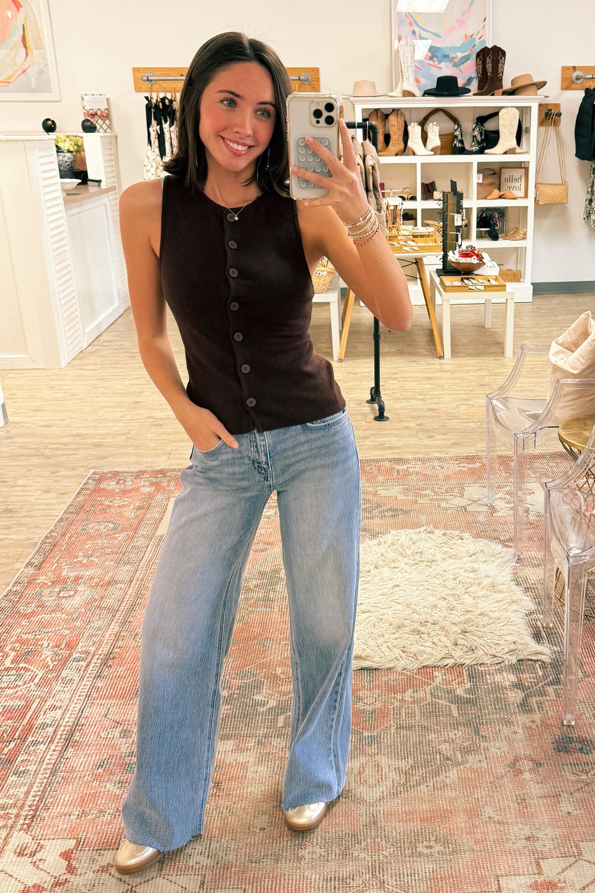 Simple and chic. Our Marisa Knit Vest features a round neck and buttons down the front. Hip length. Sleeveless. Super soft lightweight sweater material. Styled with our Poprock Wide-Leg Jean and Giana Sneaker Mule.