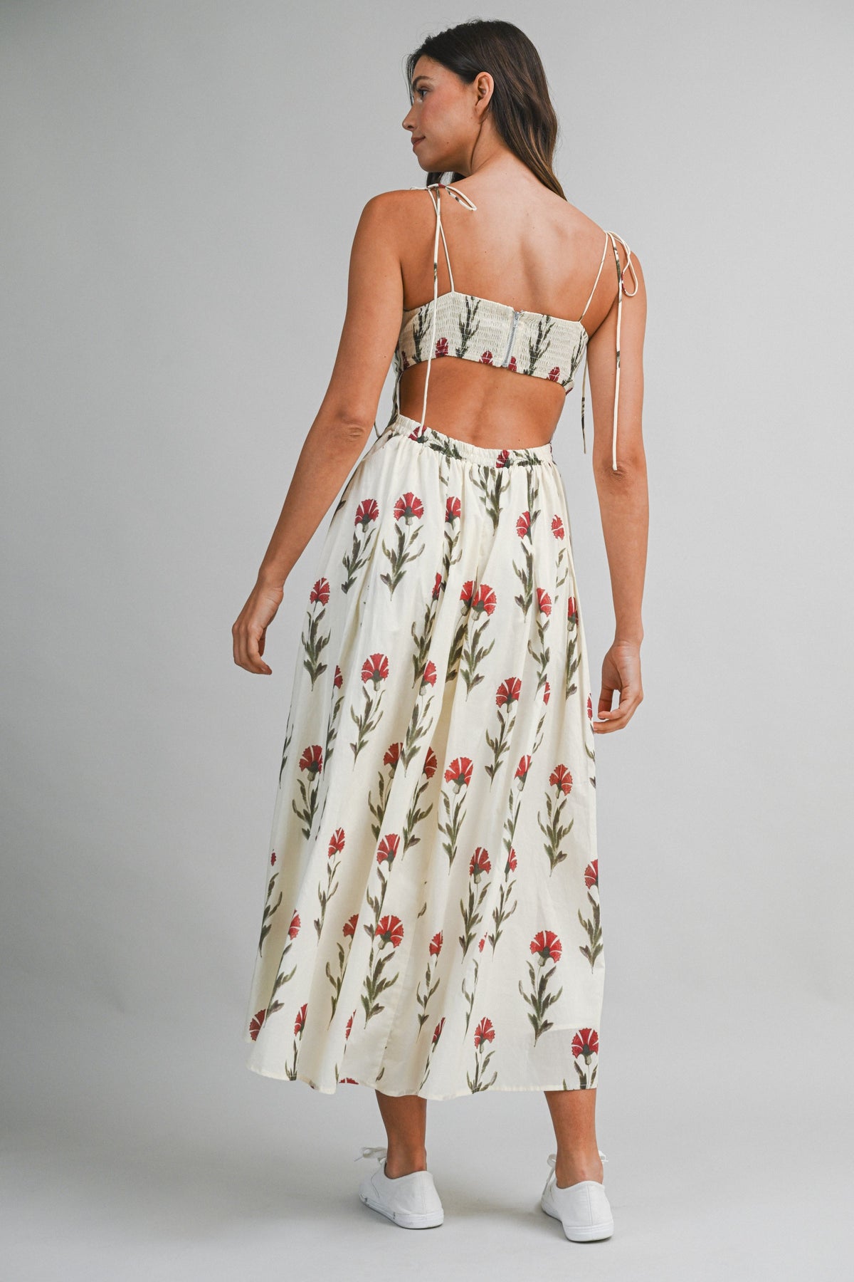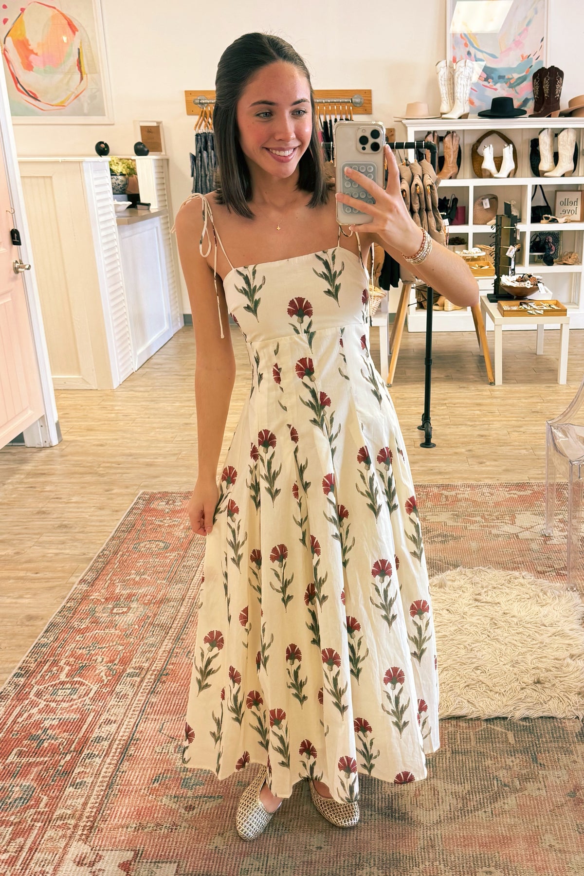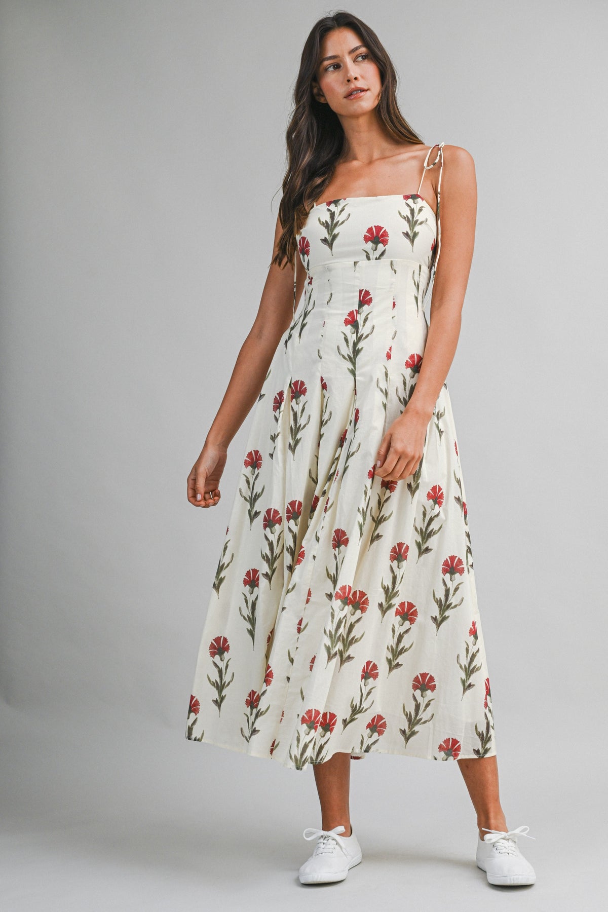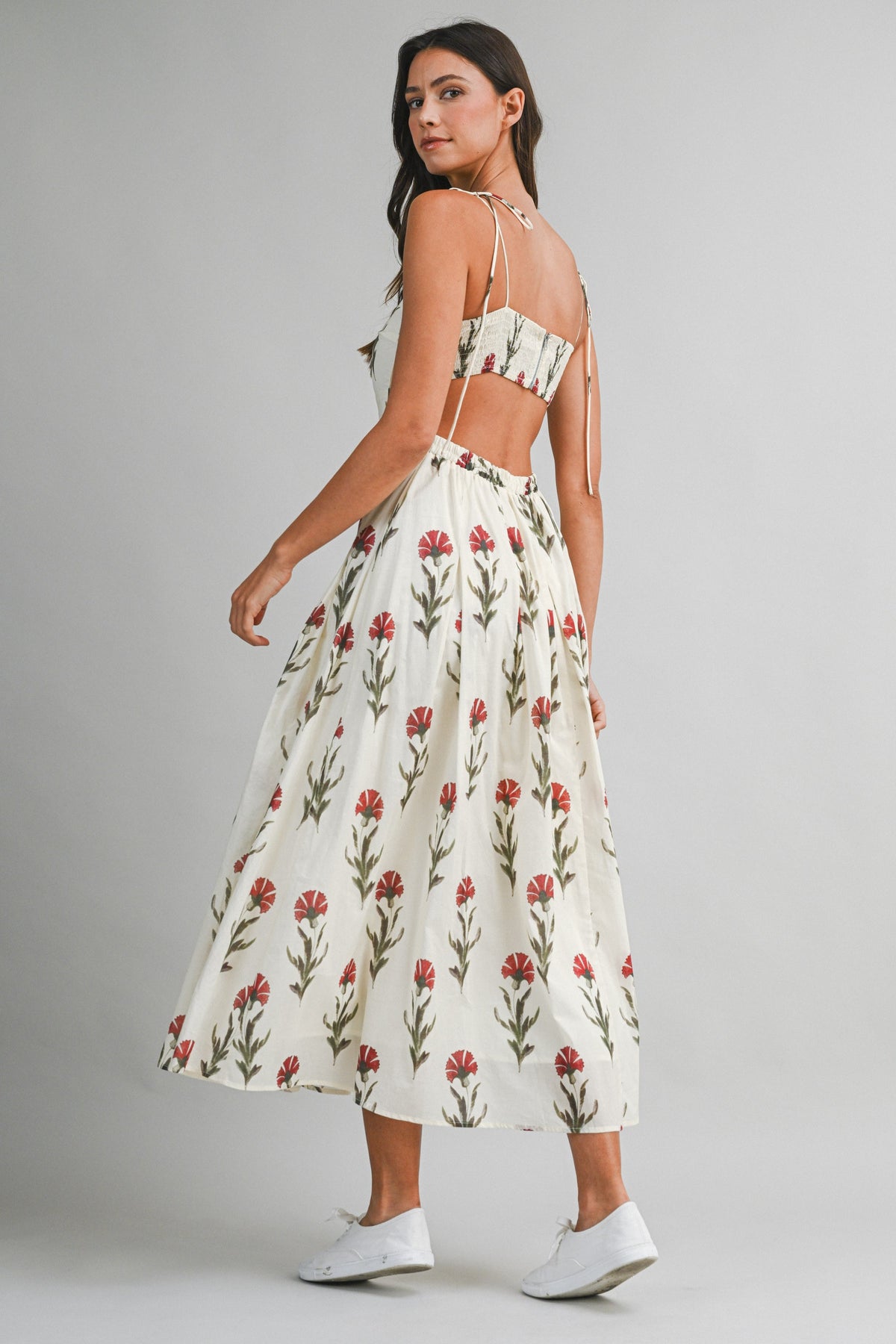 Our Vineyard Dress is beautiful and breezy! Features a floral block print, smocked cut-out back and adjustable skinny straps. Midi length. Lined. Styled with our City Chic Flats.