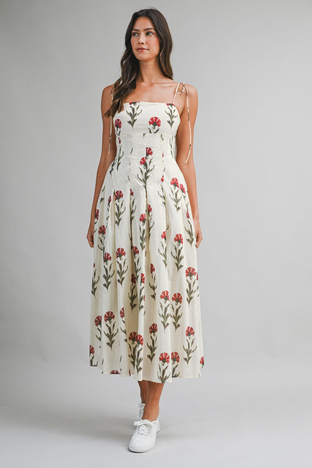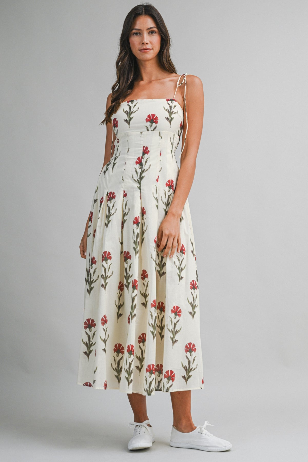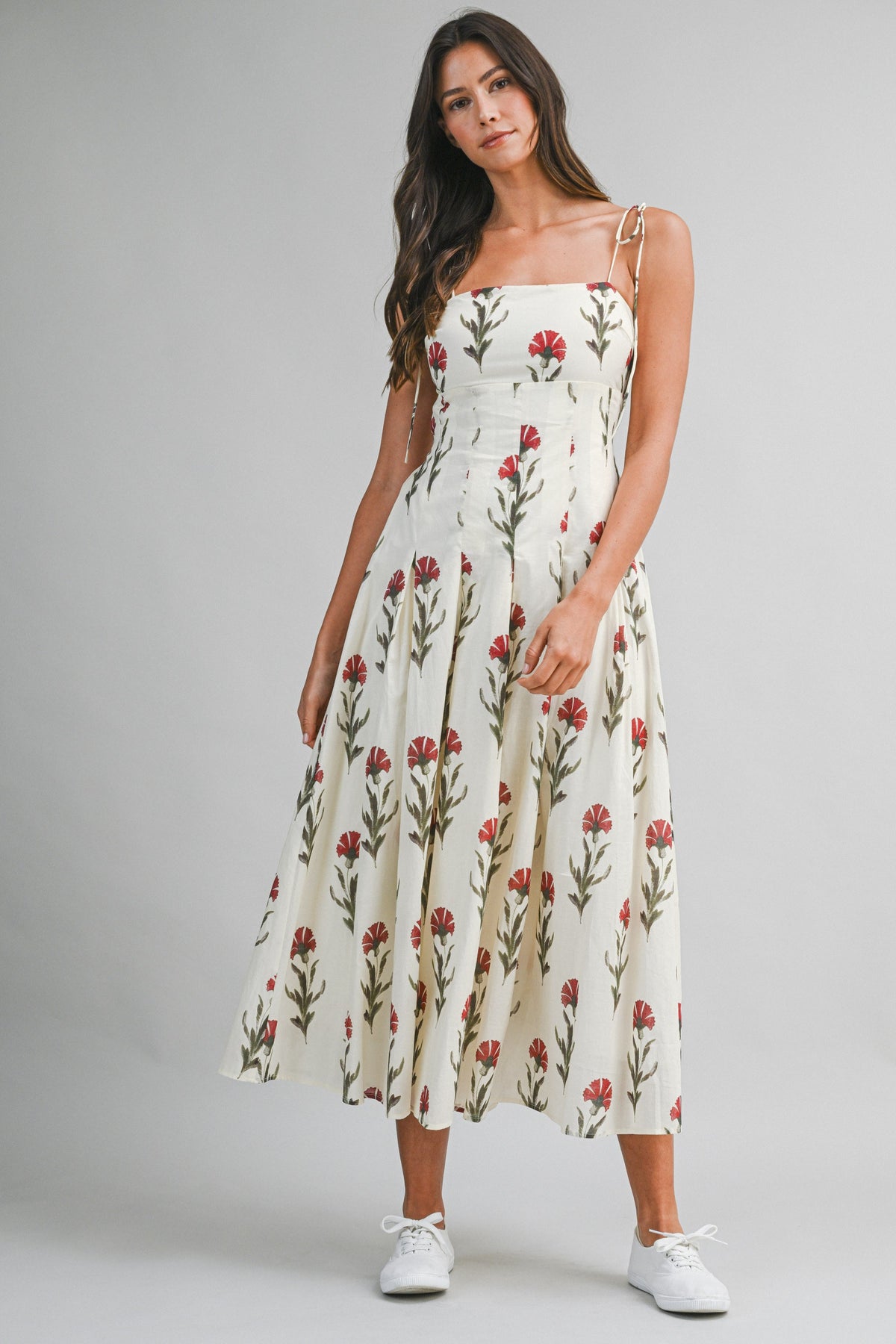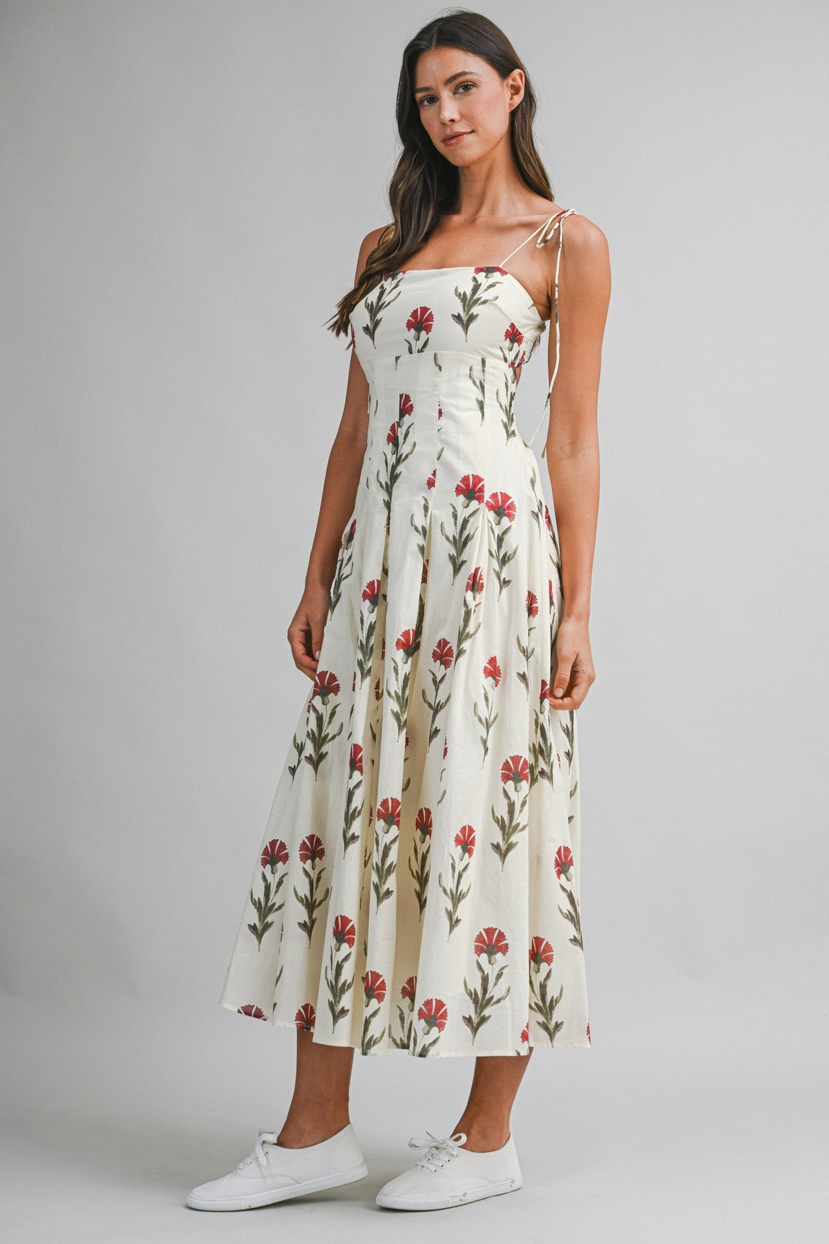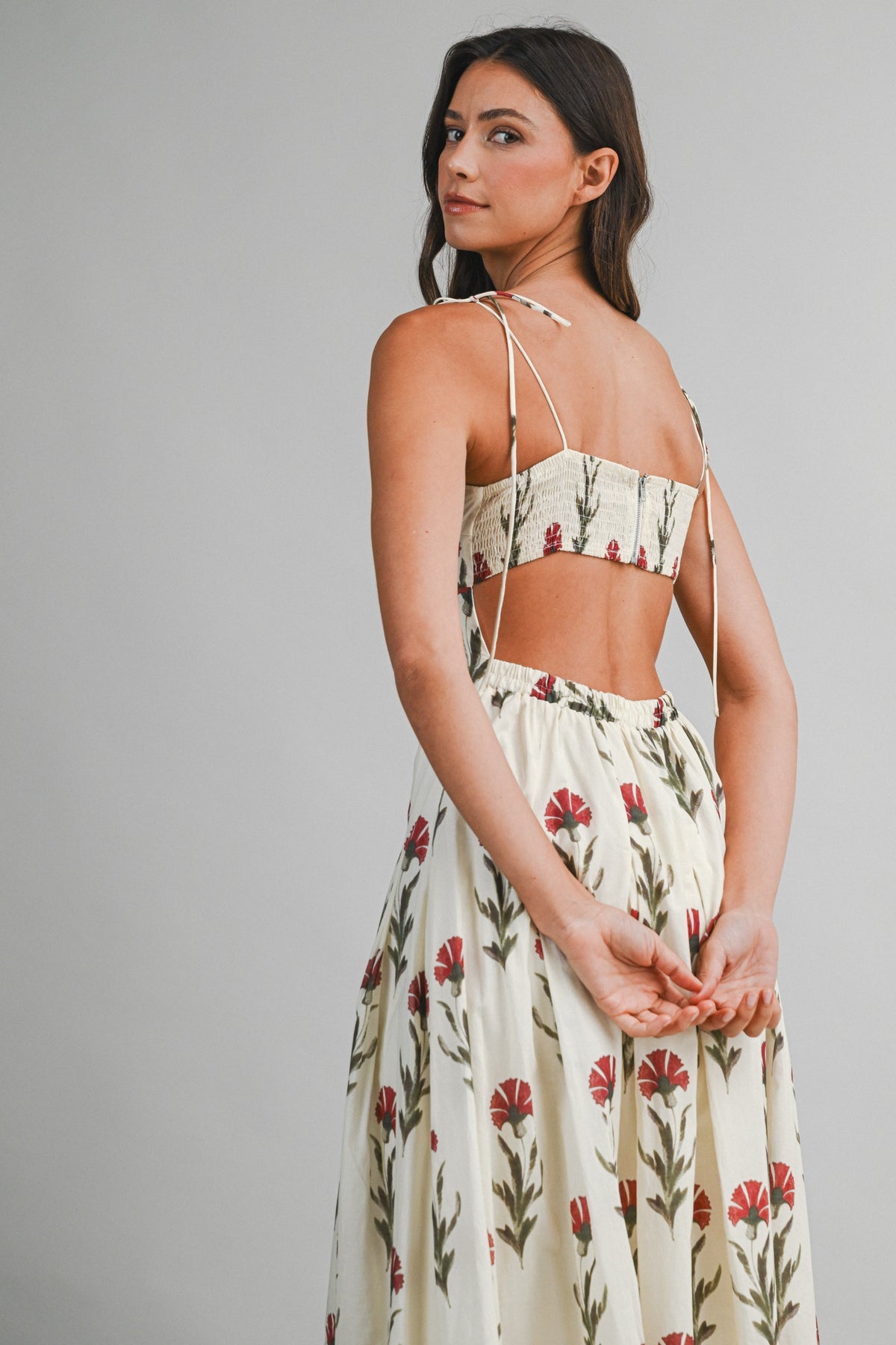 Our Vineyard Dress is beautiful and breezy! Features a floral block print, smocked cut-out back and adjustable skinny straps. Midi length. Lined. Styled with our City Chic Flats.