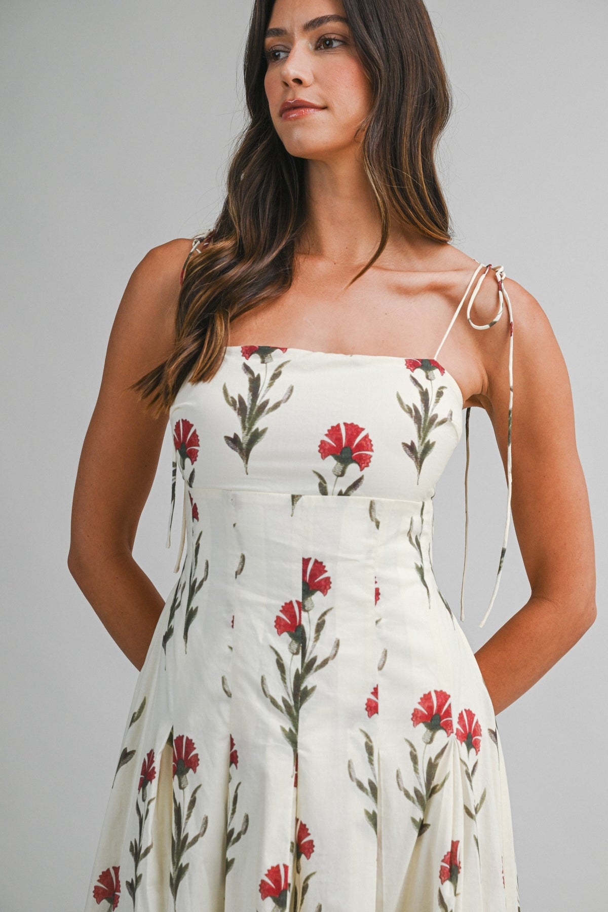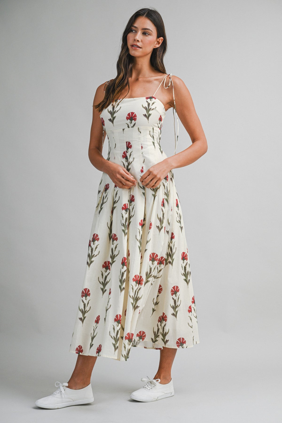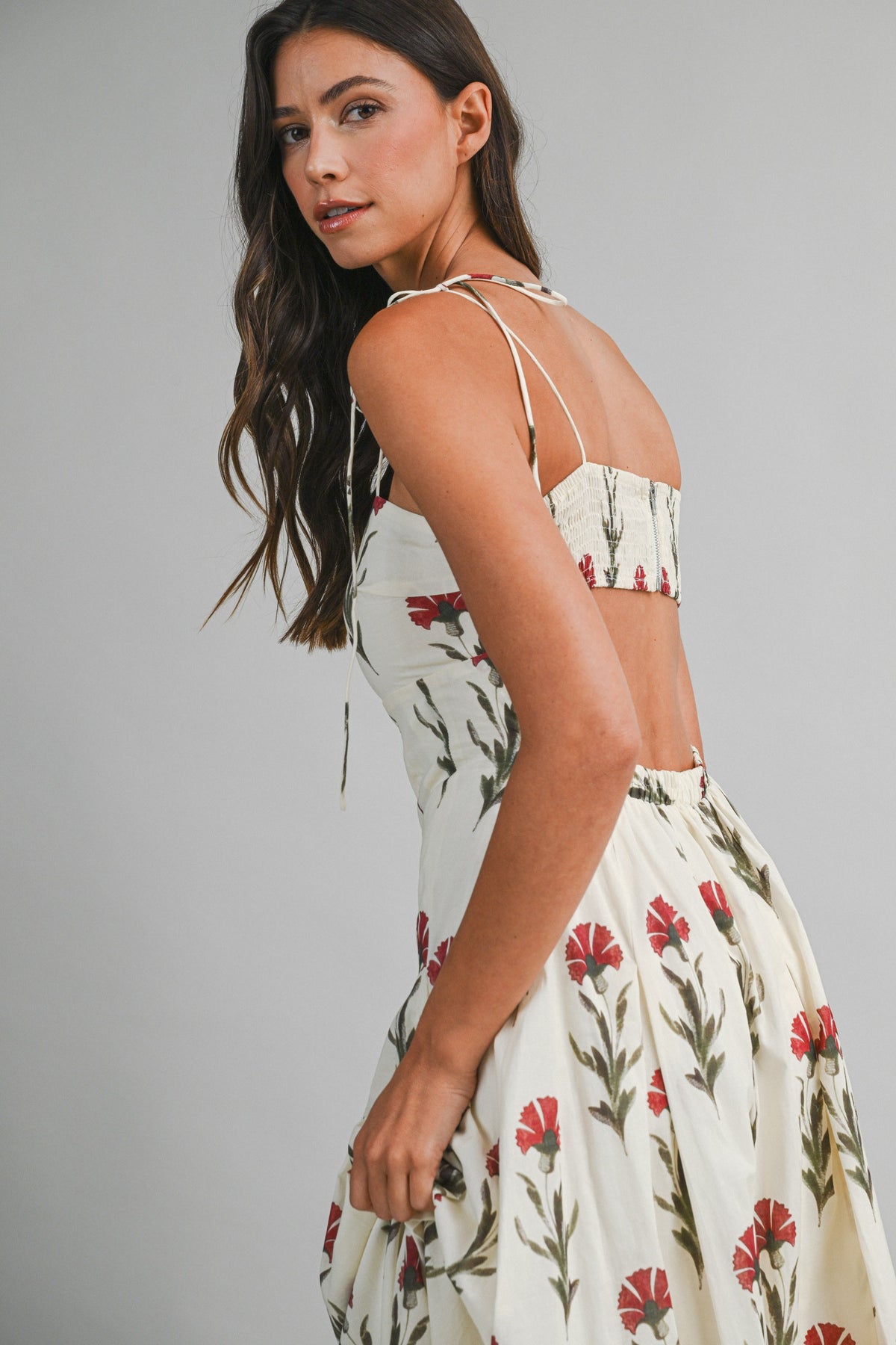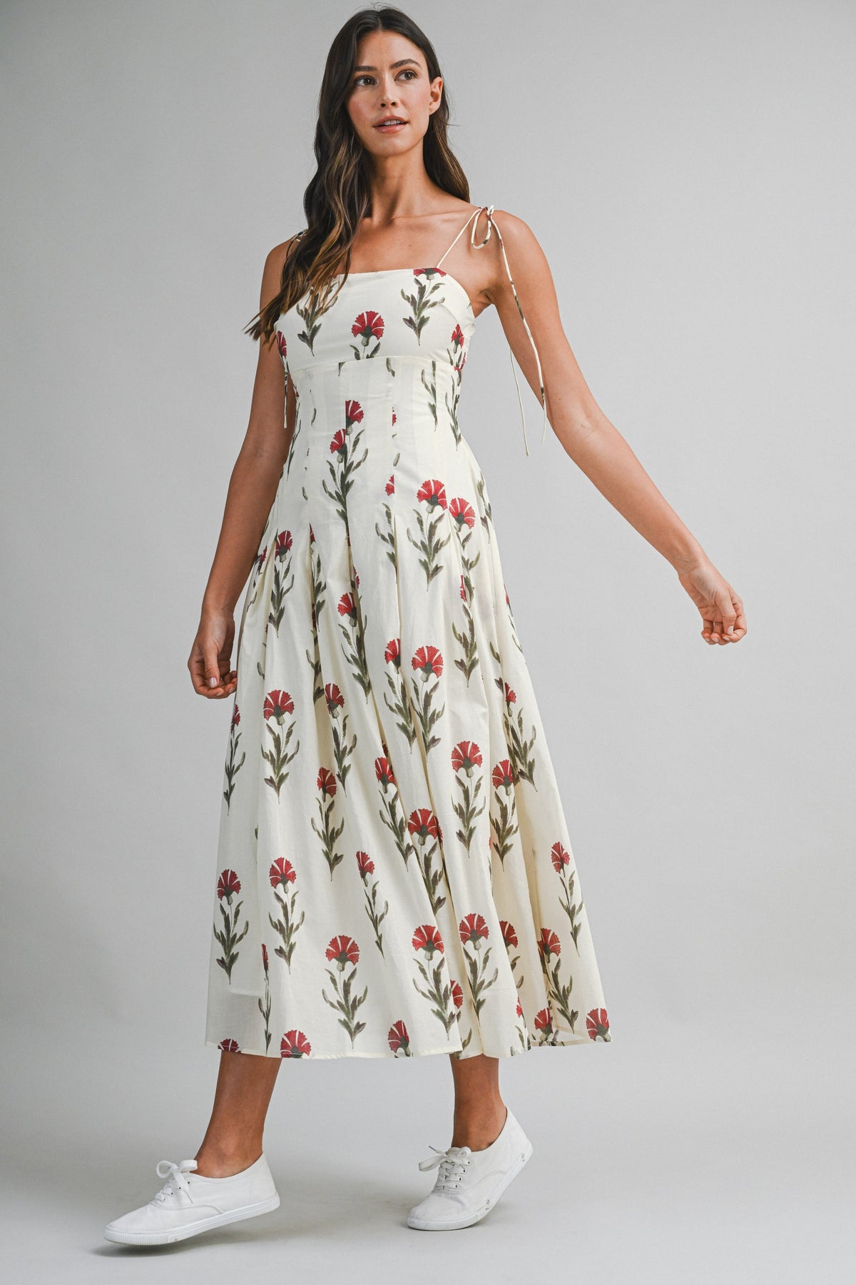 Our Vineyard Dress is beautiful and breezy! Features a floral block print, smocked cut-out back and adjustable skinny straps. Midi length. Lined. Styled with our City Chic Flats.