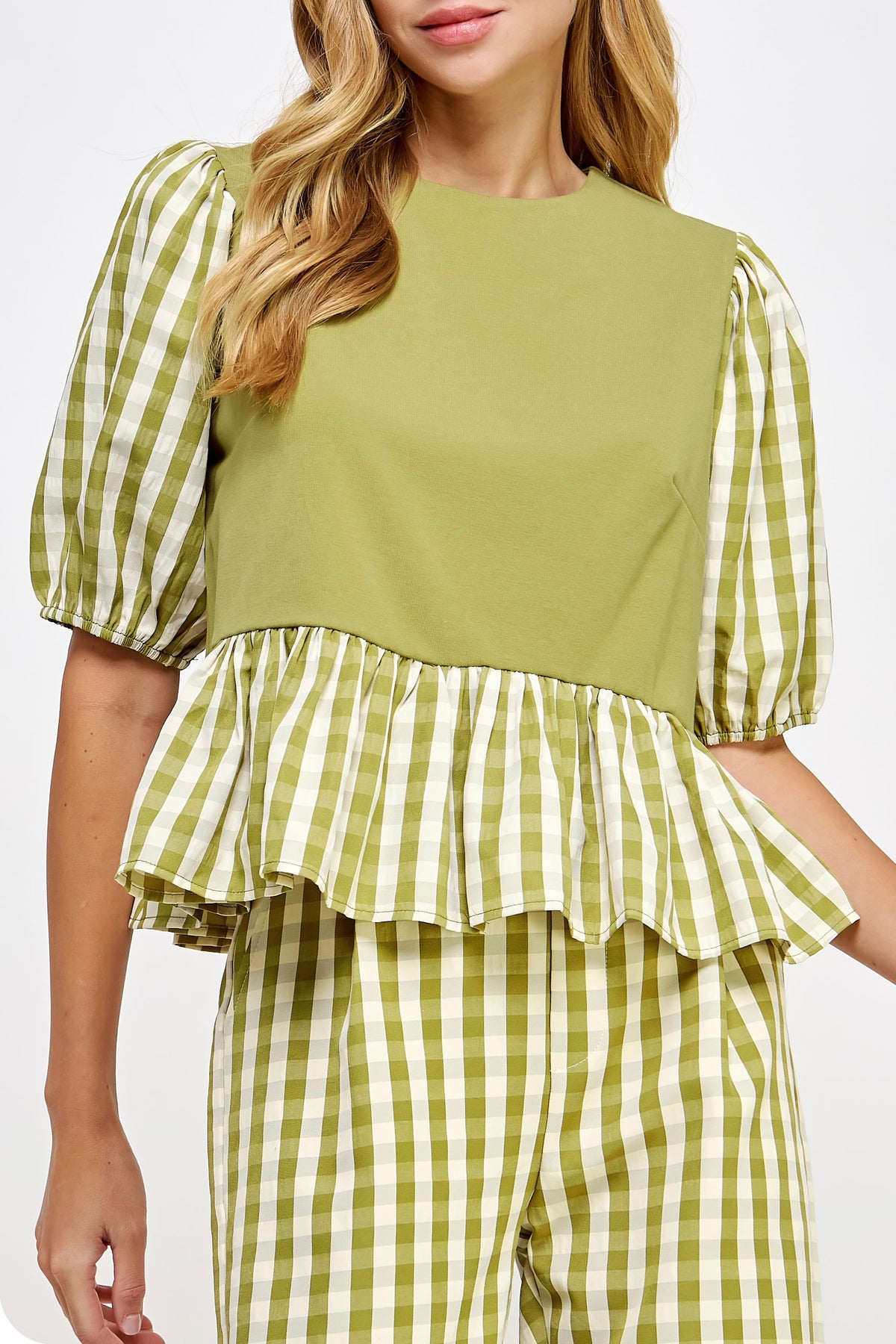 We adore this little "two-fer" top! Features a knit cotton-blend body with complimentary gingham bubble sleeves and ruffle hem. Keyhole opening in back is finished with a matching butto. Styled with our Attractive Barrel Jean and Vivian Loafer Slide.