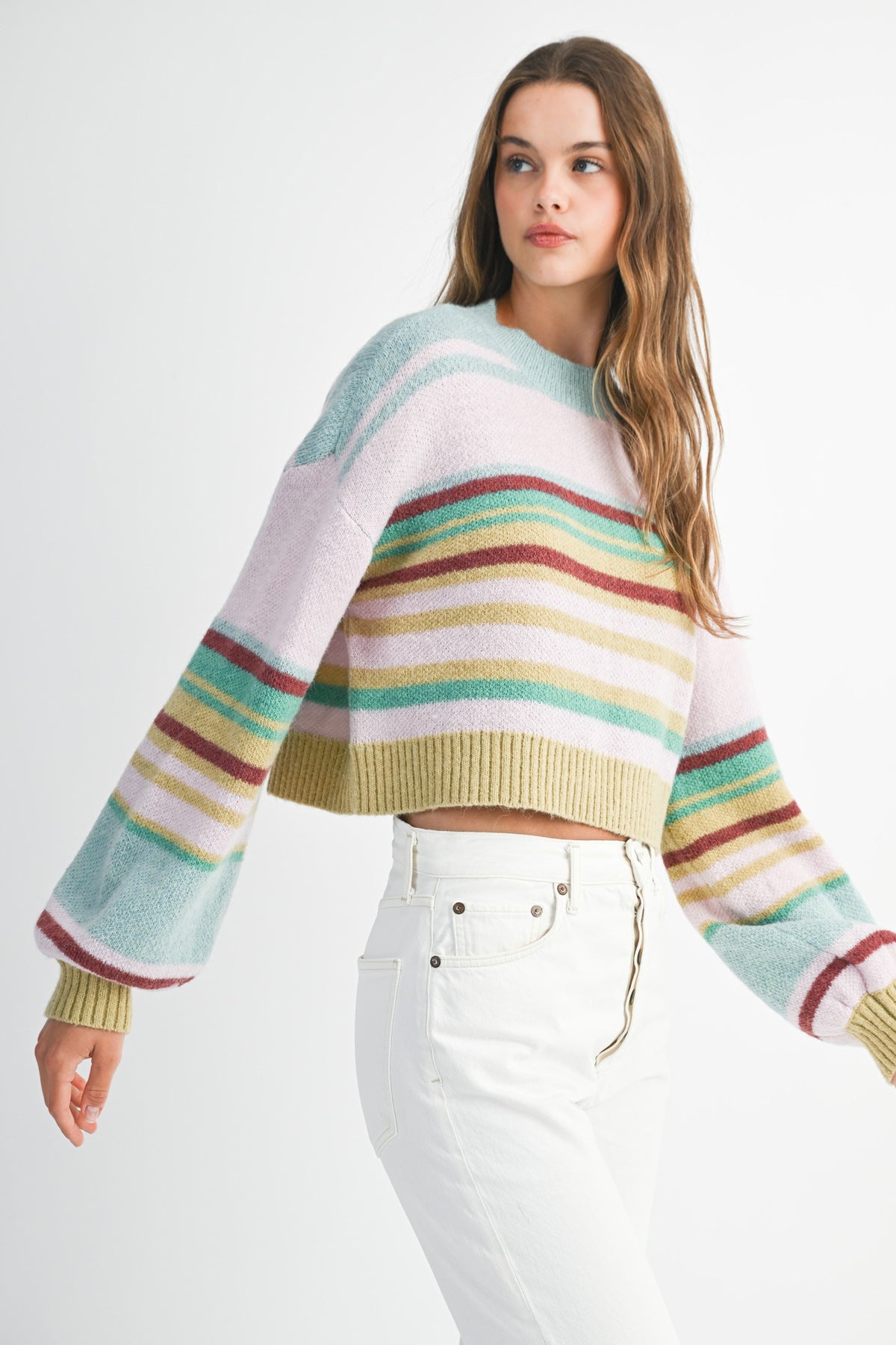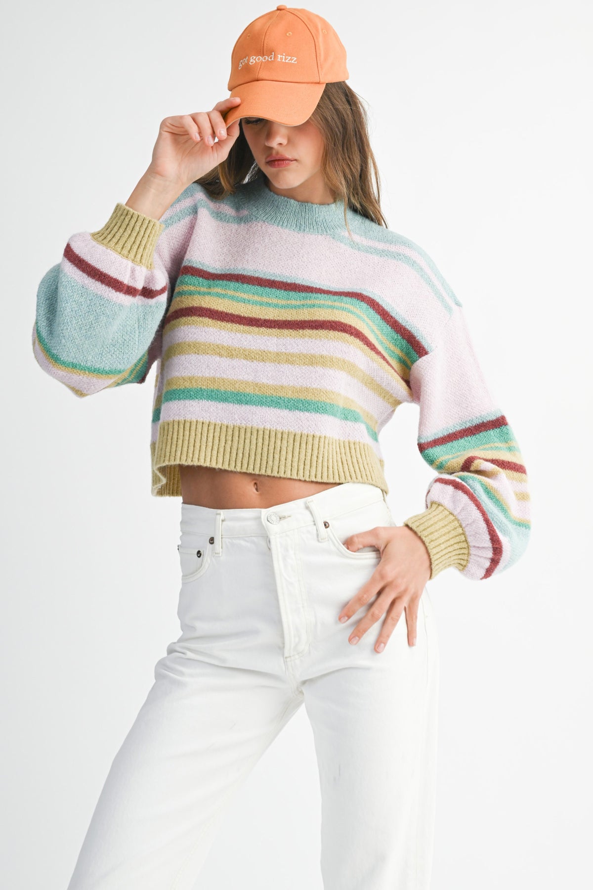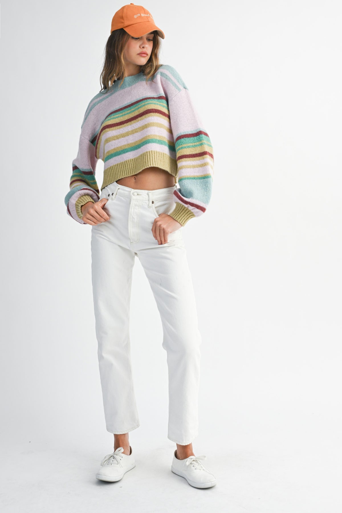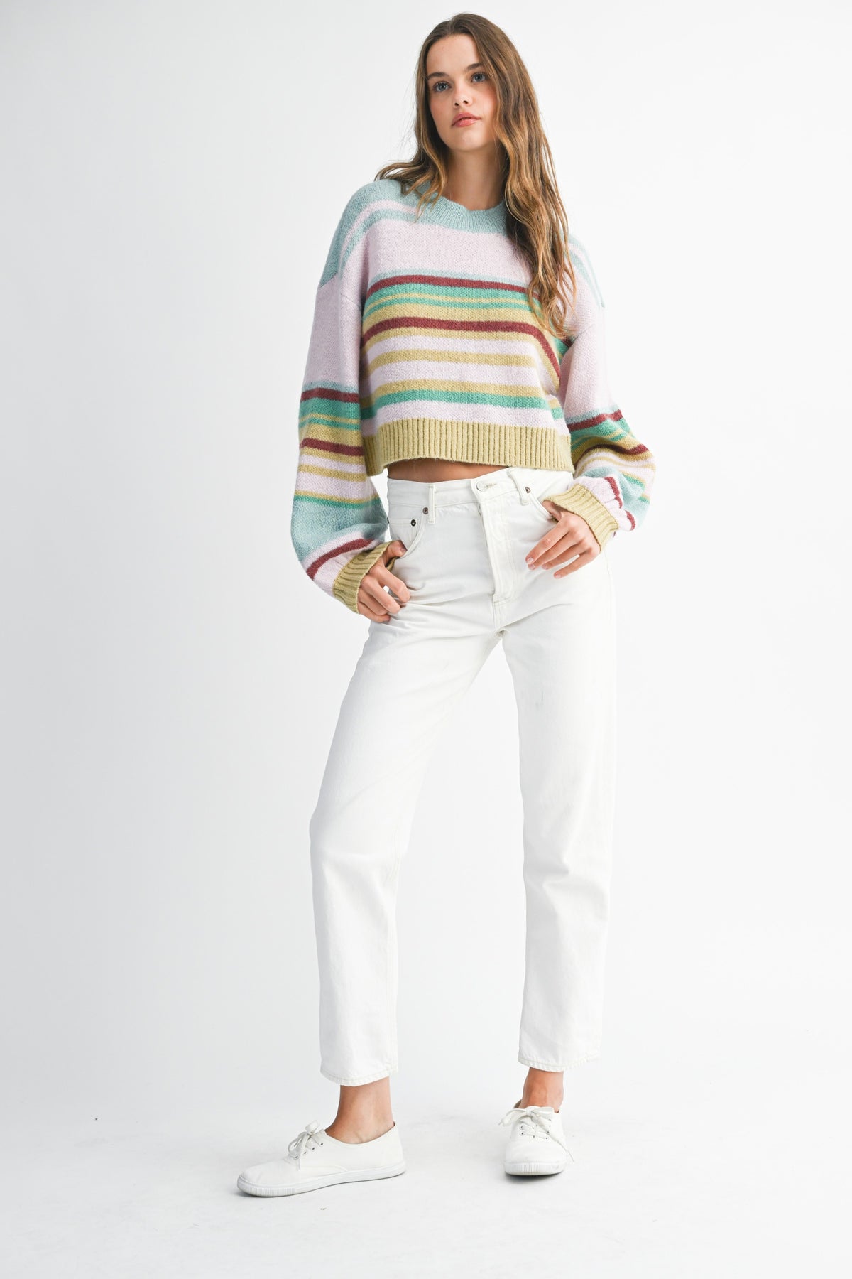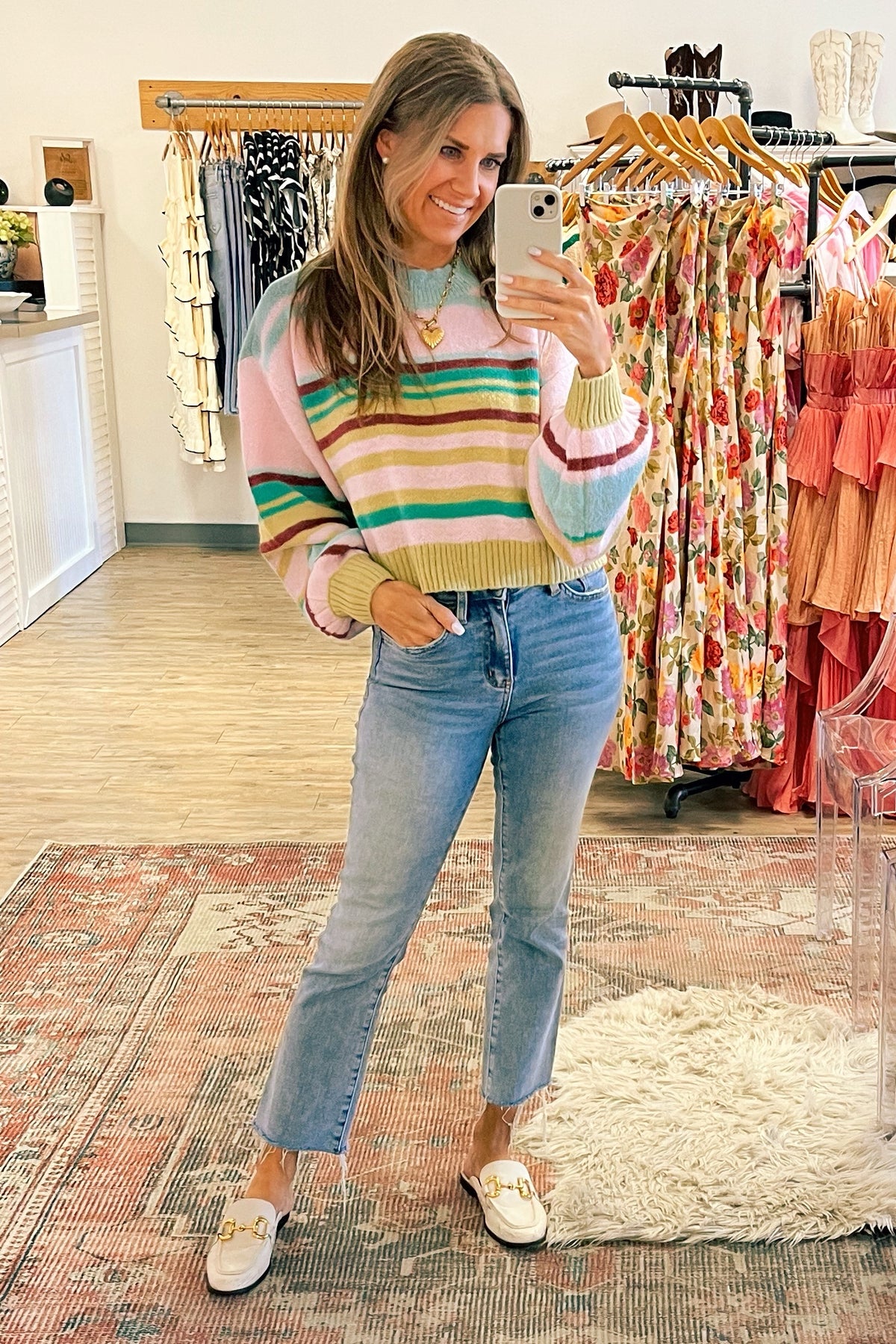 Our Brewster Sweater features multicolor stripes, contrasting bands at the neck, sleeves and hem and a boxy fit. Slightly cropped length. Stripes are mint, baby pink, maroon, aqua and taupe. Styled with our Waiting Kick-Flare Jean and Vivian Loafer Slide.