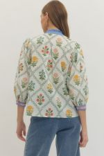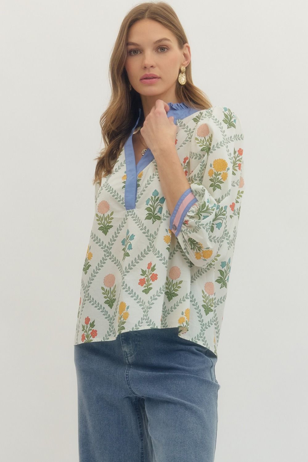 What a fresh little top! Our Cynthia Top features a ruffled stand-up collar, v-neckline and cheery floral print. Bracelet-length sleeves feature contrasting bands. One snap at the v-neckline ensures no wardrobe malfunctions ;) Styled with our Madge Denim Skort and City Chic Flat.