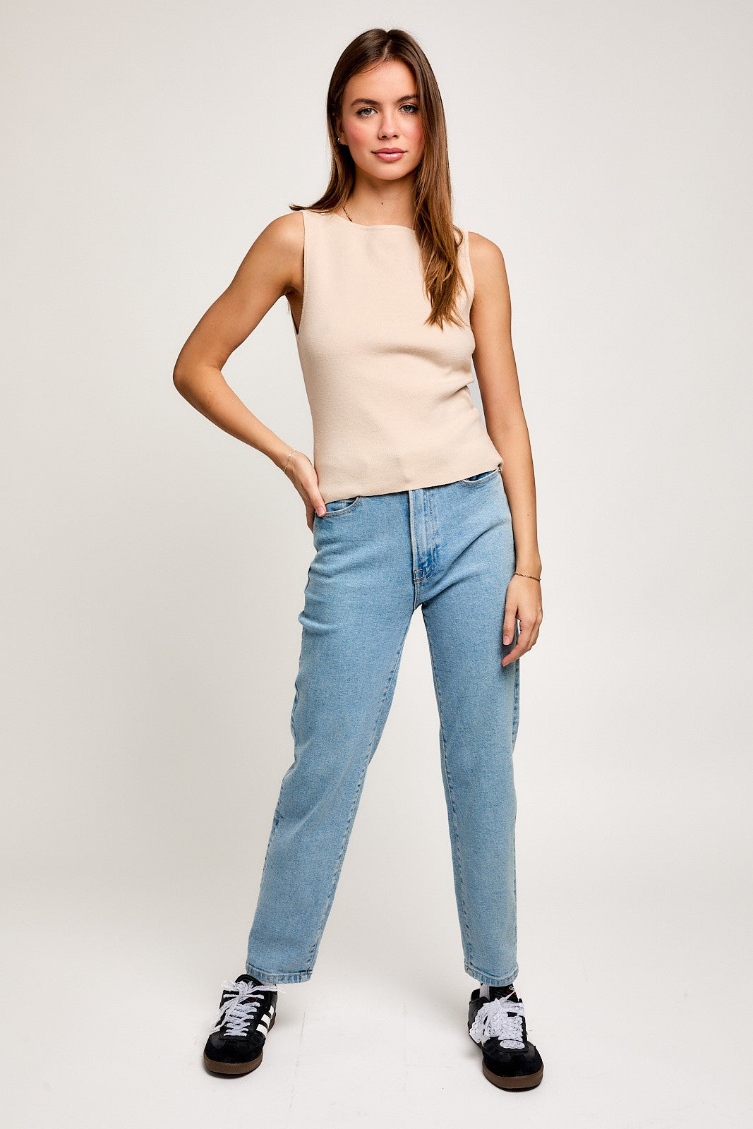 Our knit Emily Top is a great basic - pair this cutie with jeans, a denim skirt or leather shorts. Boat neck. Sleeveless. Full length. Styled with our XL Heart Necklace, Waiting Kick-Flare Jean and  Manila Sandal.