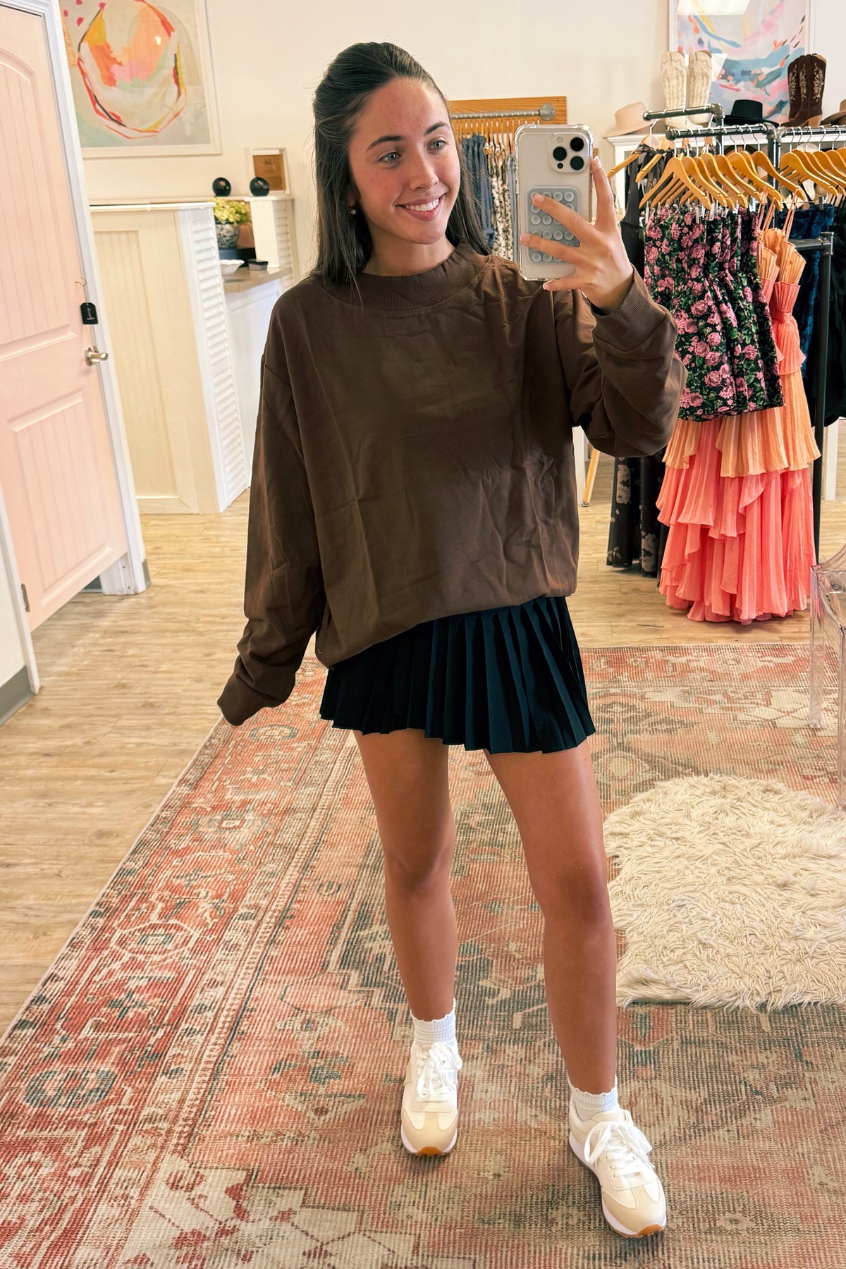 Oversized sweatshirt featuring a funnel neck and contrasting bands at the sleeves and hem. Styled with our Mixed Doubles Tennis Skirt and Poetry Sneaker.