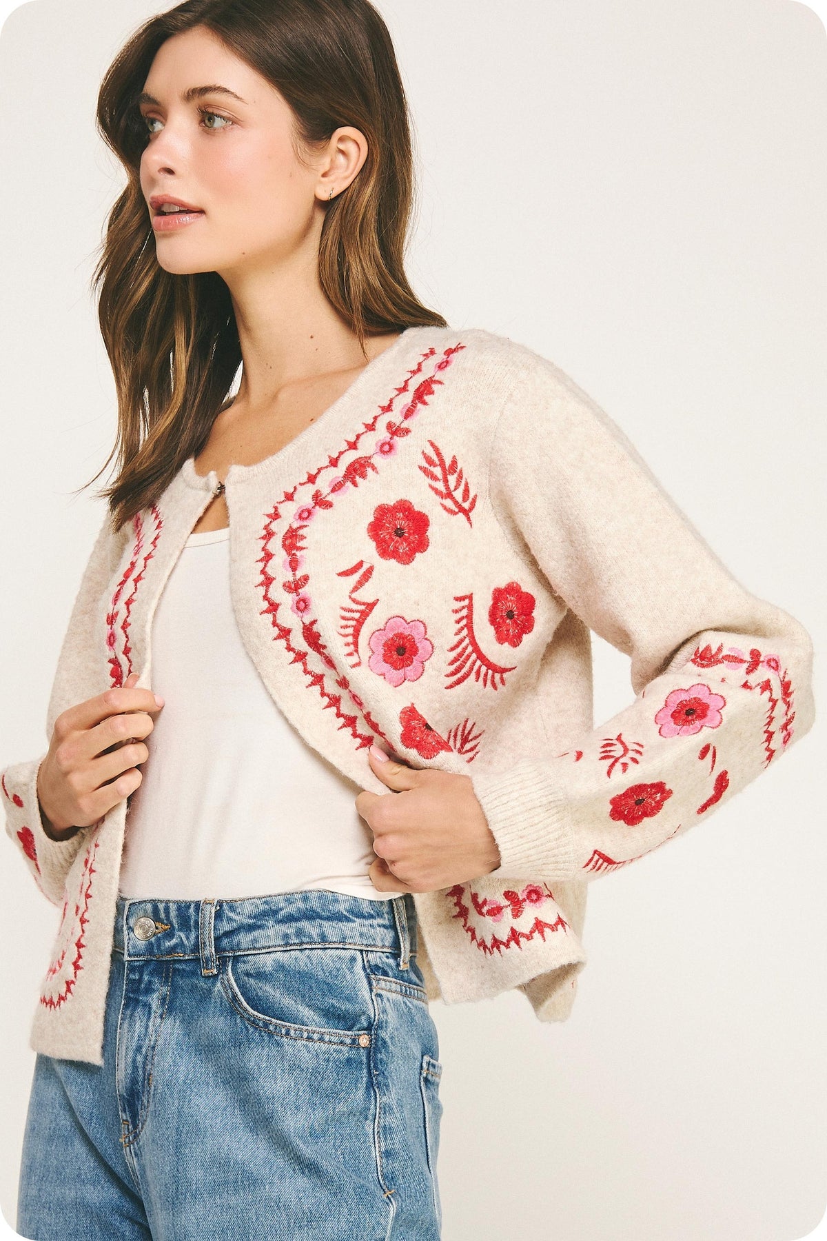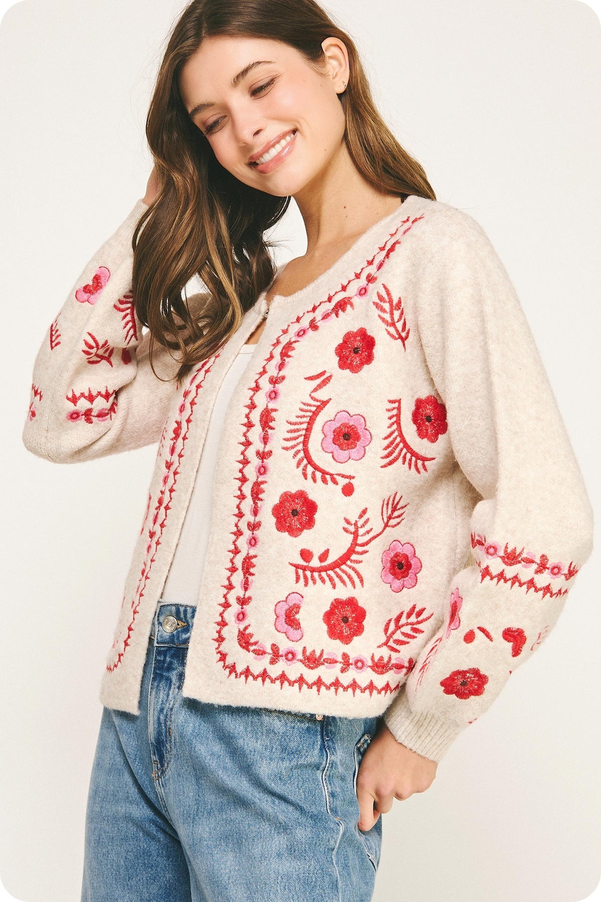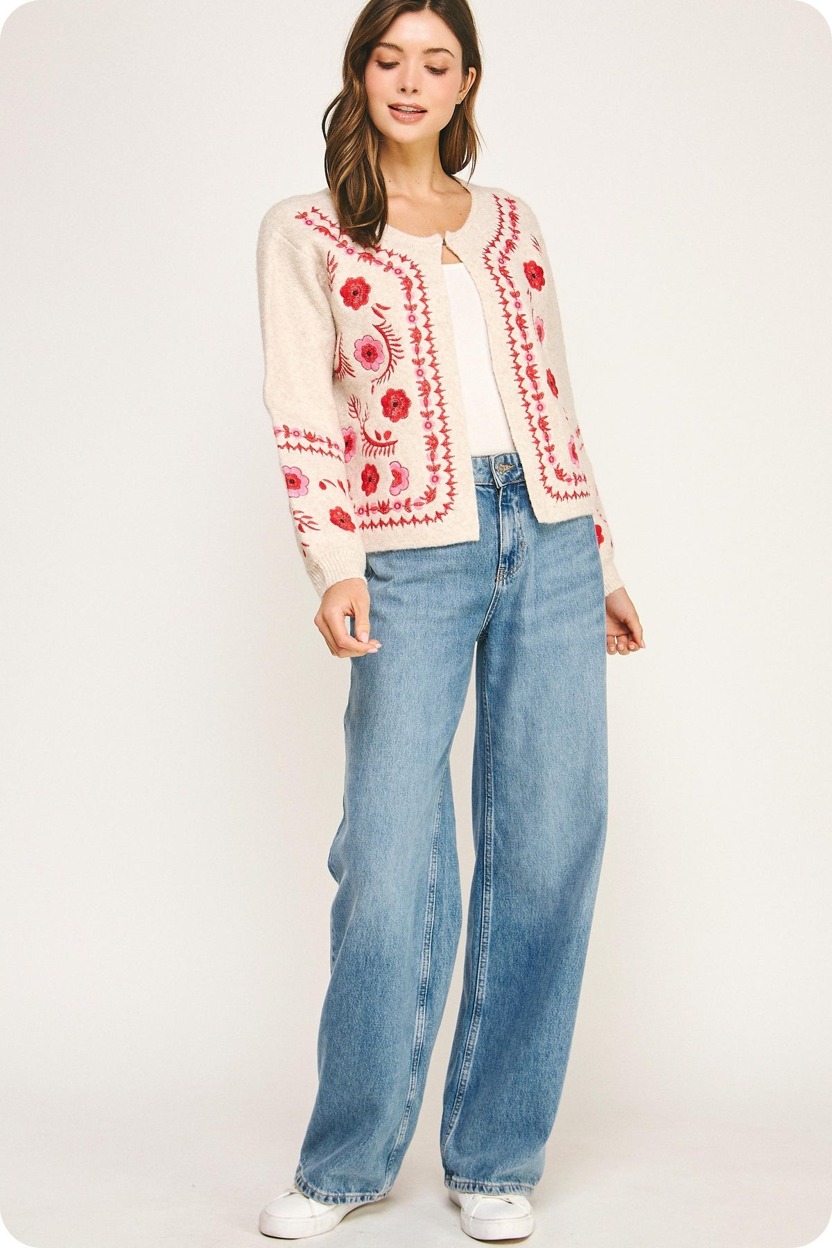 Embroidered sweater jacket featuring a hook-and-eye closure at the neck. Gorgeous pink and red embroidery on a cream melange background. Styled with our Attractive Barrel Jean and Vivian Loafer Slide.