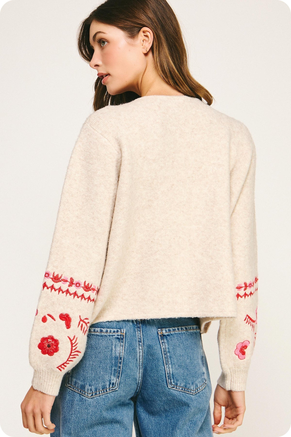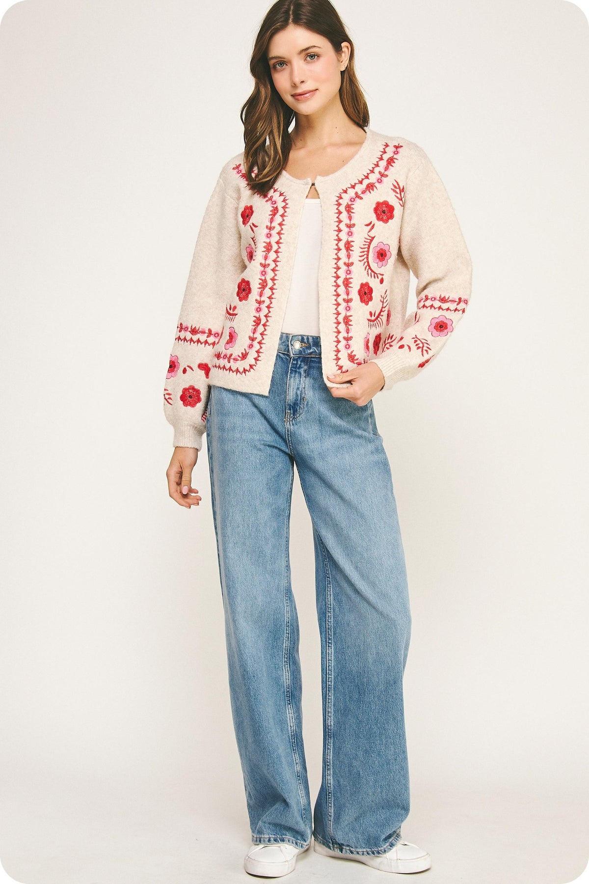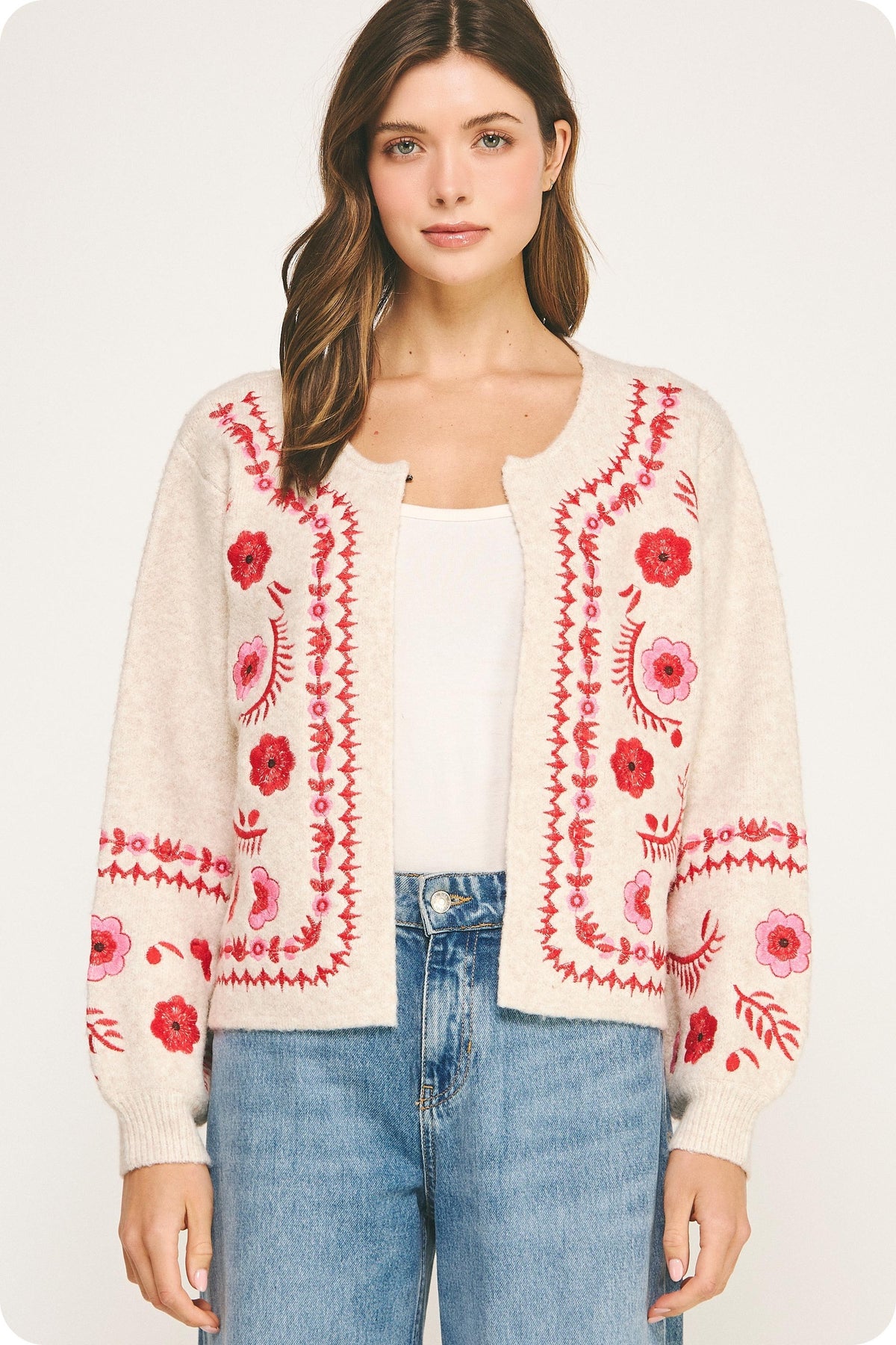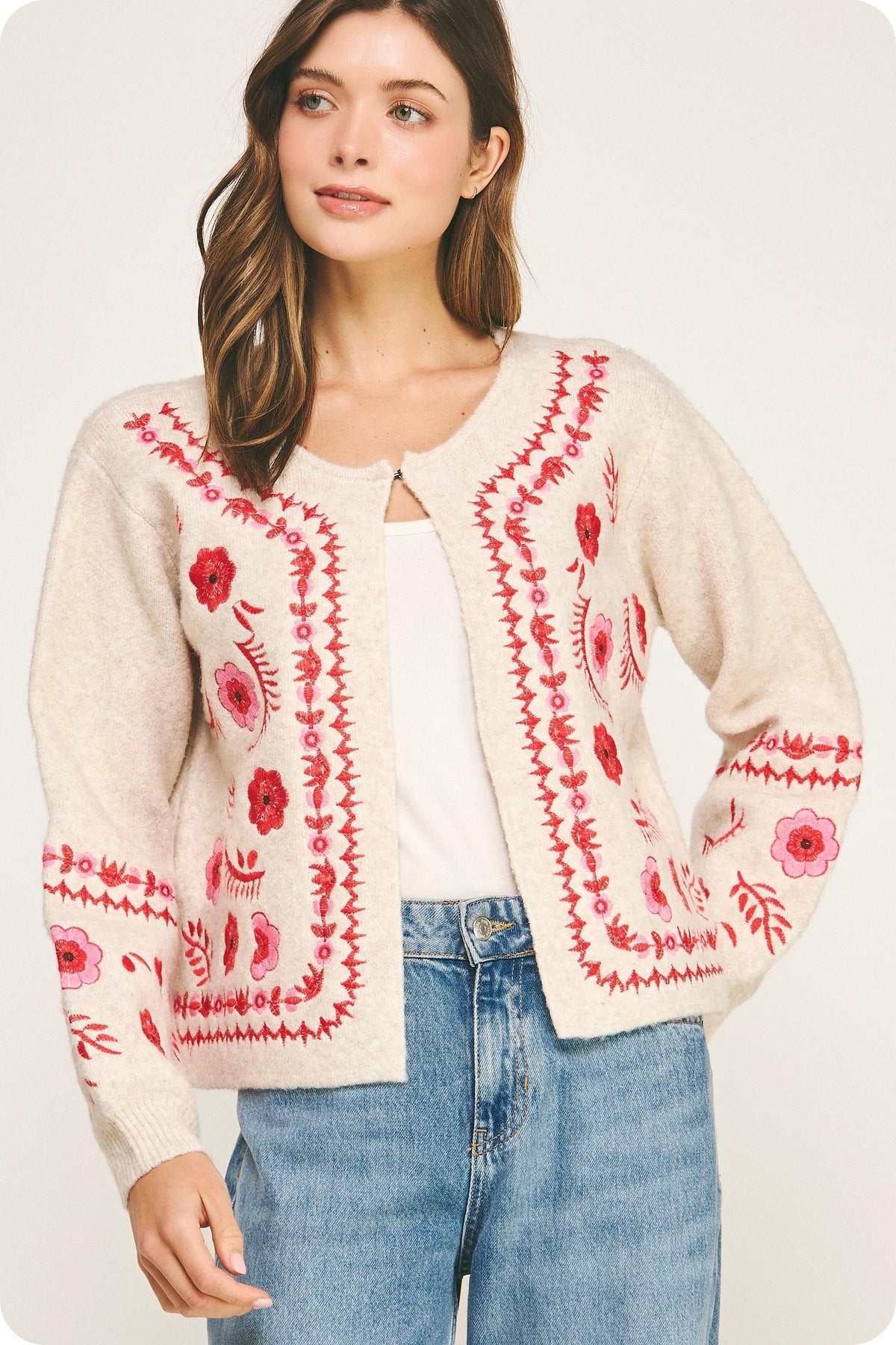 Embroidered sweater jacket featuring a hook-and-eye closure at the neck. Gorgeous pink and red embroidery on a cream melange background. Styled with our Attractive Barrel Jean and Vivian Loafer Slide.