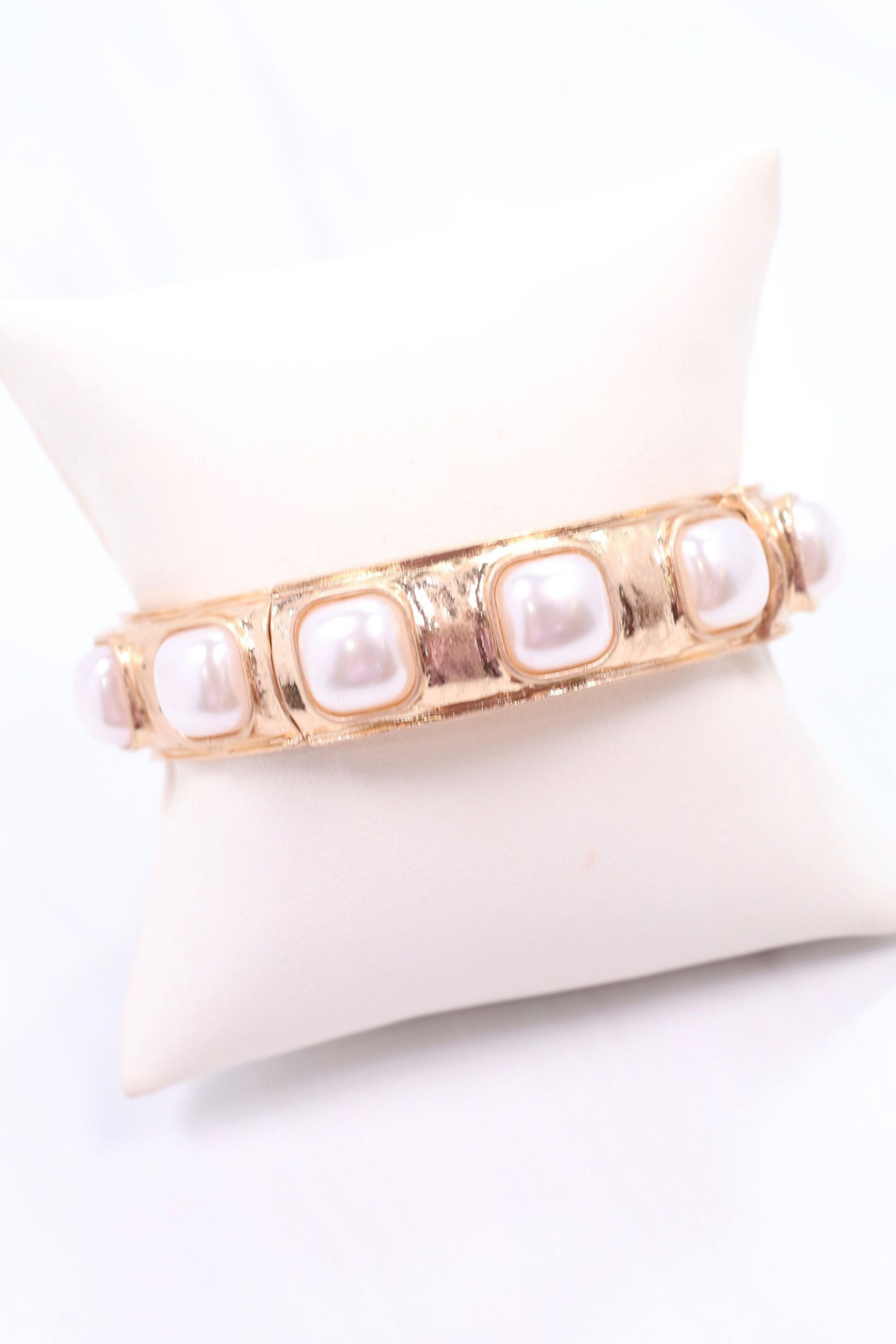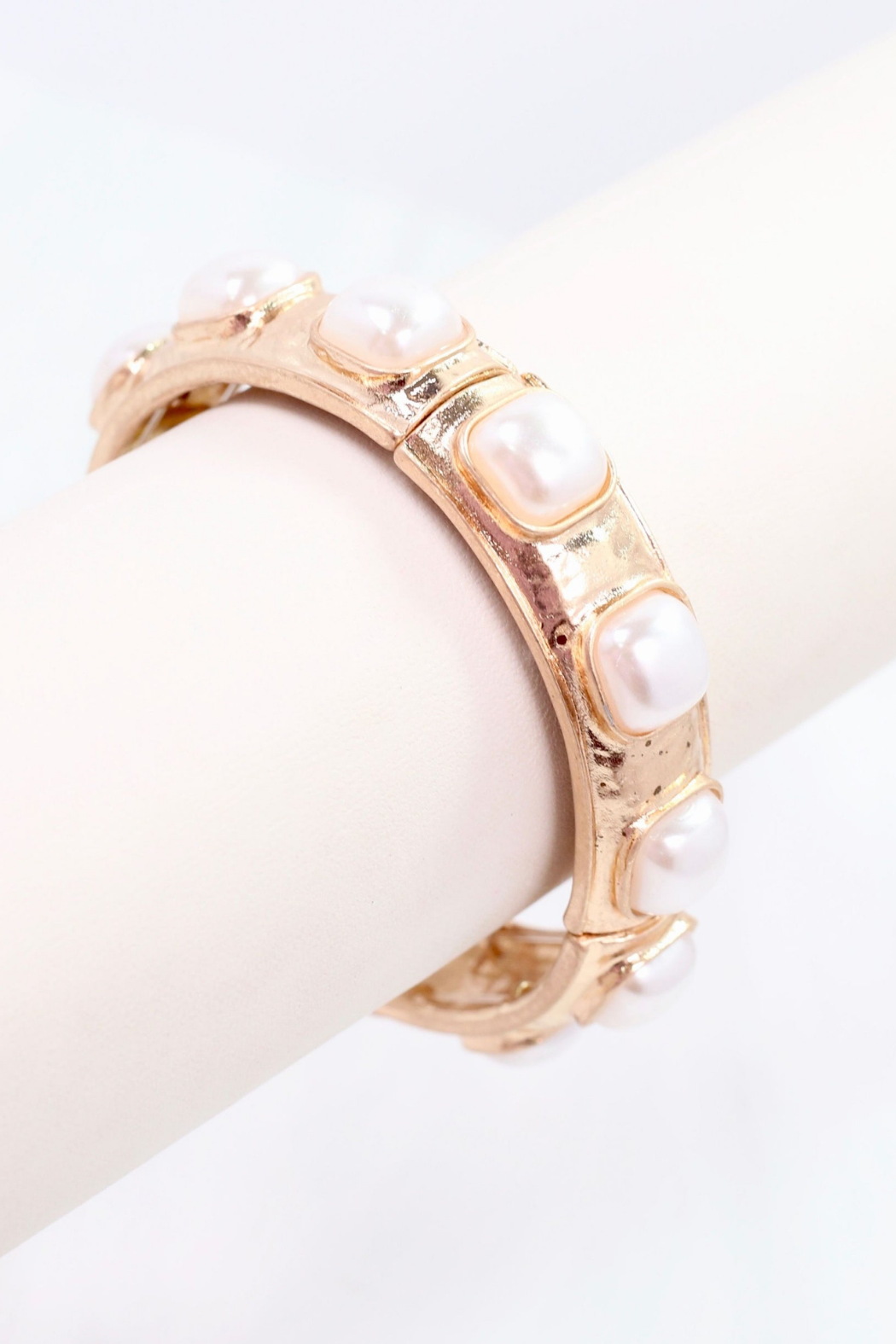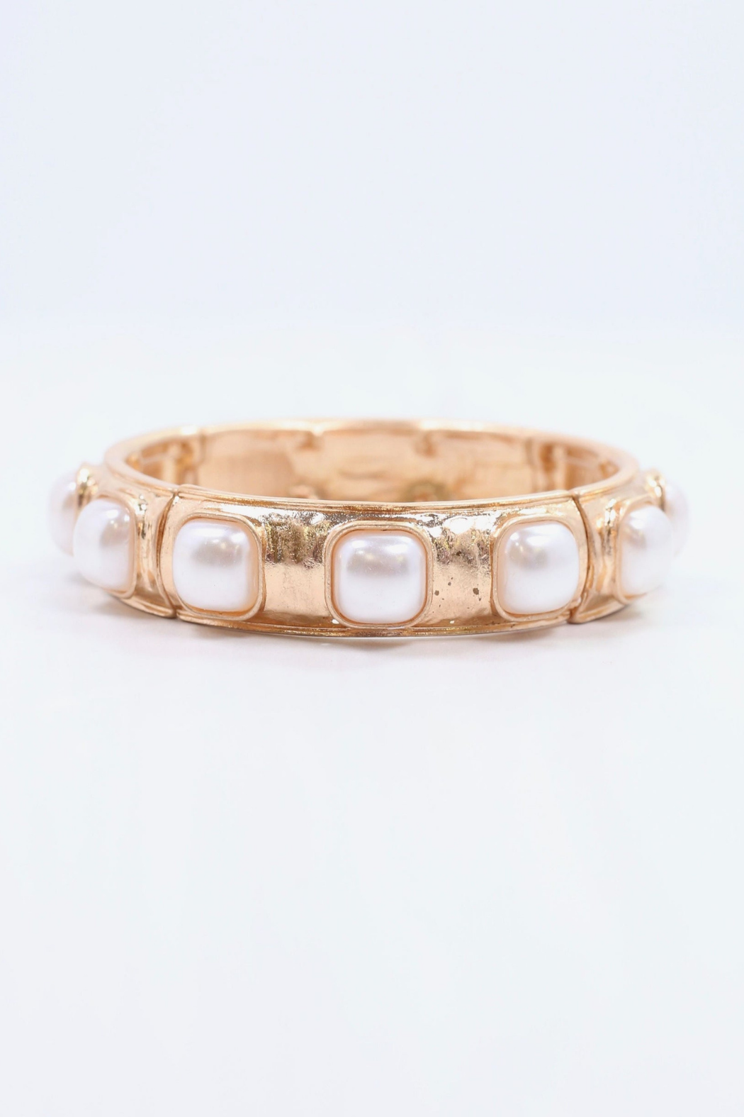 Introducing the perfect addition to your stack: the Allie Bracelet. This versatile piece features a hammered worn gold design with square pearls, making it perfect for year round wear. Its stretch style ensures a comfortable fit for most wrists. Layer it with other pieces for a stylish, on-trend look, or wear this stunner alone.