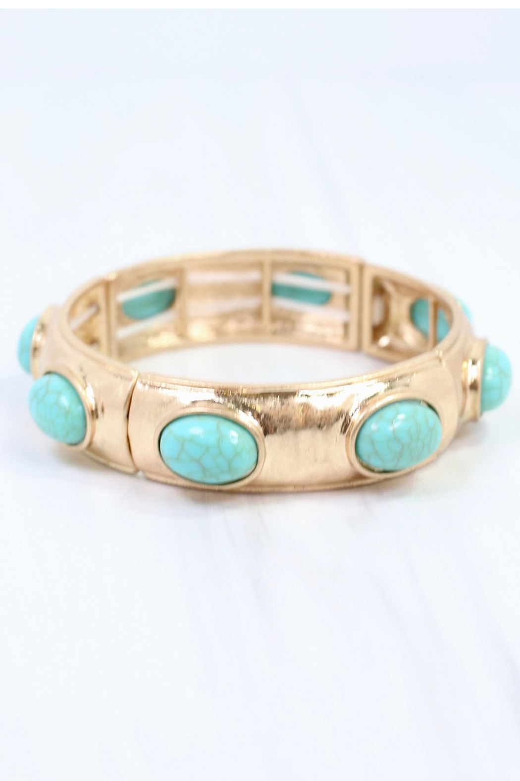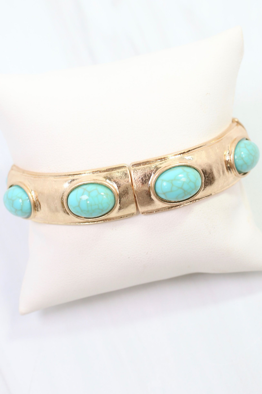 Add an elegant touch to your look with the Hallie Stretch Bracelet. This gold hammered bangle features elegant oval turquoise stones, creating a striking pop of color. Its flexible stretch design ensures a comfortable fit.