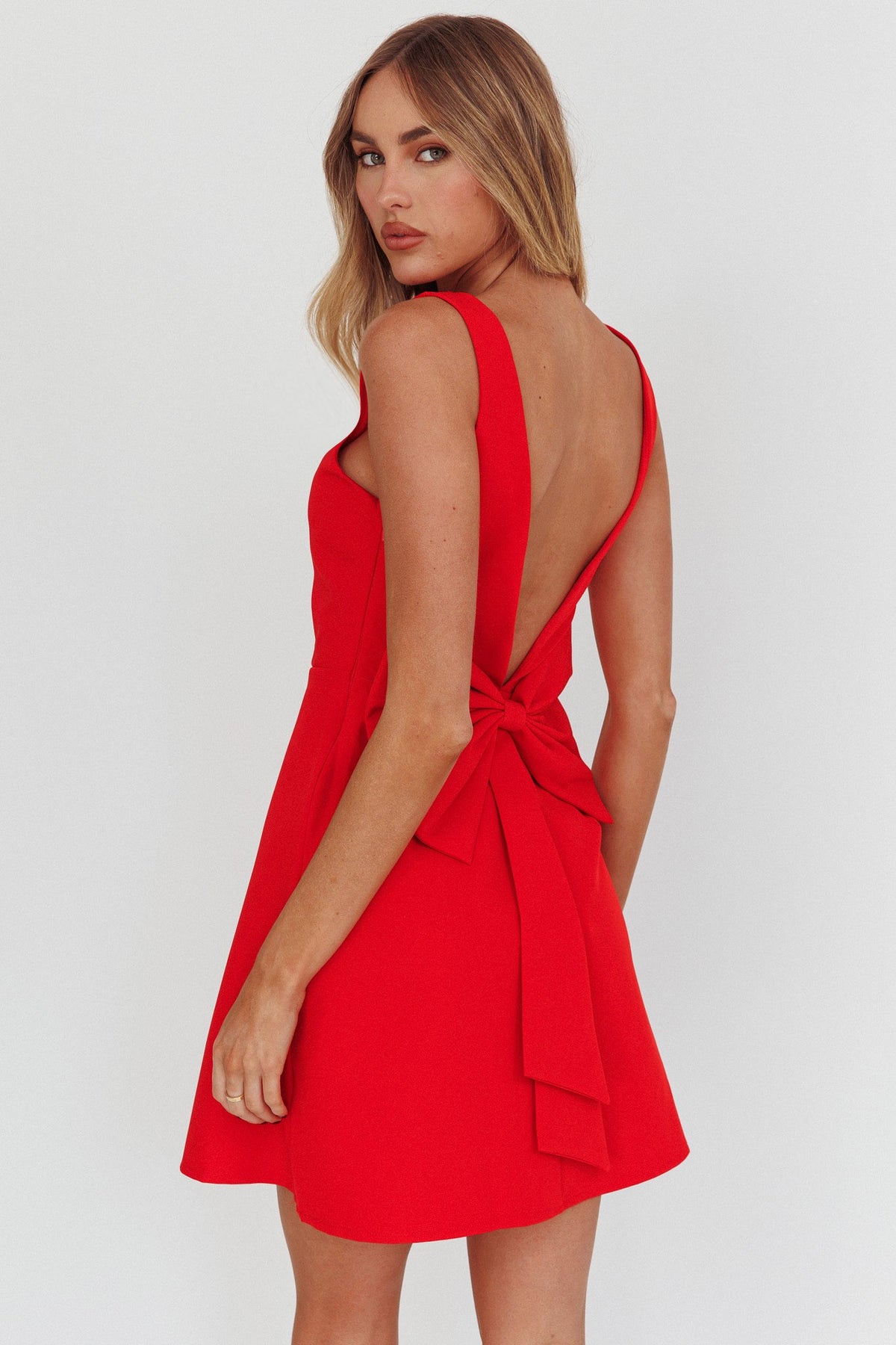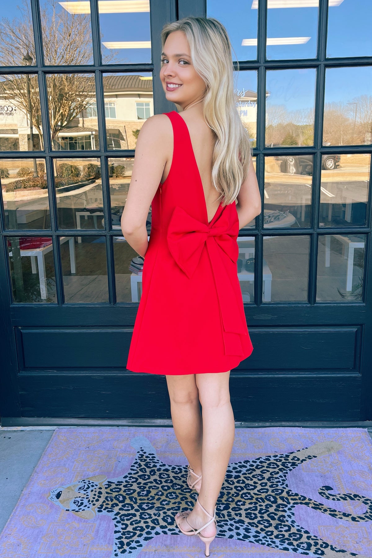 Bring the drama in ourSkipper Dress. Features a crew neck in front and super-low back with an oversized bow. Sleeveless. Hidden side zipper. Lined. Styled with our Dovie Strappy Sandal.