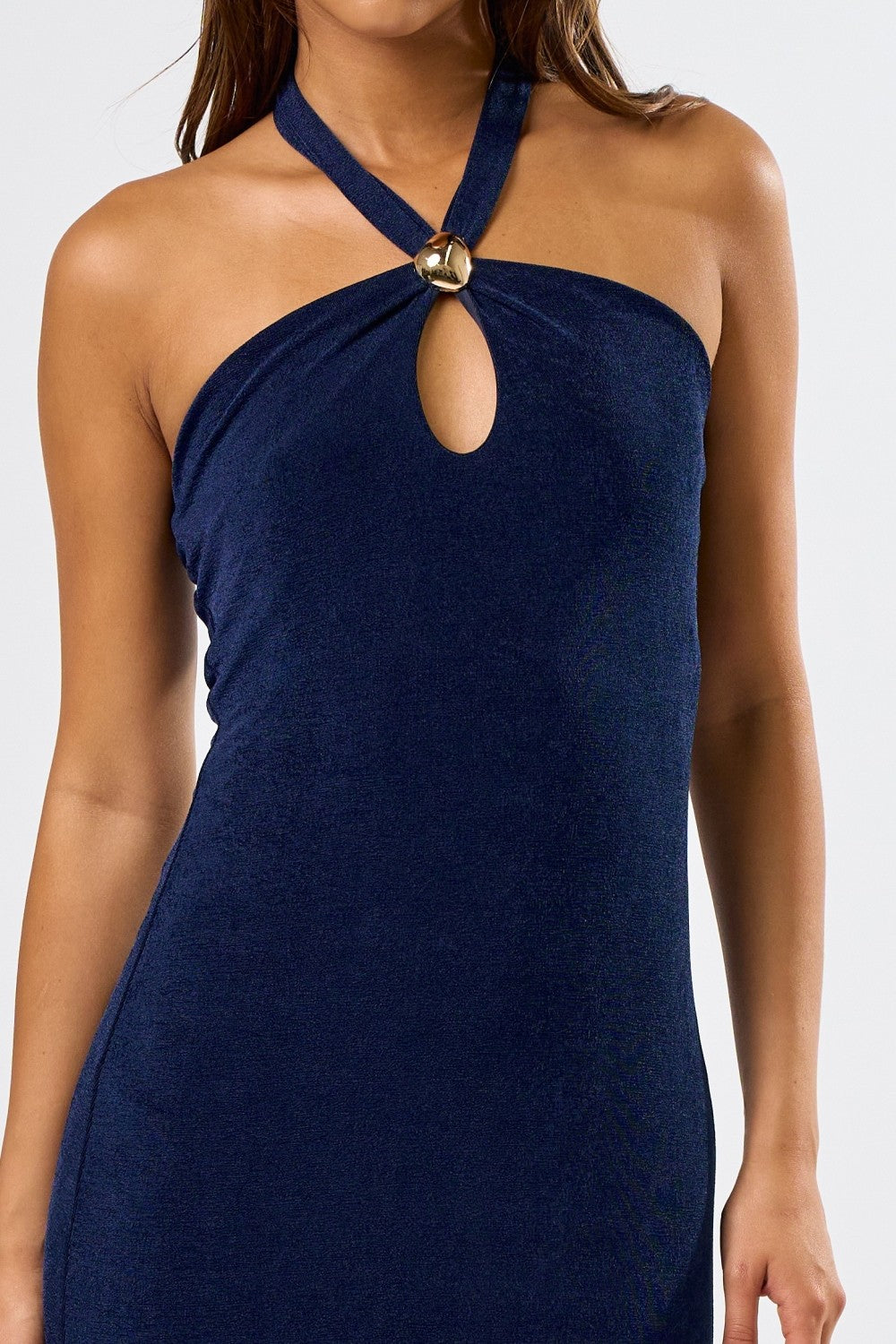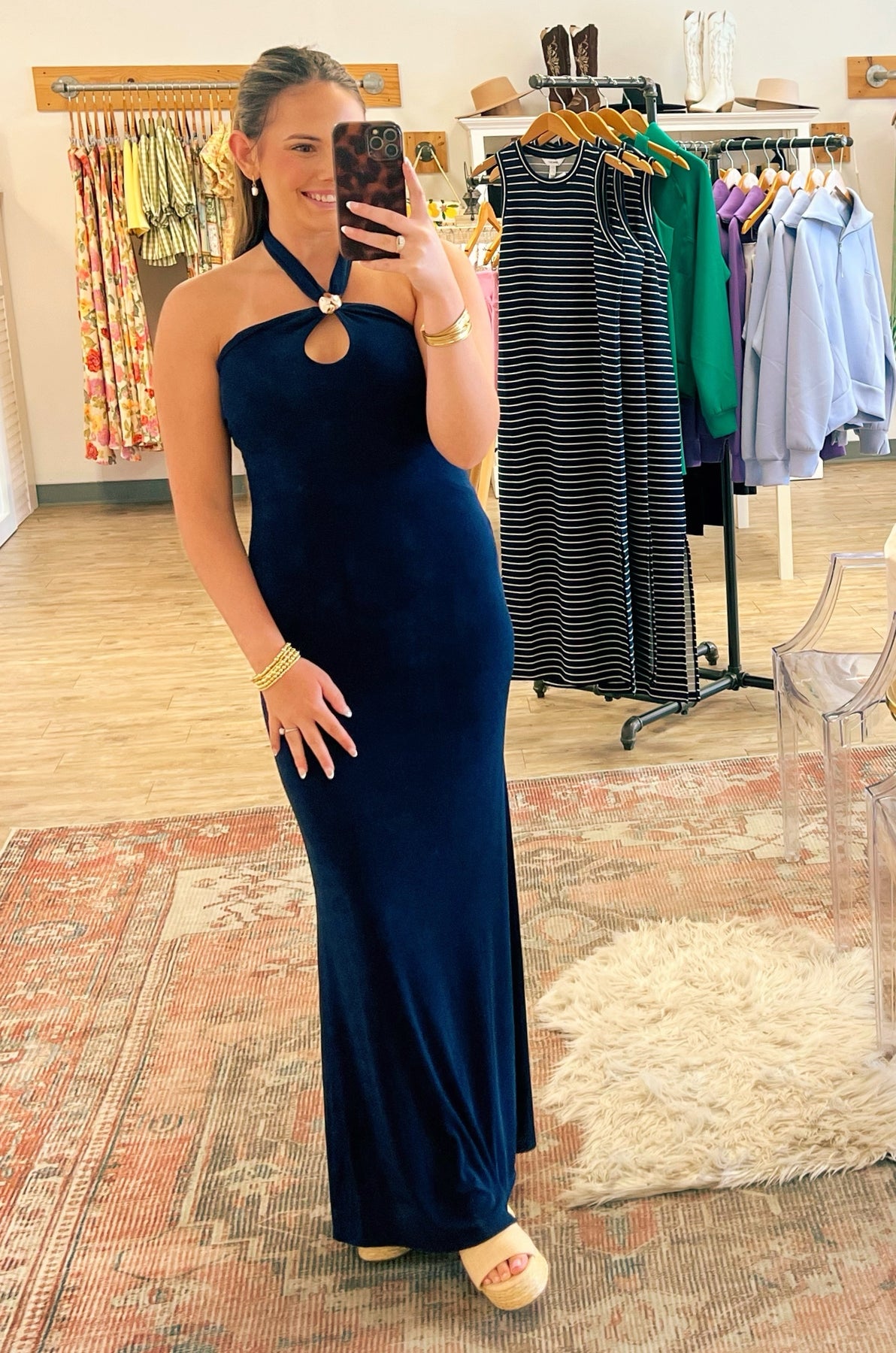 Slinky maxi dress featuring an adjustable halter neck and organic-shaped metal accent. Lined. Styled with our Ashlyn Platform Sandal.