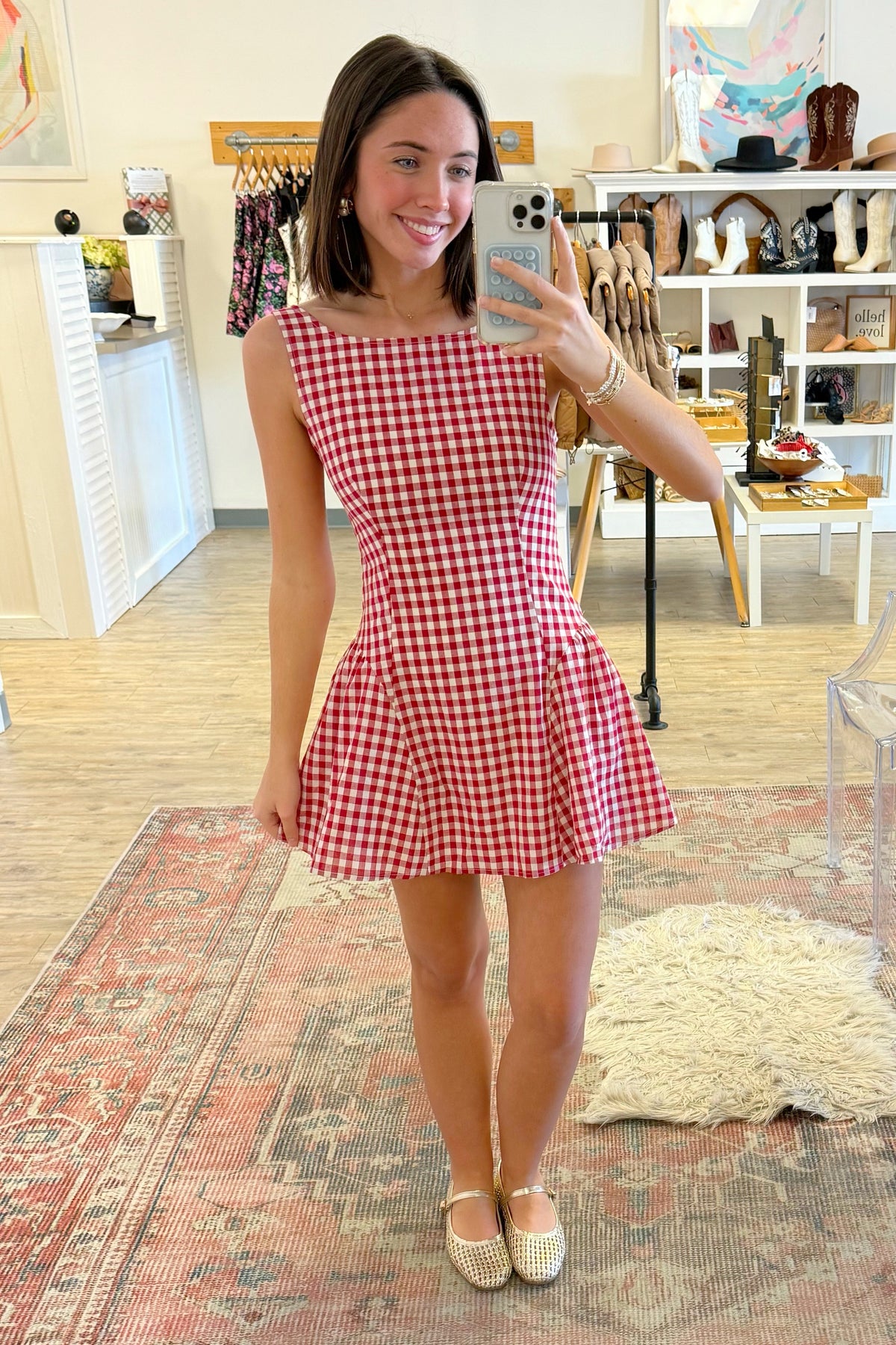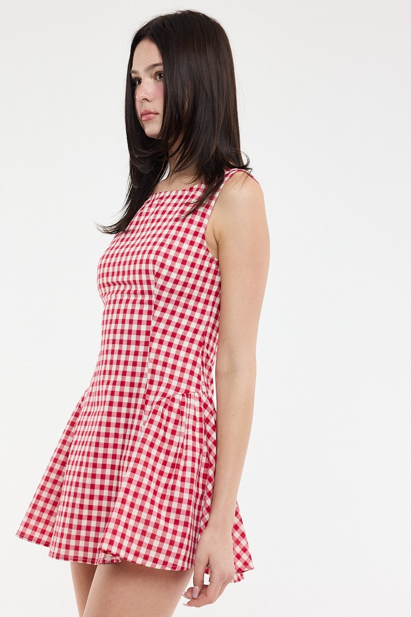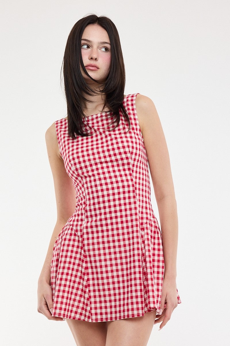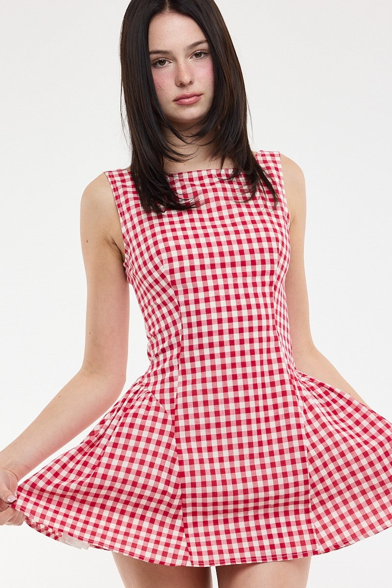 Our red gingham Picnic Party Dress is precious for spring and summer. Crew neckline. Skater skirt. Low back. Hidden back zipper. Sleeveless. Lined. Styled with our City Chic Flat.