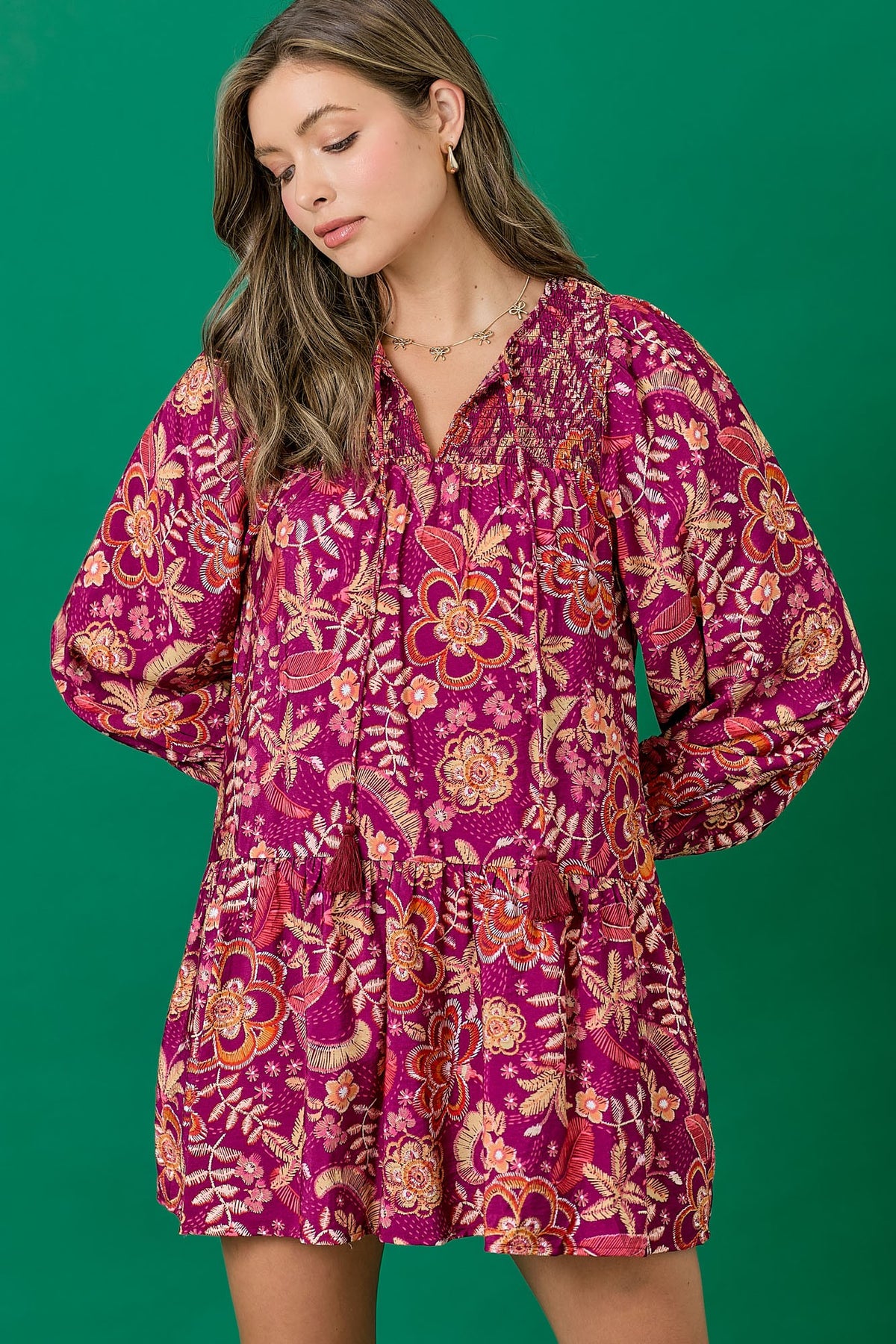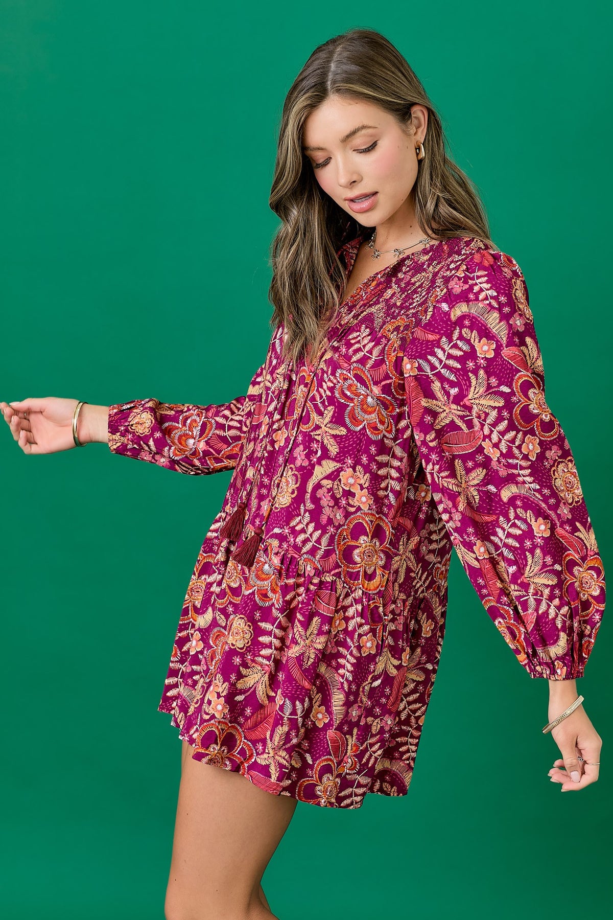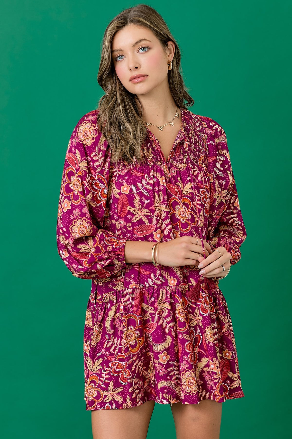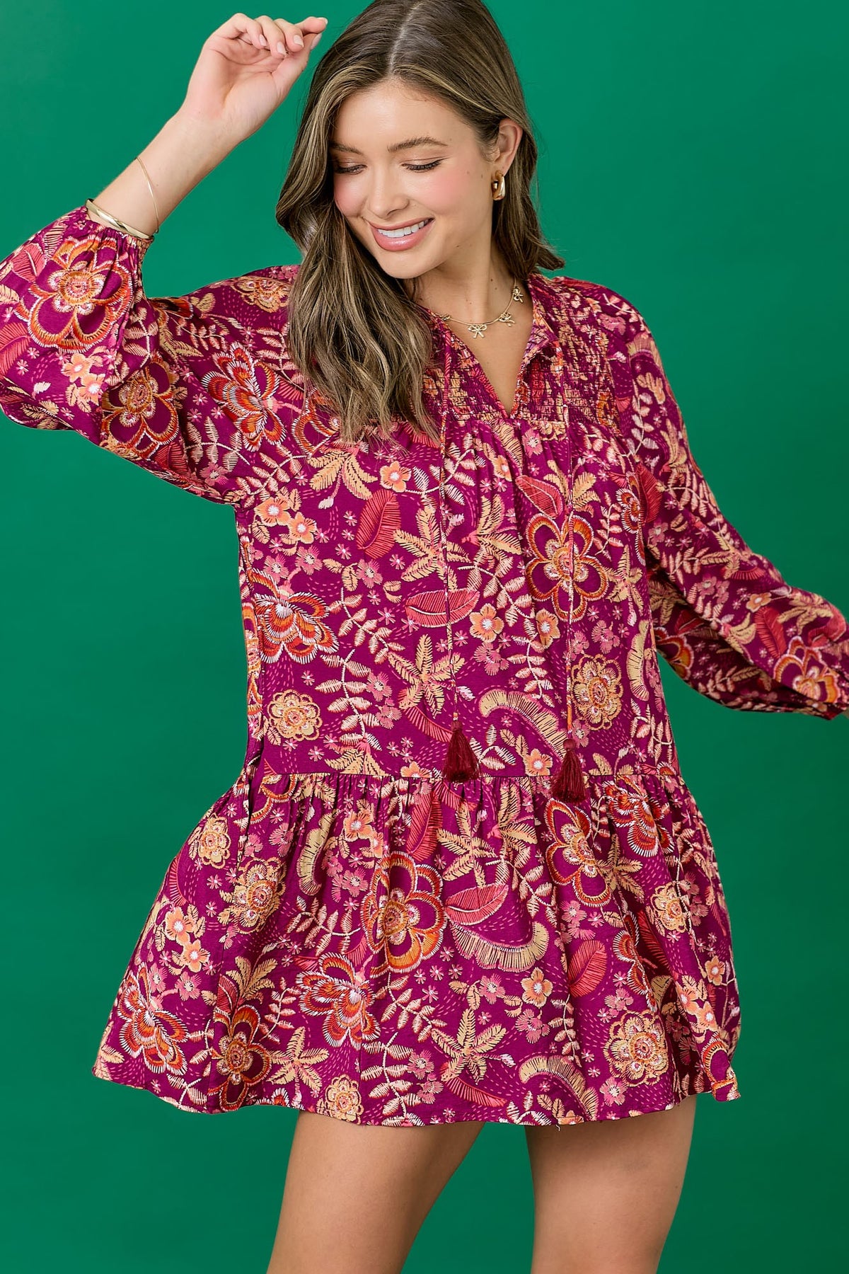 Floral dress featuring a balloon skirt and tassel tie. Long sleeves with elastic. Mini length. Styled with our Ainsley Western Boot.
