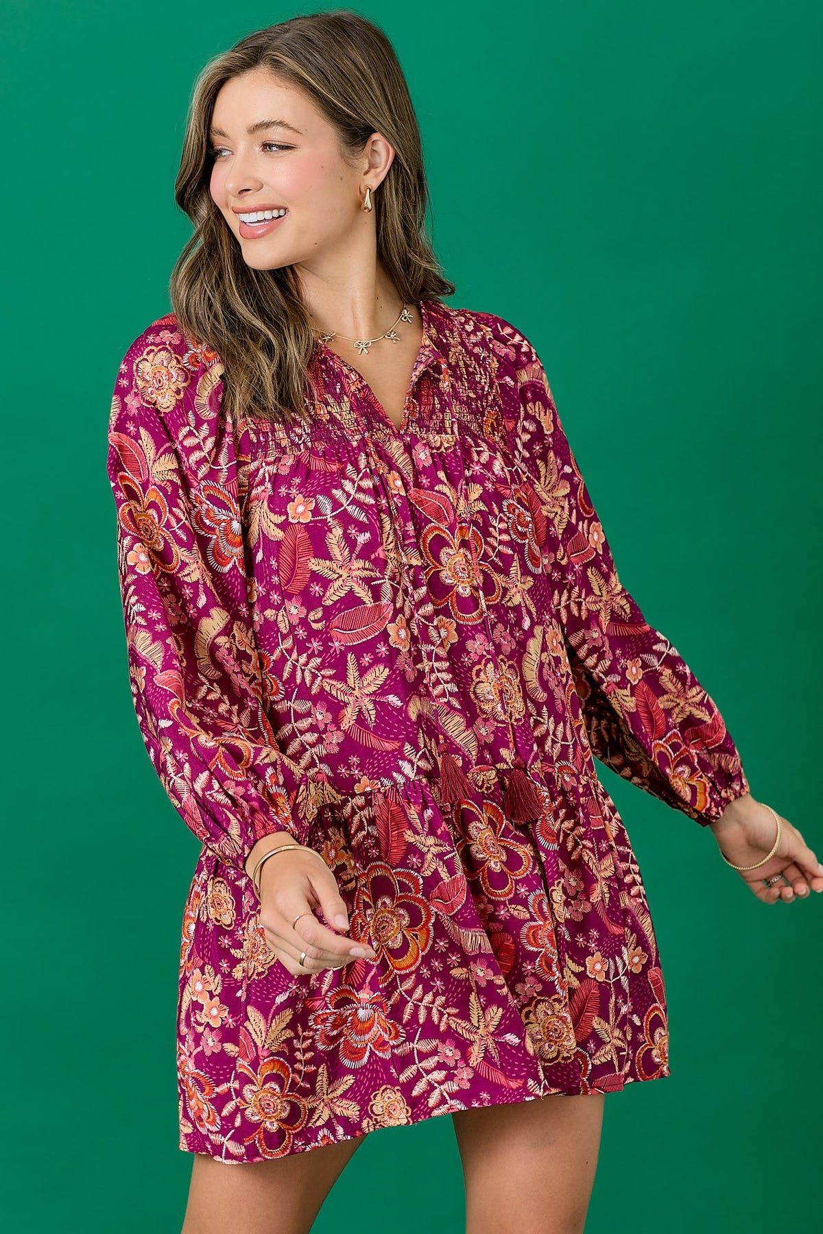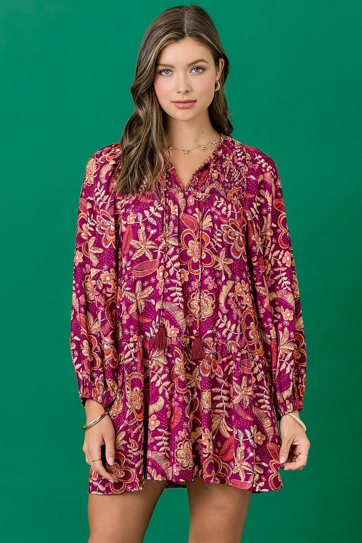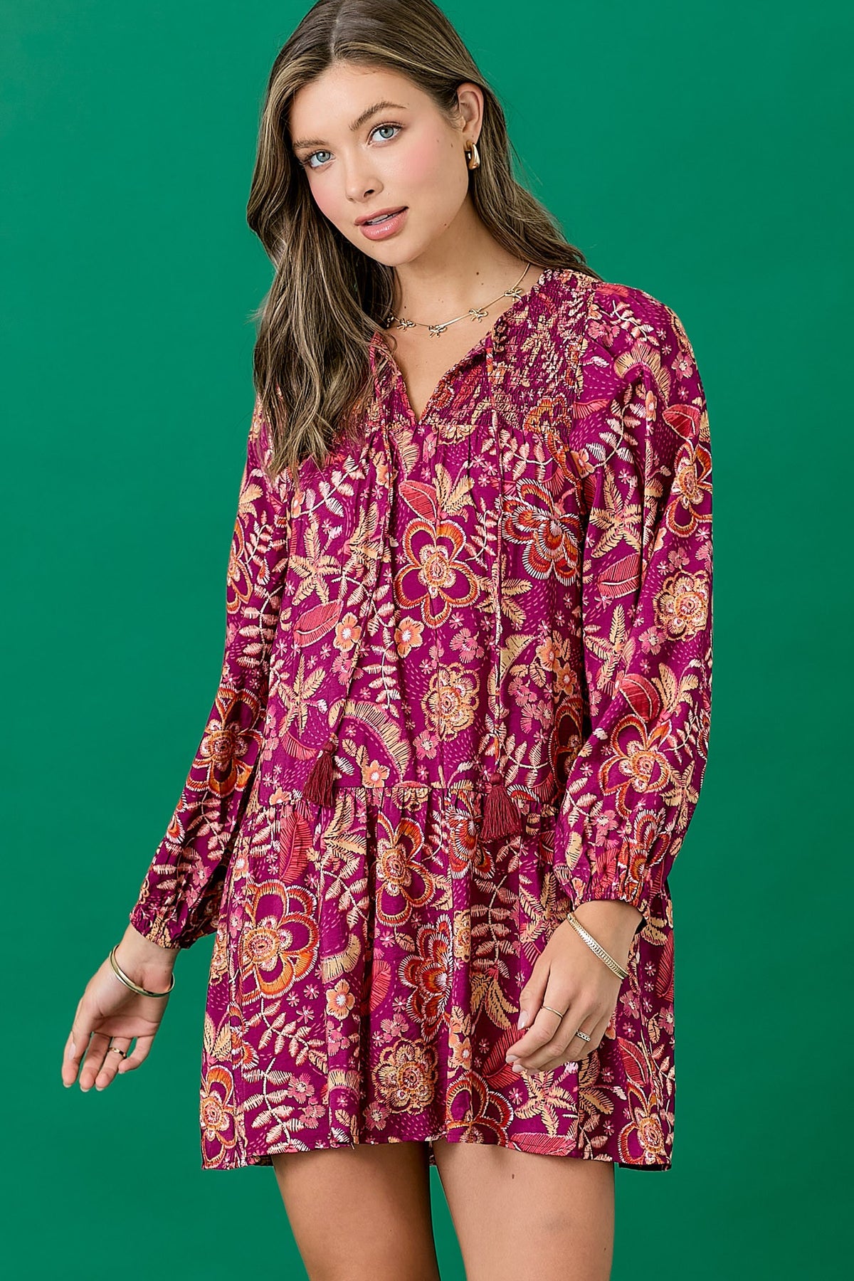 Floral dress featuring a balloon skirt and tassel tie. Long sleeves with elastic. Mini length. Styled with our Ainsley Western Boot.