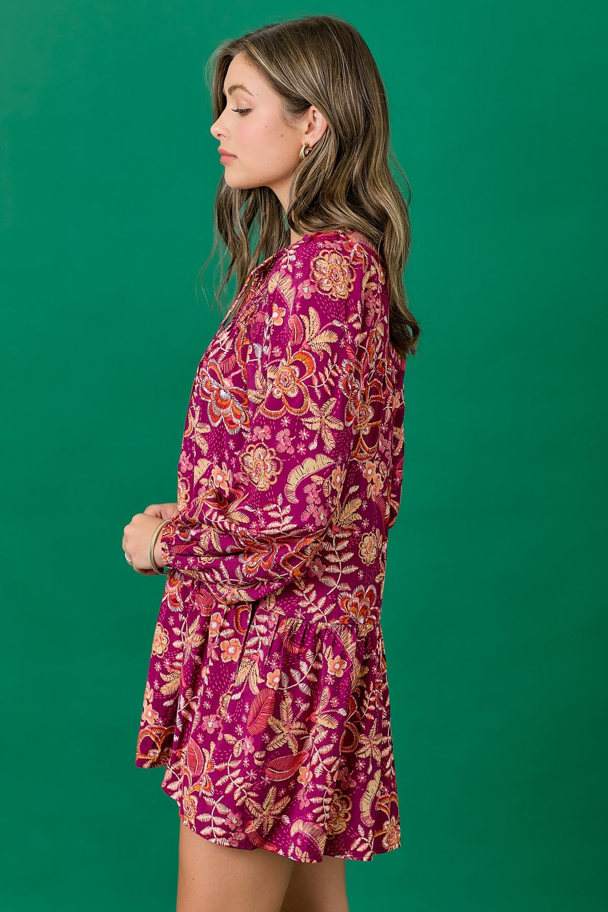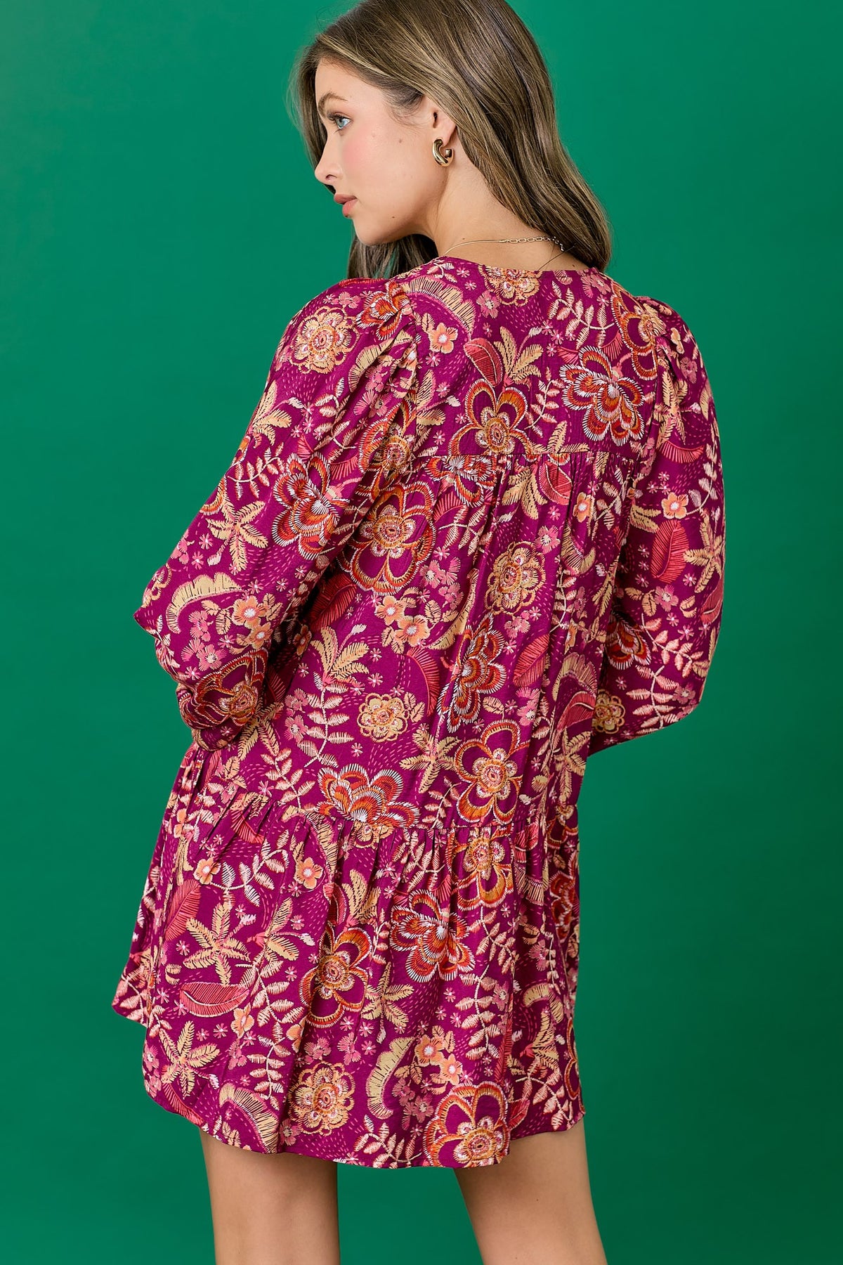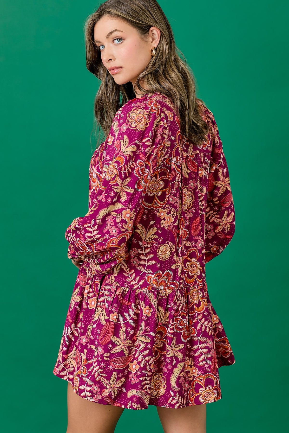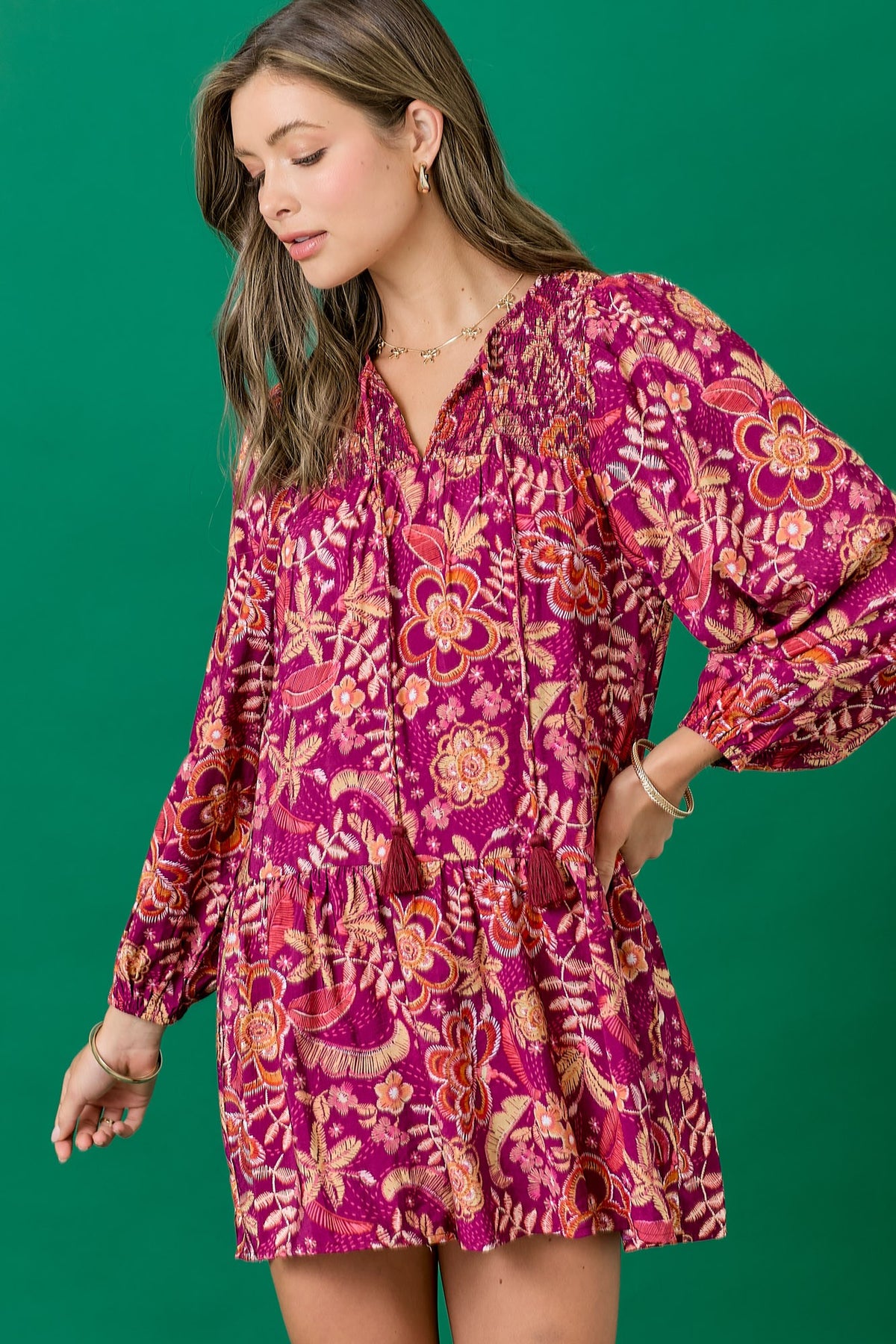 Floral dress featuring a balloon skirt and tassel tie. Long sleeves with elastic. Mini length. Styled with our Ainsley Western Boot.