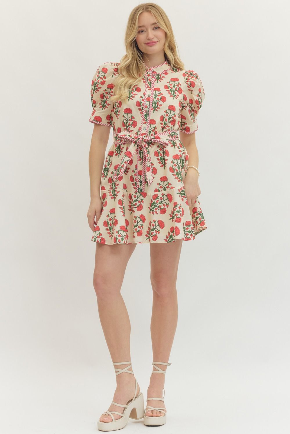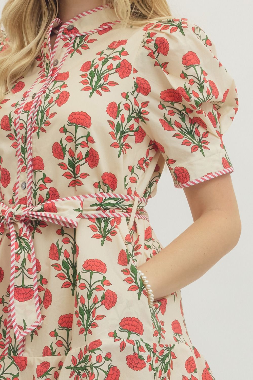Our Claire Dress is an instant mood-lifter! Features a bright red poppy print and contrasting red striped trim for extra zing. Half sleeves with puffy shoulders. Two slip pockets at hips. Adjustable self belt. Band collar. Button-down construction. Lined. Styled with our Tribeca Flats.