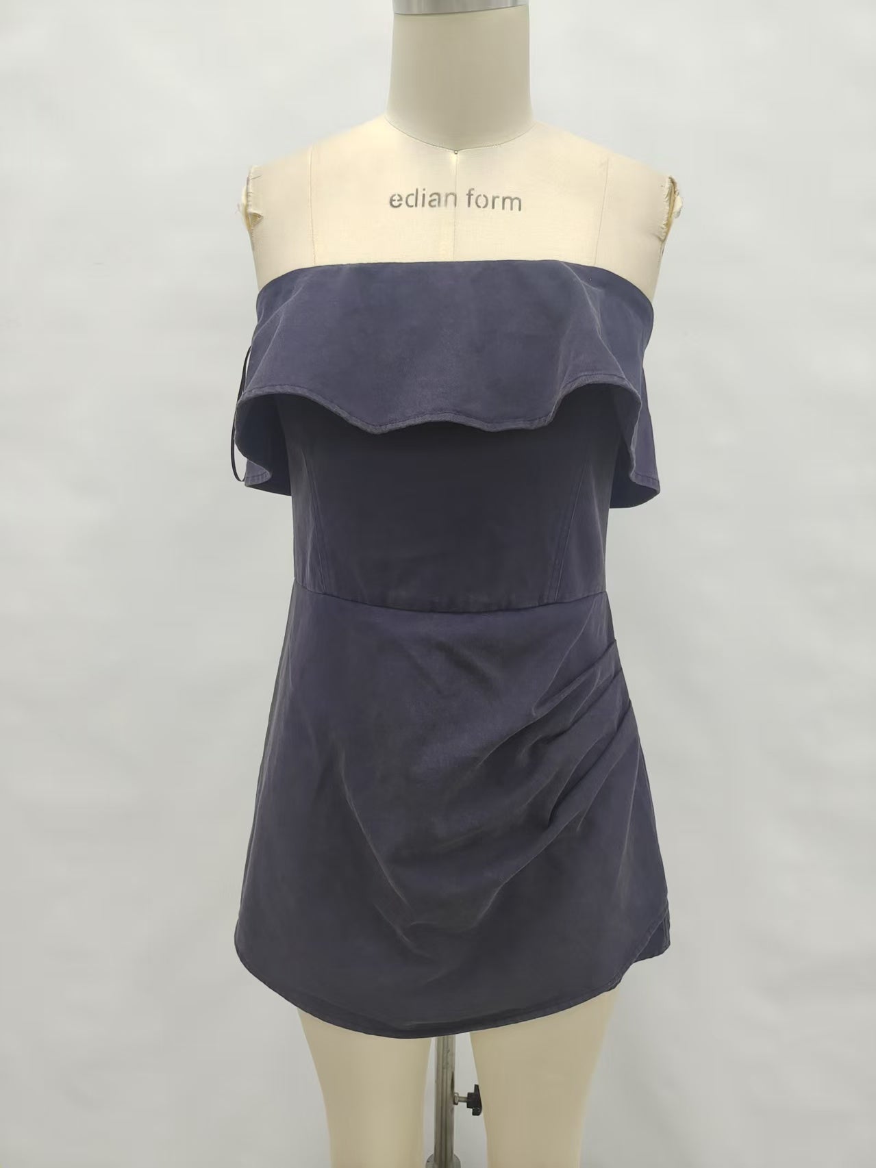 You'll be gorg for game day in our Corinne Romper. This strapless denim romper features a ruffle at the chest, gathered skirt overlay and an exposed back zipper. No zipper. Styled with our Manila Sandal.