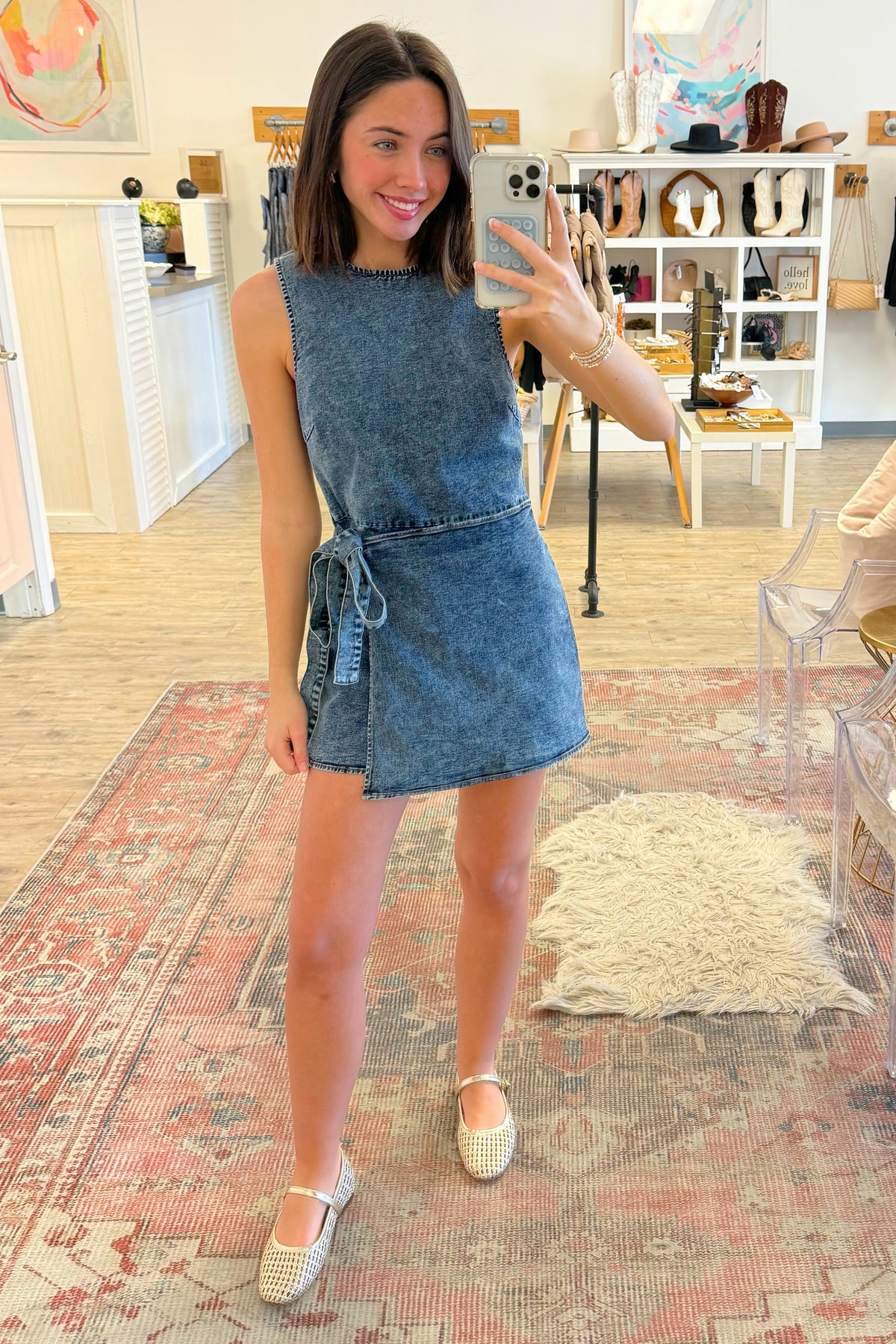 Our Indigo Denim Romper is just right for a warm-weather concert! Features a crew neckline and adjustable wrap skirt over shorts. Lightweight denim. Back zipper. Slight stretch. Styled with our City Chic Flats.