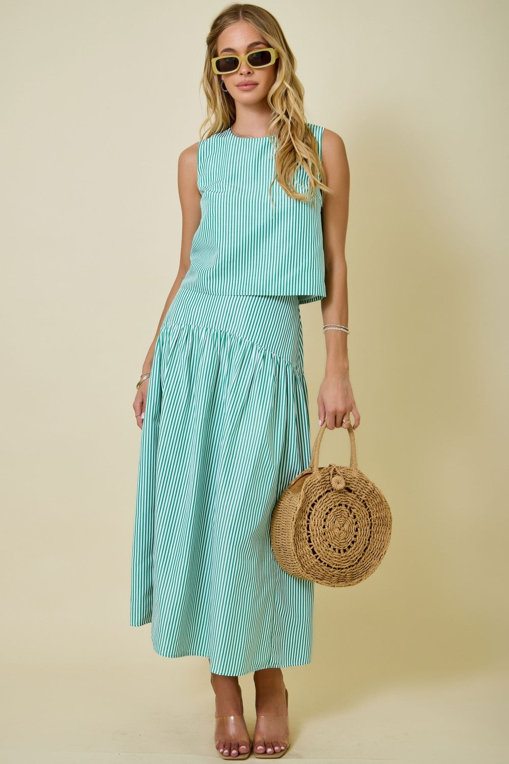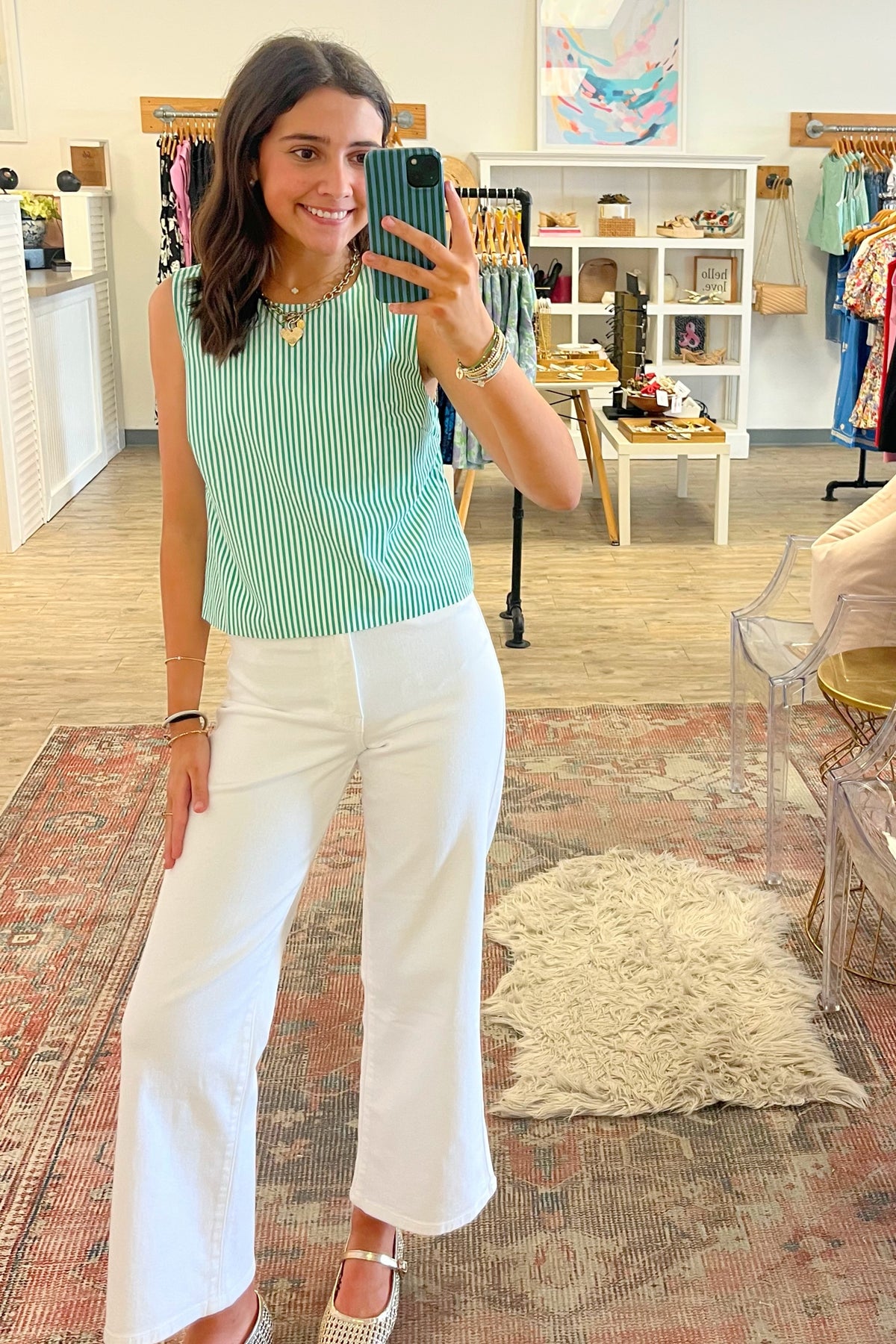 Our sleeveless Julie Top feels so fresh for spring! White stripes on green body. Crew neck. Slight stretch. Lined. Styled with our Welt Pocket Jean and City Chic Flats.