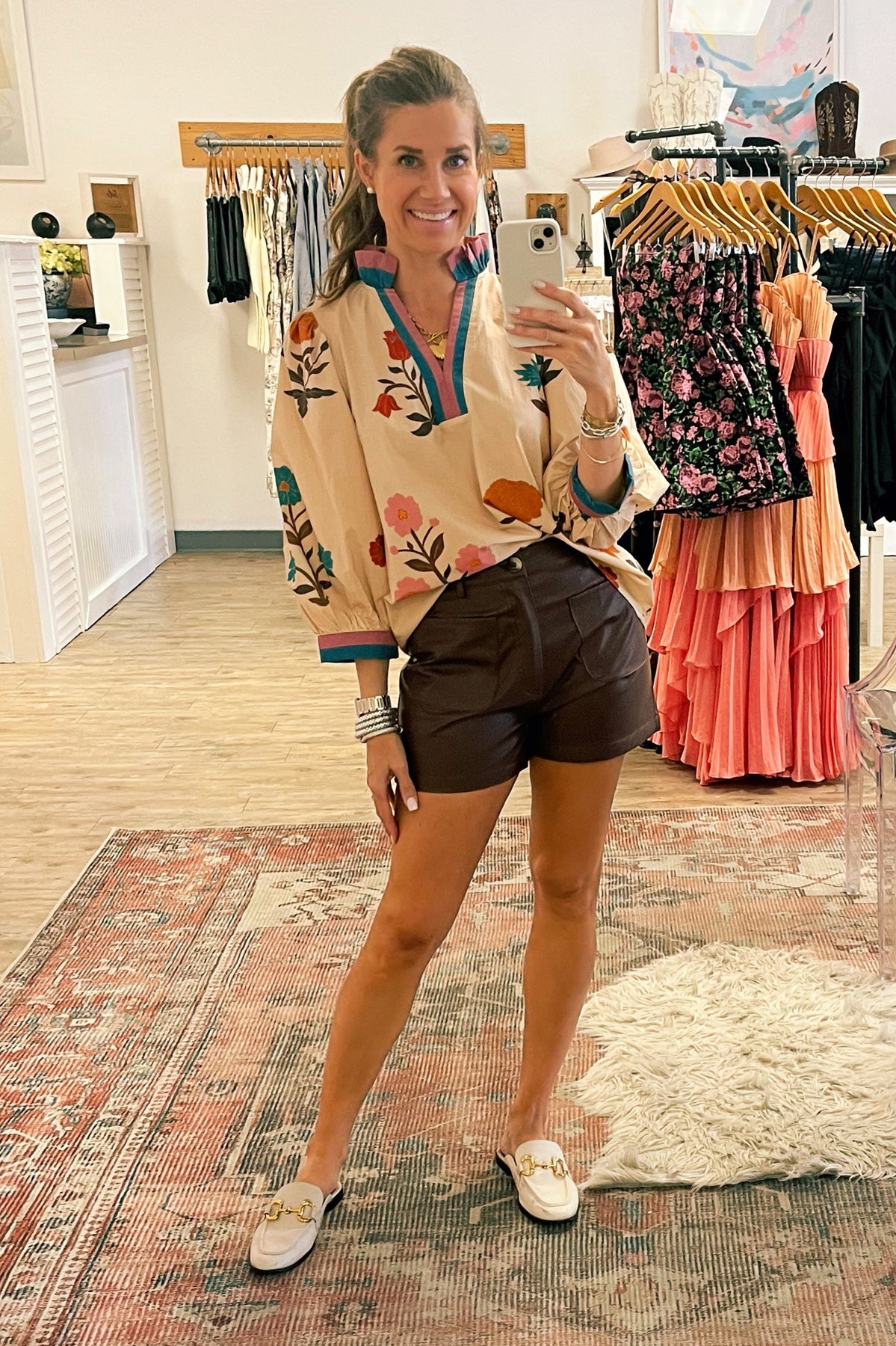 Our Lorelai Top pairs perfectly with denim or leather shorts. Features a high, ruffled neck and open v-neckline. Full length. Styled with our Rory Shorts and Vivian Loafer Slide.
