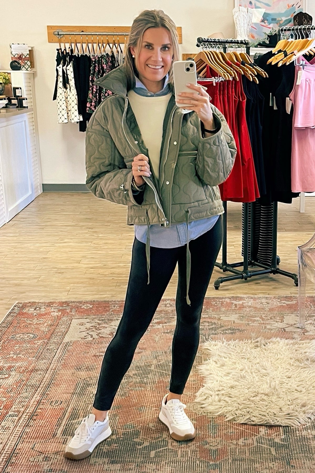 Sophisticated quilted jacket featuring luxe details. Adjustable sleeves. Zip front with fold-over snap placket. Two barn jacket pockets in front. Adjustable waist. Styled with our Spanx Faux Leather Leggings and Teddy Sweater.