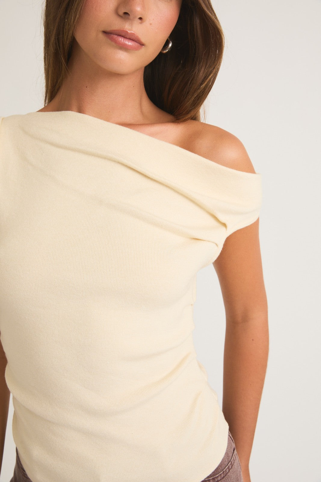Sweater top featuring an off-shoulder, asymmetrical neckline. Full length. Super soft knit. Styled with our Olivia Utility Jean and Vivian Loafer Slide.