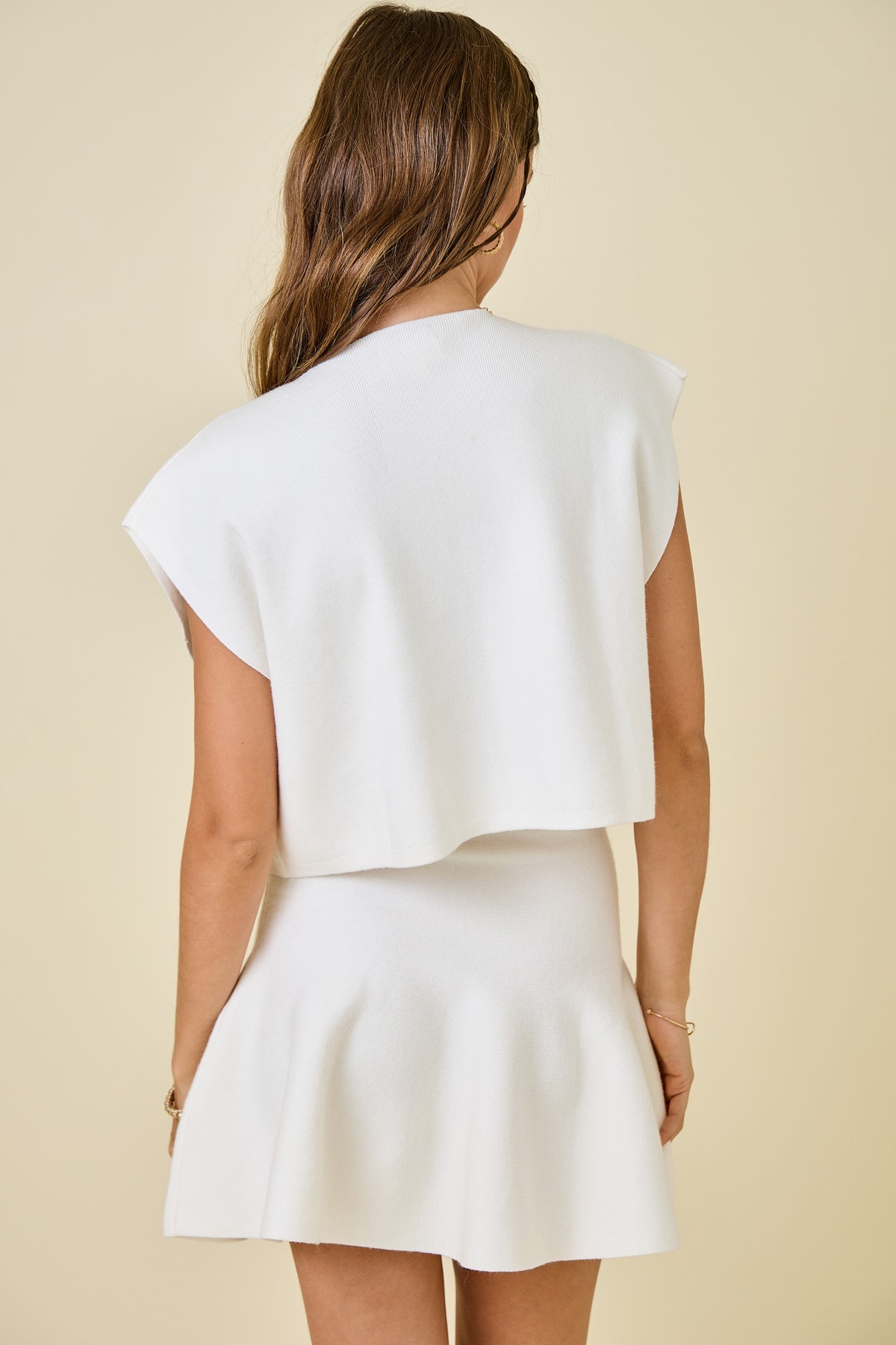 Our Michaela Sweater is so versatile - wear it with our matching Michaela Skirt, or pair with your favorite denim. Super soft, medium weight knit. V-neck. Muscle shoulders. Wide armholes. Boxy fit. Slightly cropped. Styled with our matching Michaela Skirt (sold separately) and Shakira Boot.
