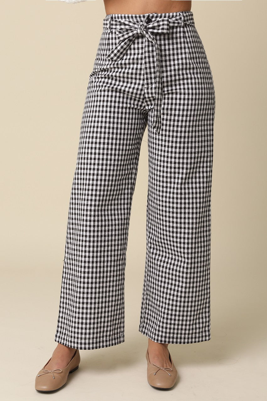 Our linen-blend Charlie Gingham Pant is more versatile than you might think! Pair it with a white sweater in the cooler months and a tank when it's warm. Features a straight leg, slash pockets and matching self-belt. Styled with our Rational Bow Flat.