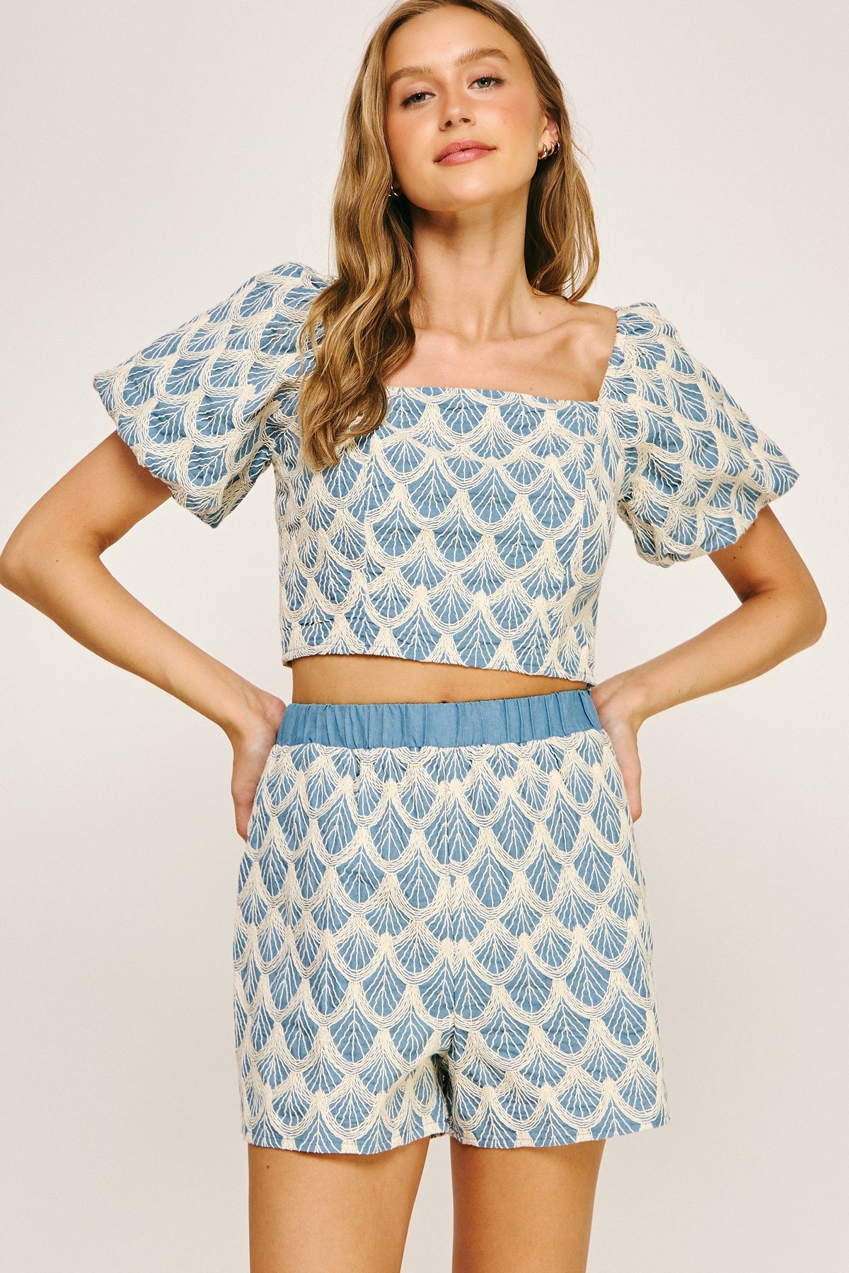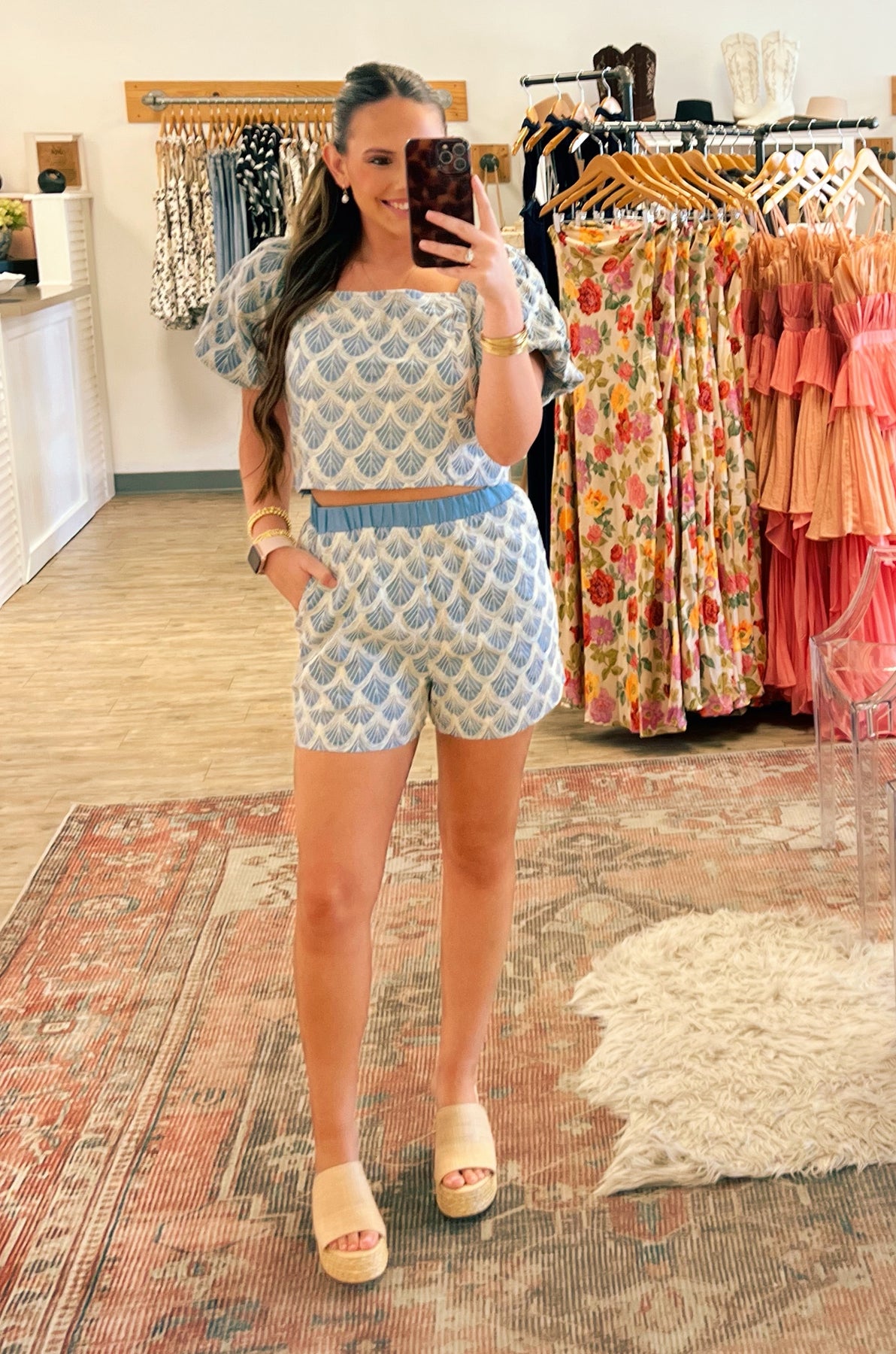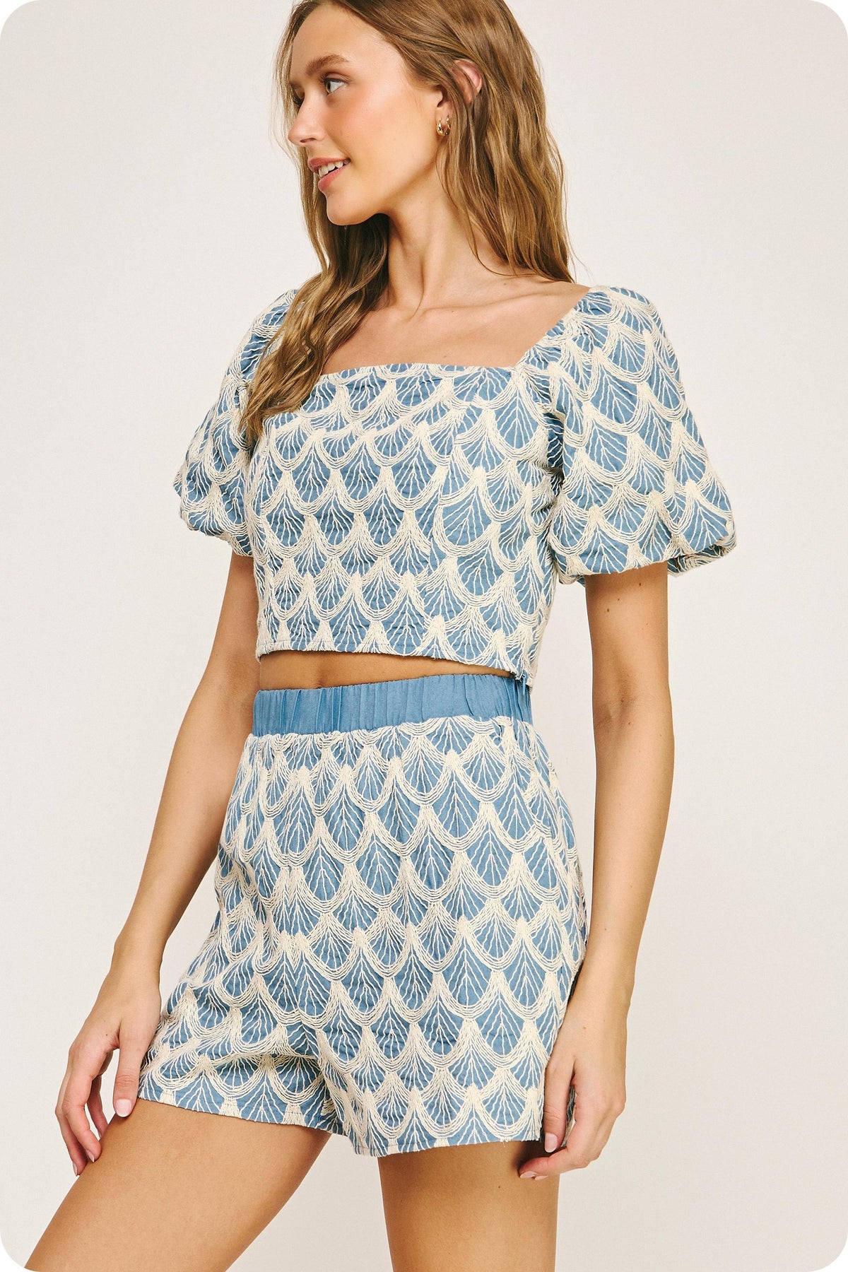 Our Cierra Set is so special! Top features intricate embroidery, puffy sleeves and contrasting straps in back. Smocked back. Elastic at shoulders. Hidden zipper closure. Styled with our matching Cierra Shorts (sold separately) and Ashlyn Platform Sandal.