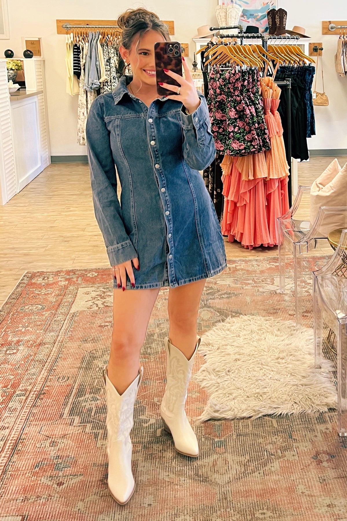 Our Raquel Denim Dress features shirtdress details and Western-inspired seams. Long sleeves. Brushed silver buttons. Button-down construction. Slight stretch. Styled with our Amaya Western Boot.