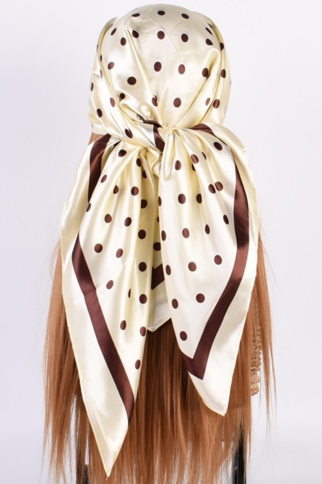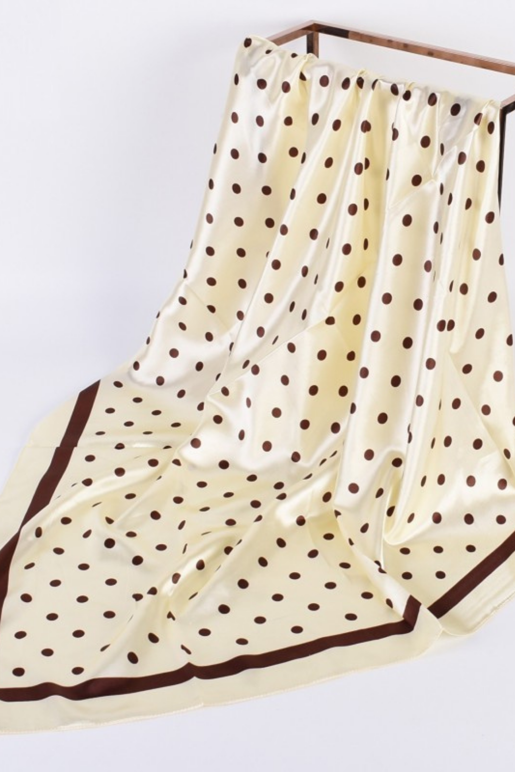This silky bandana scarf is so versatile. Chocolate brown polka dots on ivory background. Chocolate brown square frame. Whether you wear it as a headband, neck scarf, wrist wrap, or tie it to your bag for a stylish accent, this scarf is sure to make a statement.