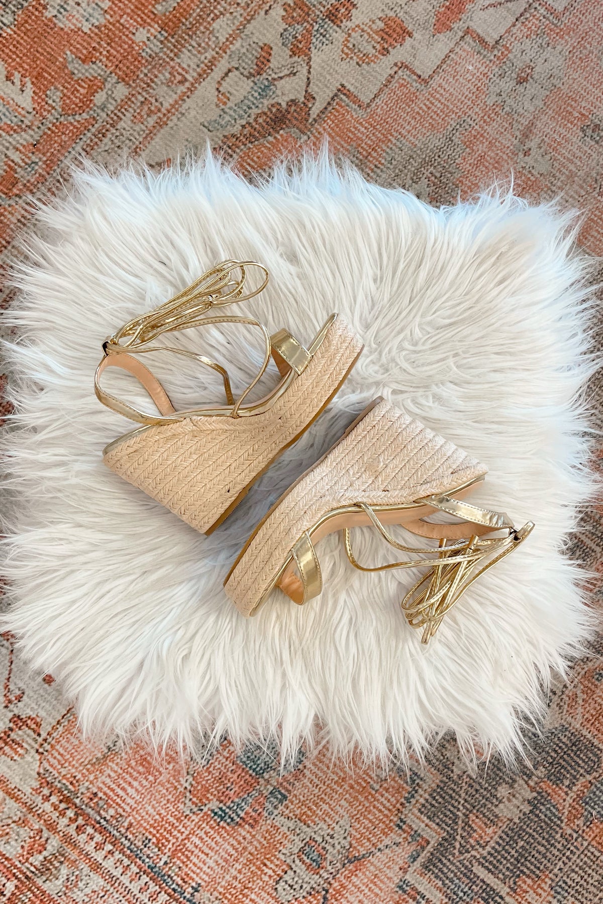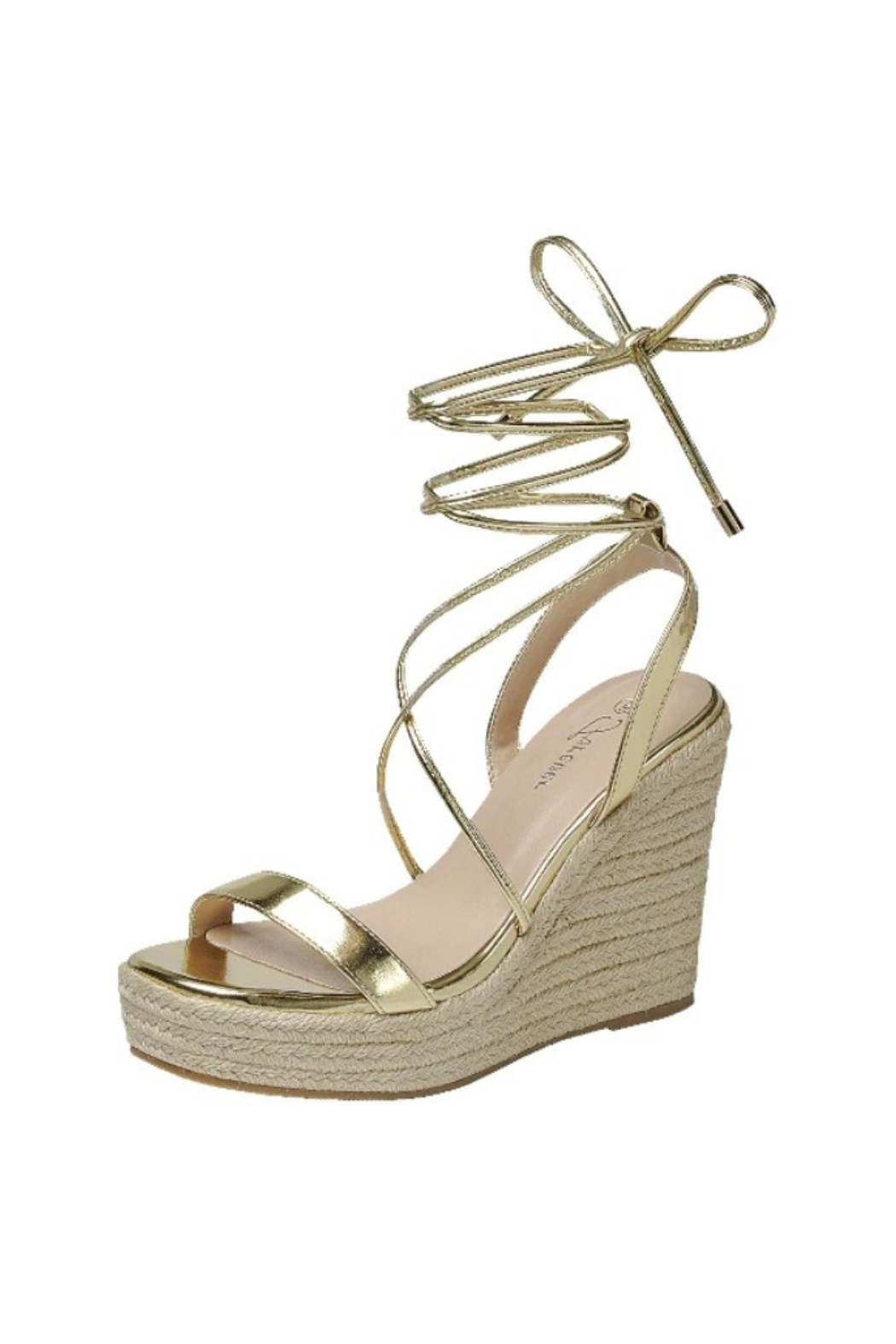 Espadrille sandal featuring a metallic strap across the toe and matching metallic ankle laces. Rope-covered platform. Available in whole and half sizes.