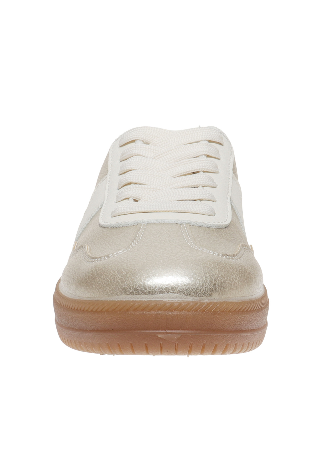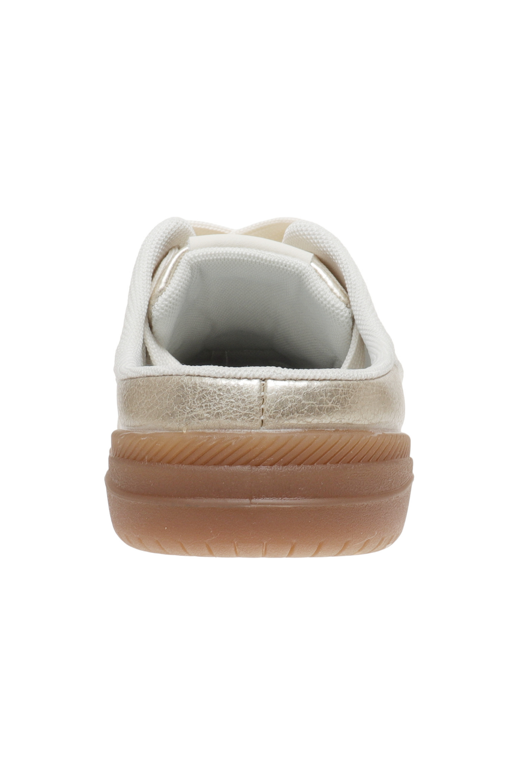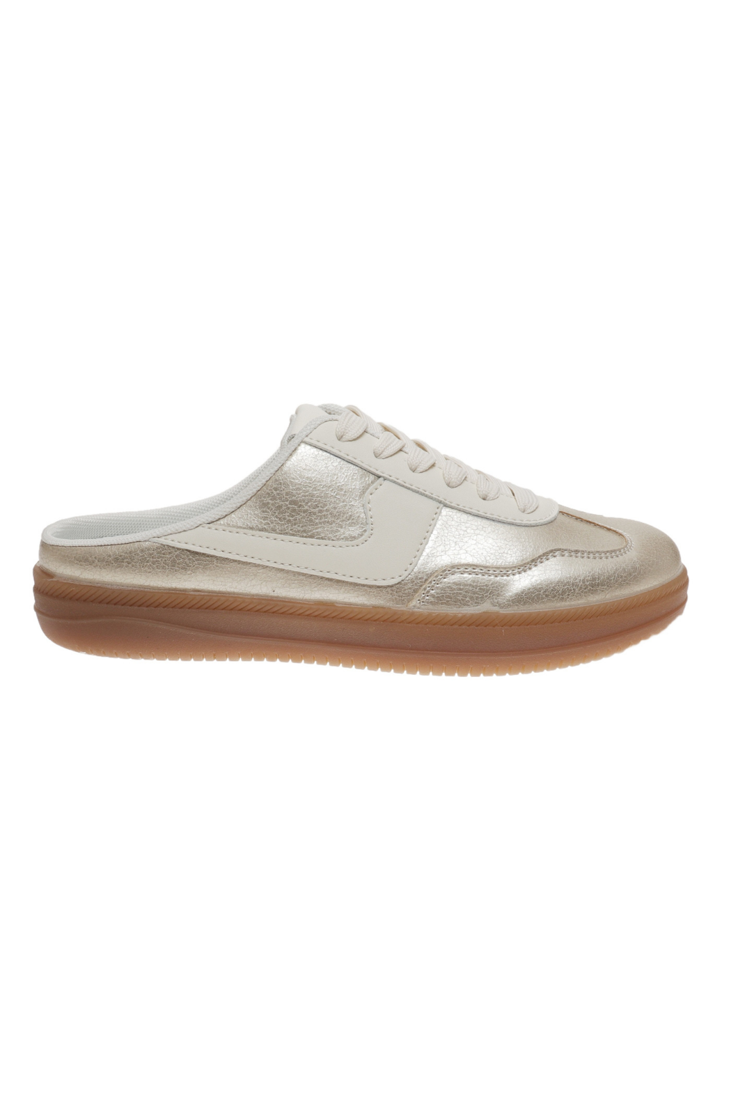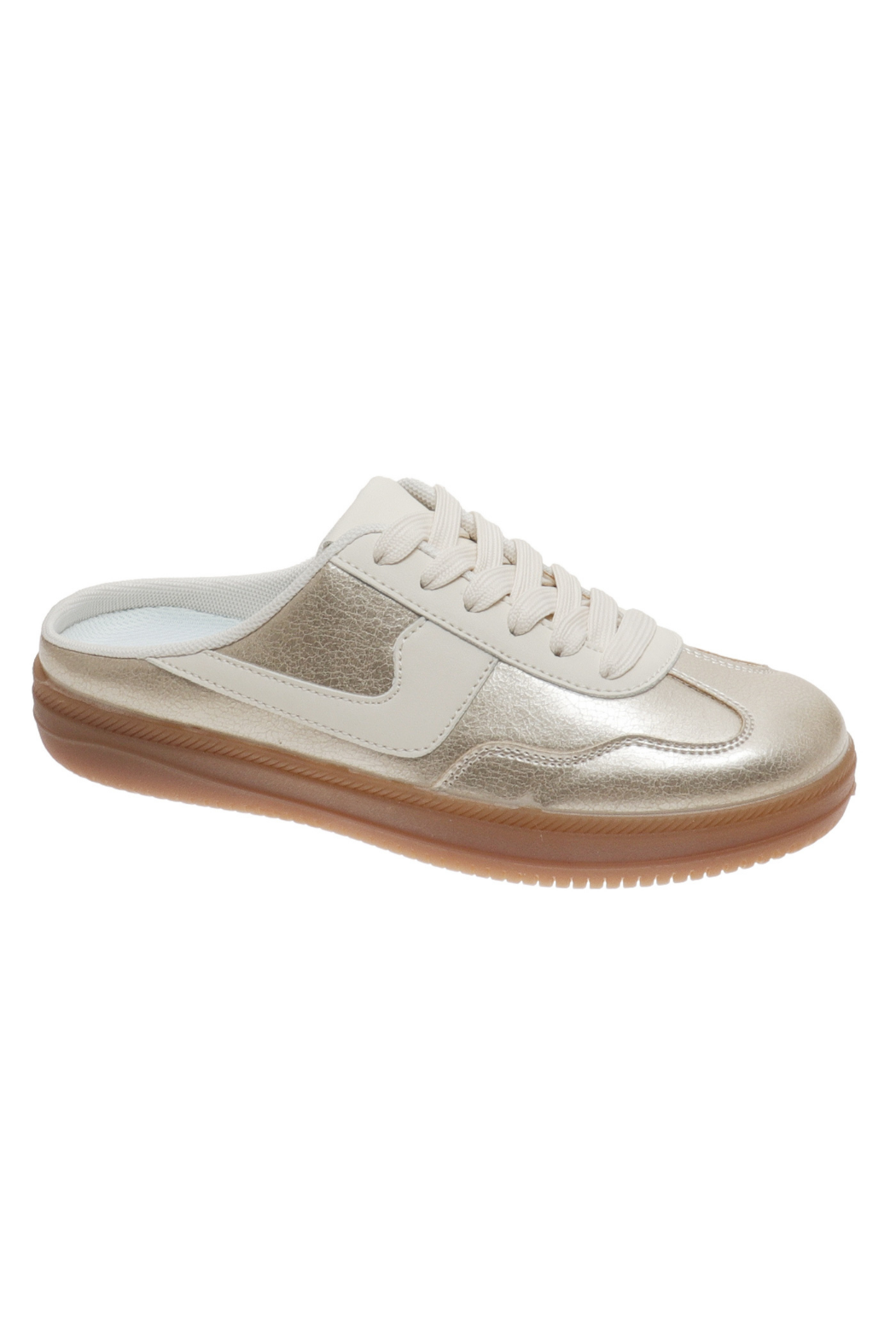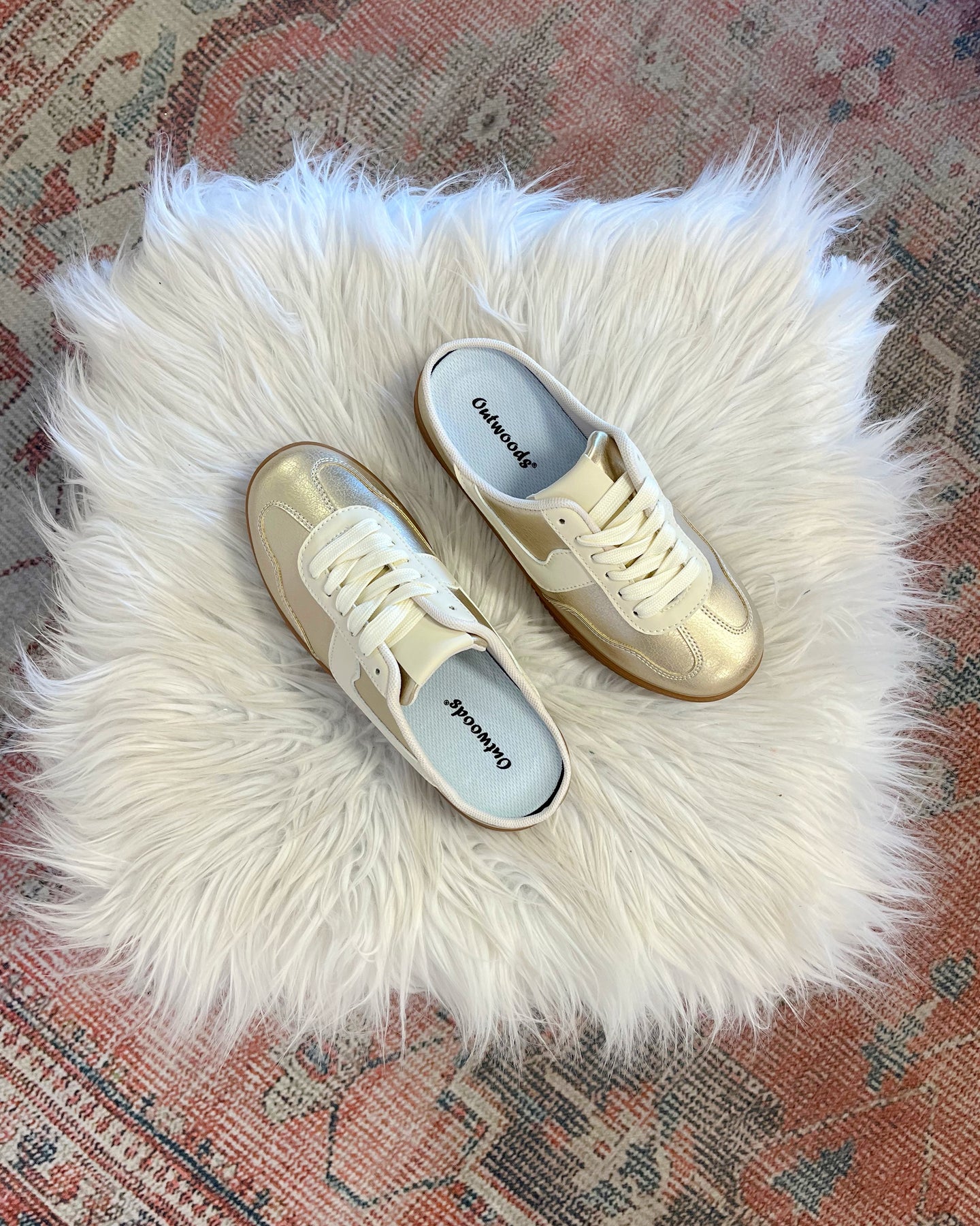 The cutest sneaker mules! These gold tennies feature beige laces and accents and an open back. Tan gum rubber outsole.
