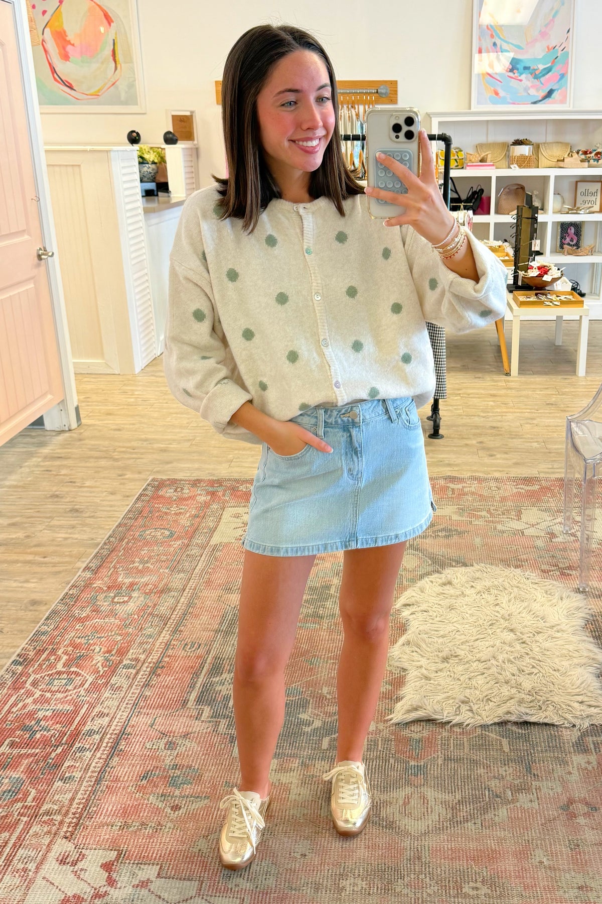 Ivory cardigan sweater featuring sage green polka dots. Perfectly oversized. Buttons down the front. Styled with our Denim Mini Skirt and Mackay Sneaker Mule.