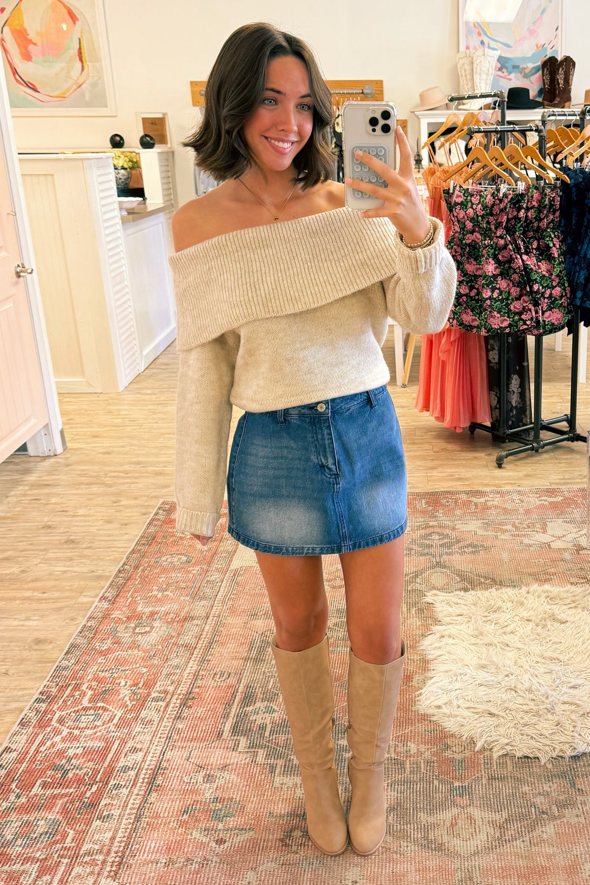 Our off-shoulder Cozy Chic Sweater looks great with leather shorts or denim! Styled with our Kendall Denim Mini and Shiloh Knee-High Boots.