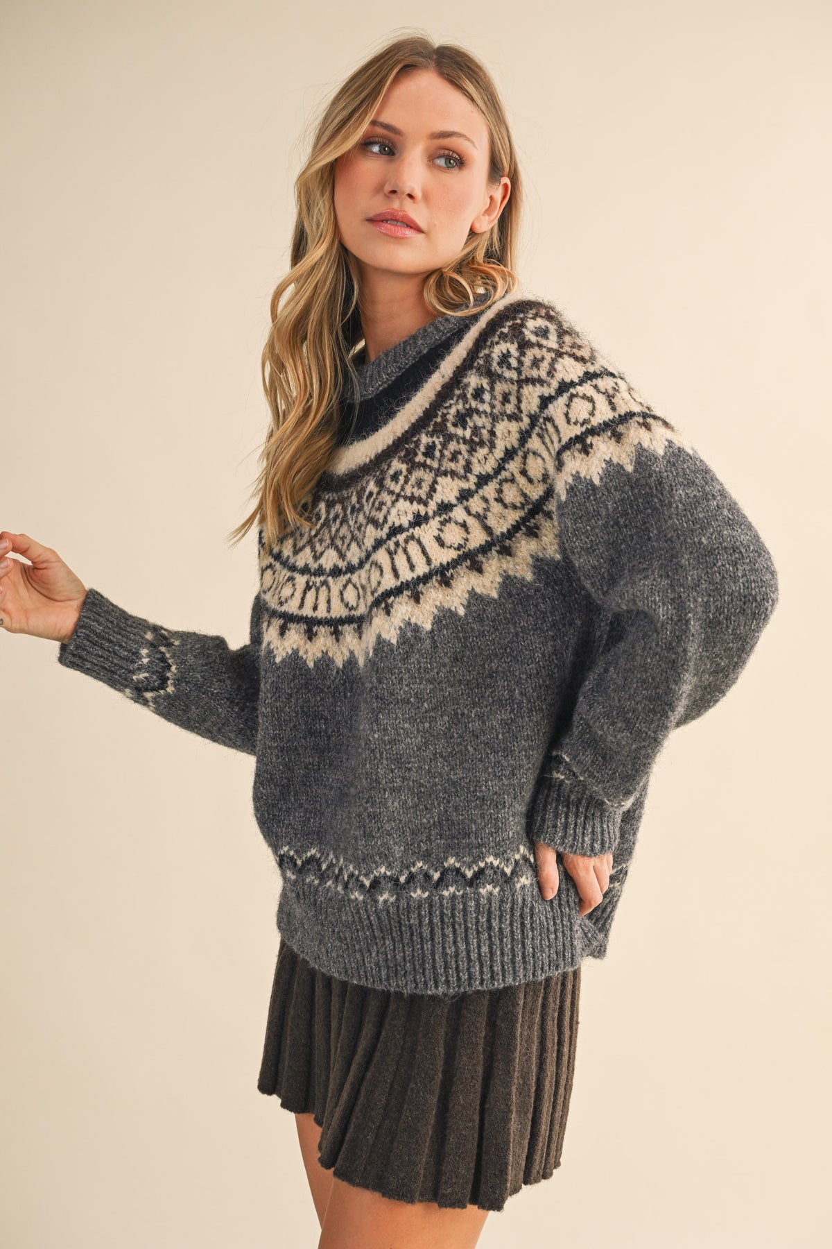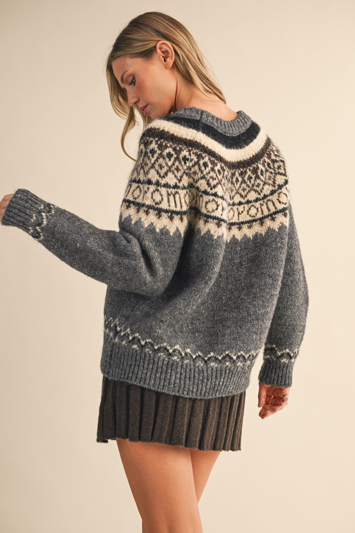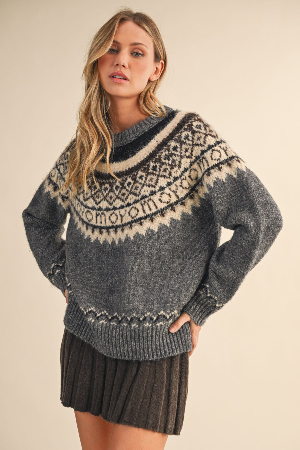Oversized chunky sweater featuring a Nordic Fair Isle-inspired pattern. Sized small/medium and medium/large. Styled with our Hayley Shorts and Shiloh Knee-High Boot.