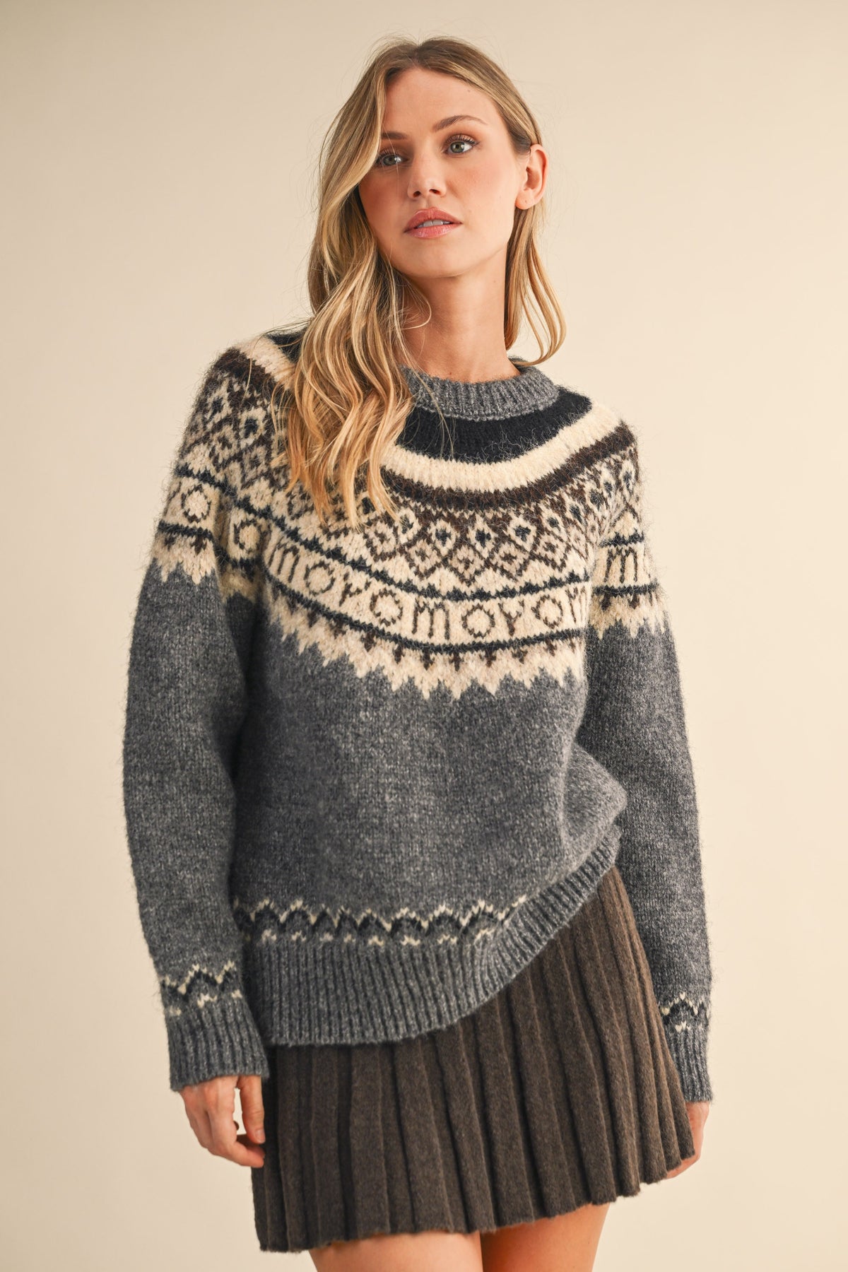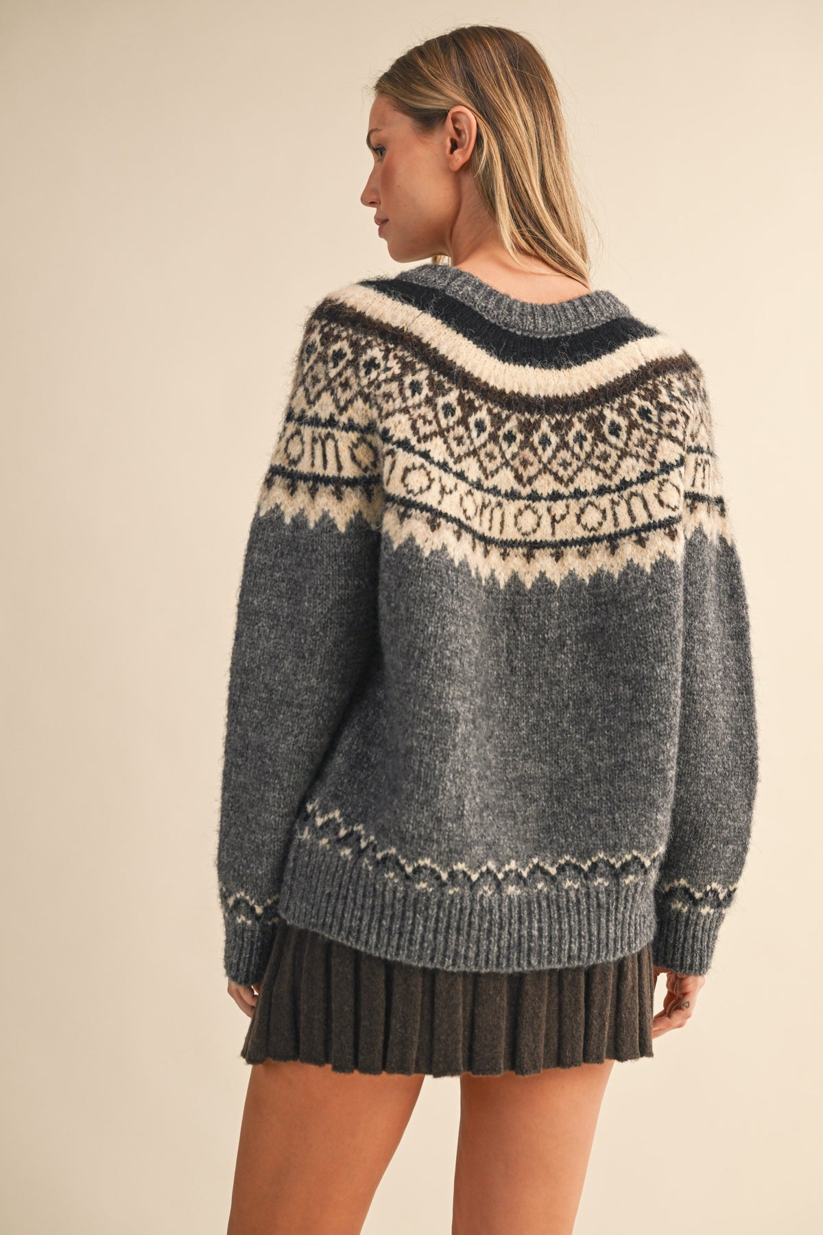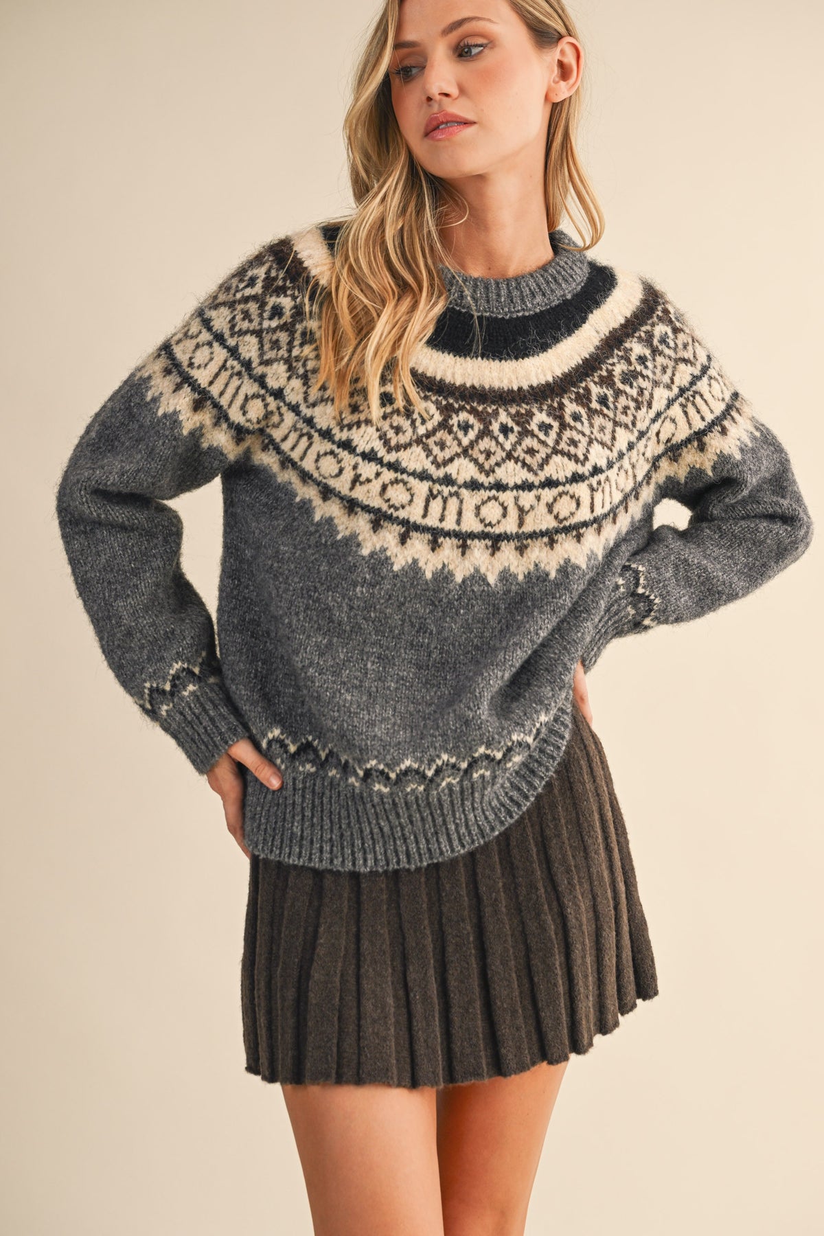 Oversized chunky sweater featuring a Nordic Fair Isle-inspired pattern. Sized small/medium and medium/large. Styled with our Hayley Shorts and Shiloh Knee-High Boot.