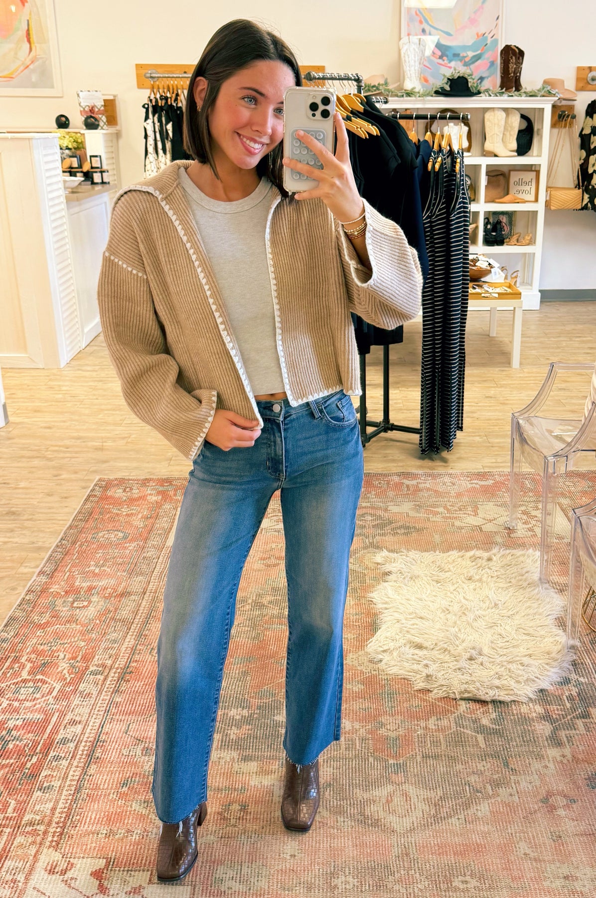 Styled with our Slim Palazzo Jean and Demi Boot.