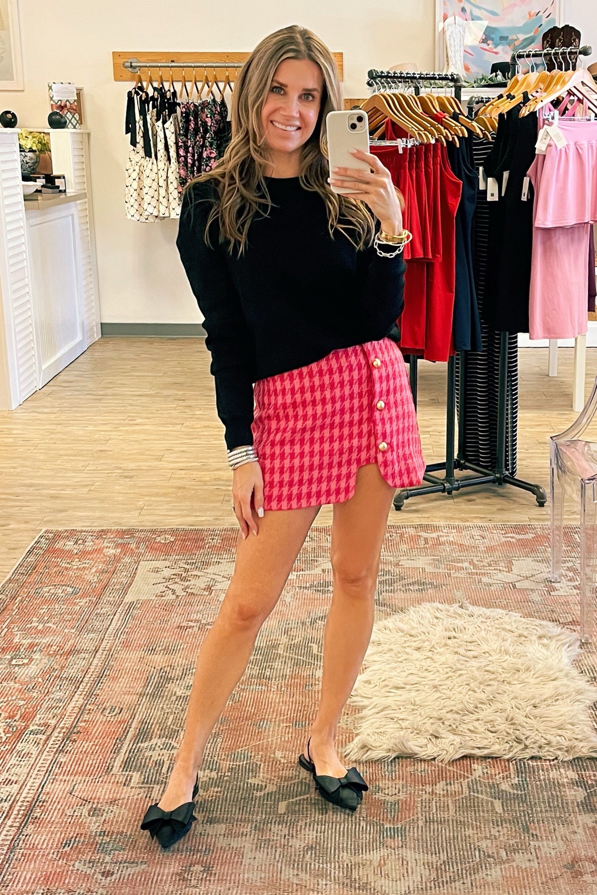 The sweetest skort. Pink houndstooth skort featuring a wavy hem and three brushed gold buttons. Hidden back zipper. Shorts underneath. Styled with our Teddy Sweater and Rational Bow Flat.