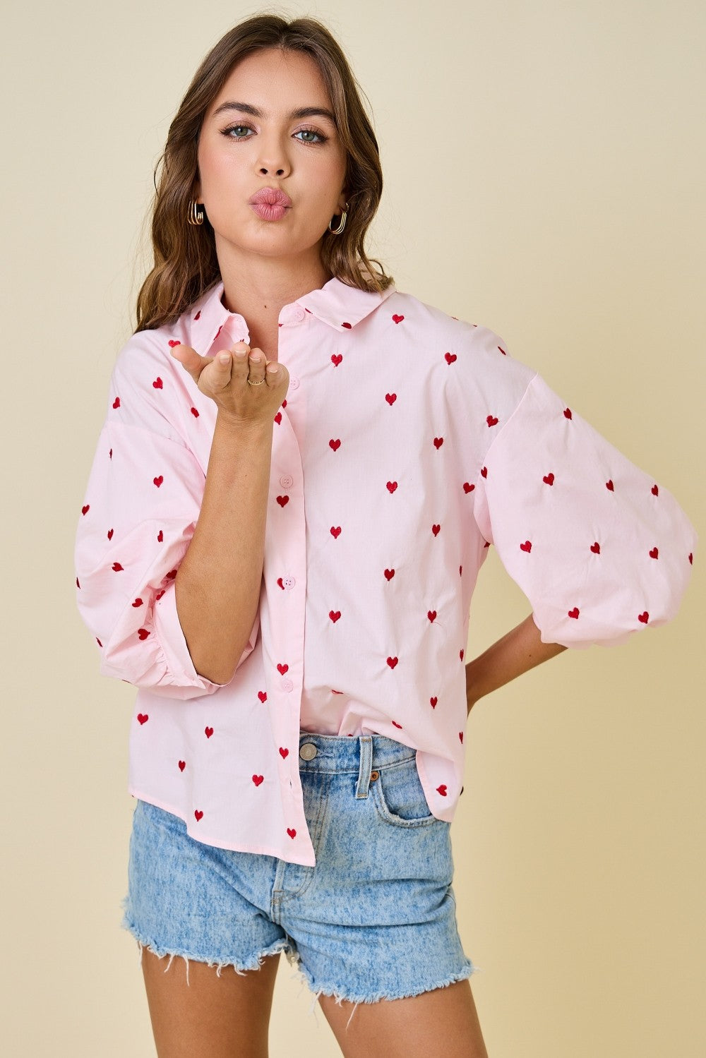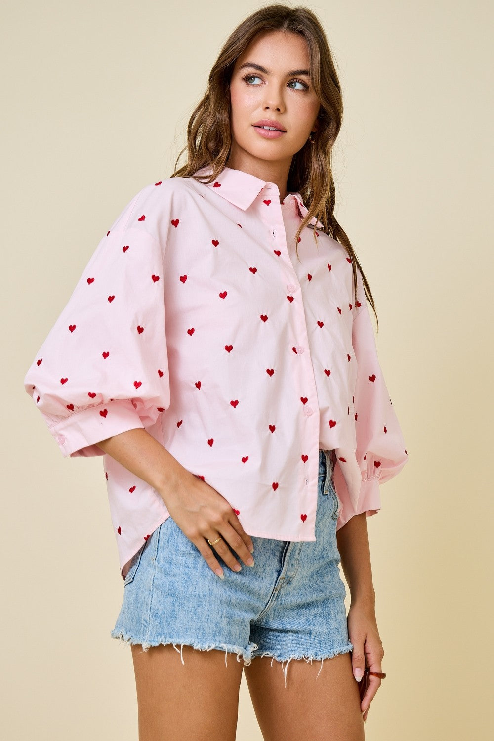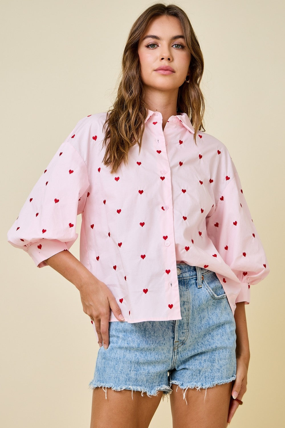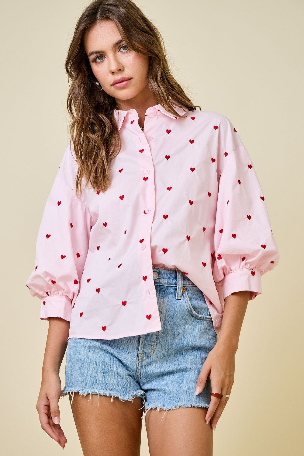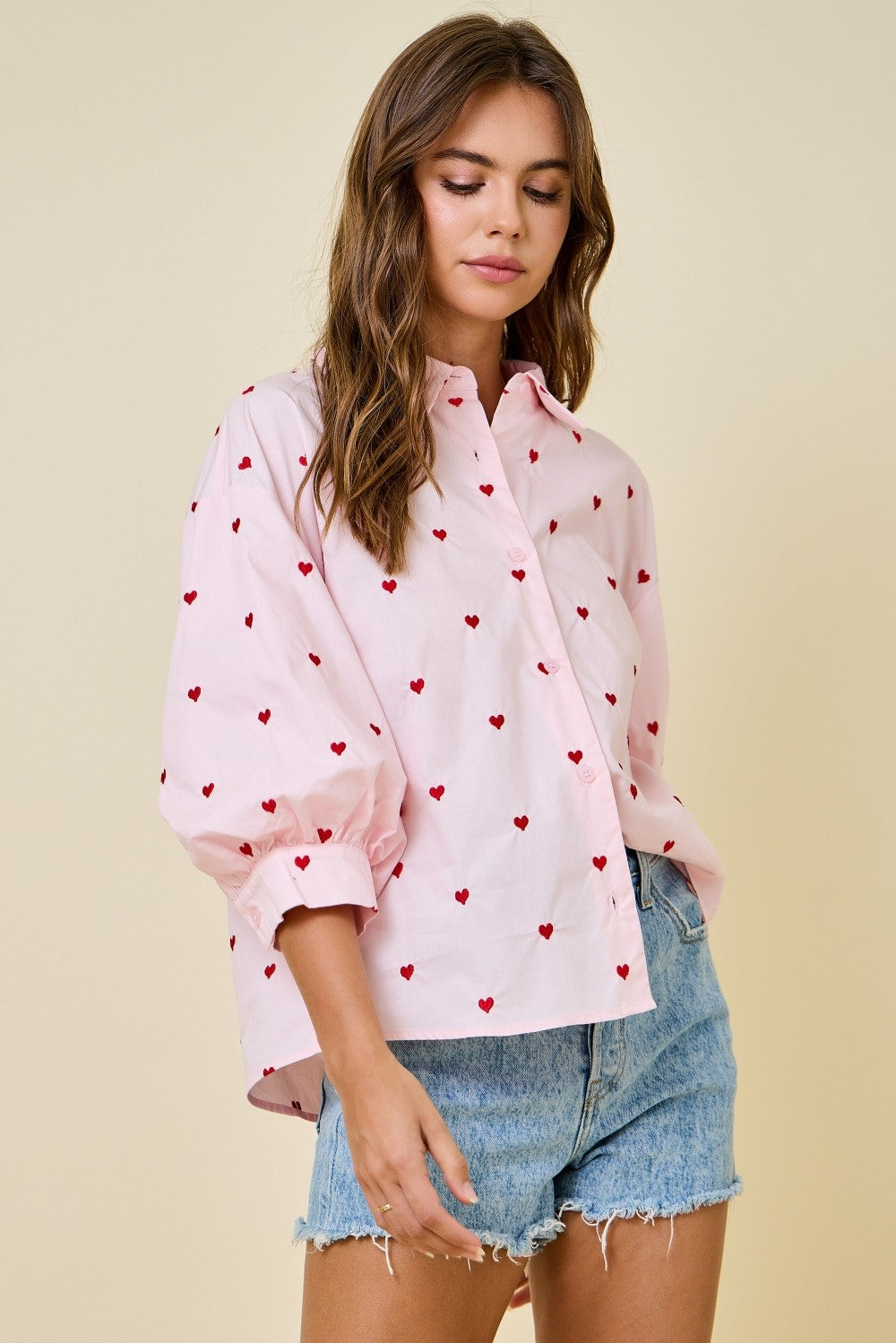 We heart this cute little top! Light pink poplin shirt featuring embroidered hearts, a shirt collar, and 3/4 length sleeves with a gentle puff below the elbow. Styled with our 90s Wide Leg Jean and Tara Boot.
