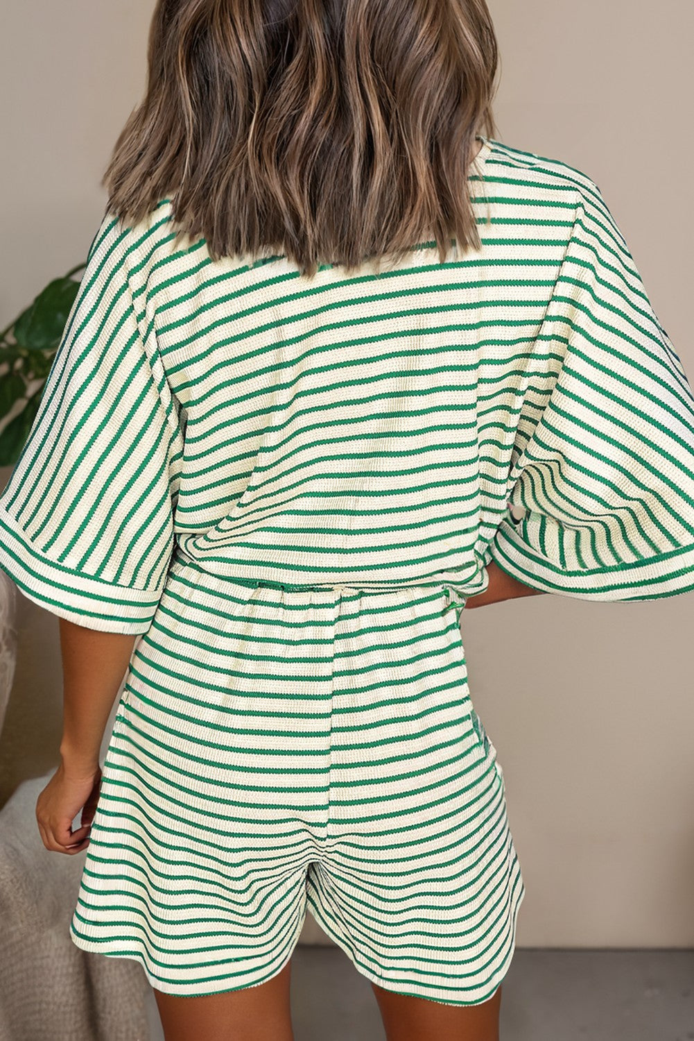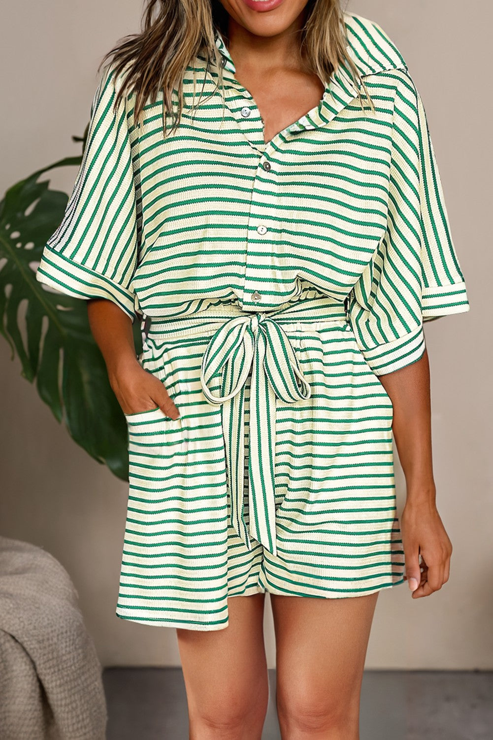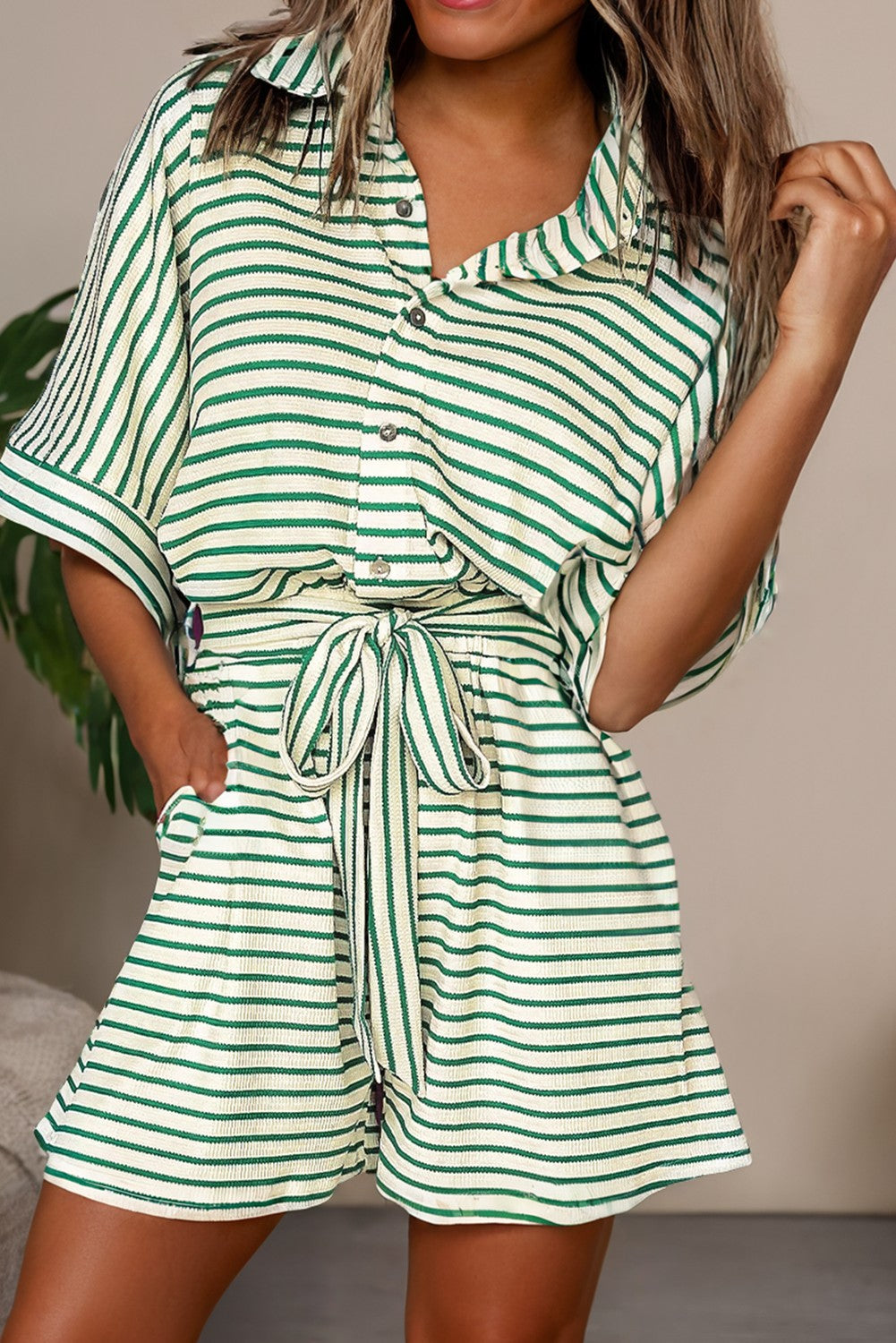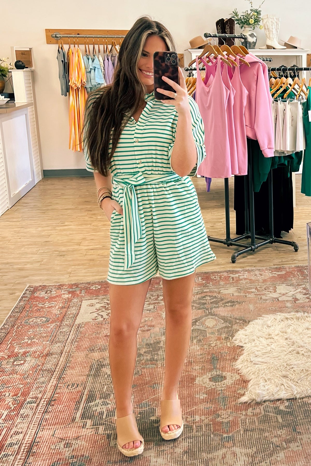 Need a cute, comfy fit? Slip into our Augusta Romper! This knit one-piece features elbow-length sleeves, a shirt collar, five silver-tone buttons down the front and an elastic waist with an adjustable tie. Two slip pockets at hips. Super comfy and easy to wear! Styled with our Manila Sandal (Laura) and Raina Wedge (Julia).