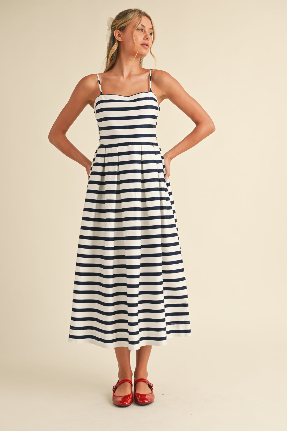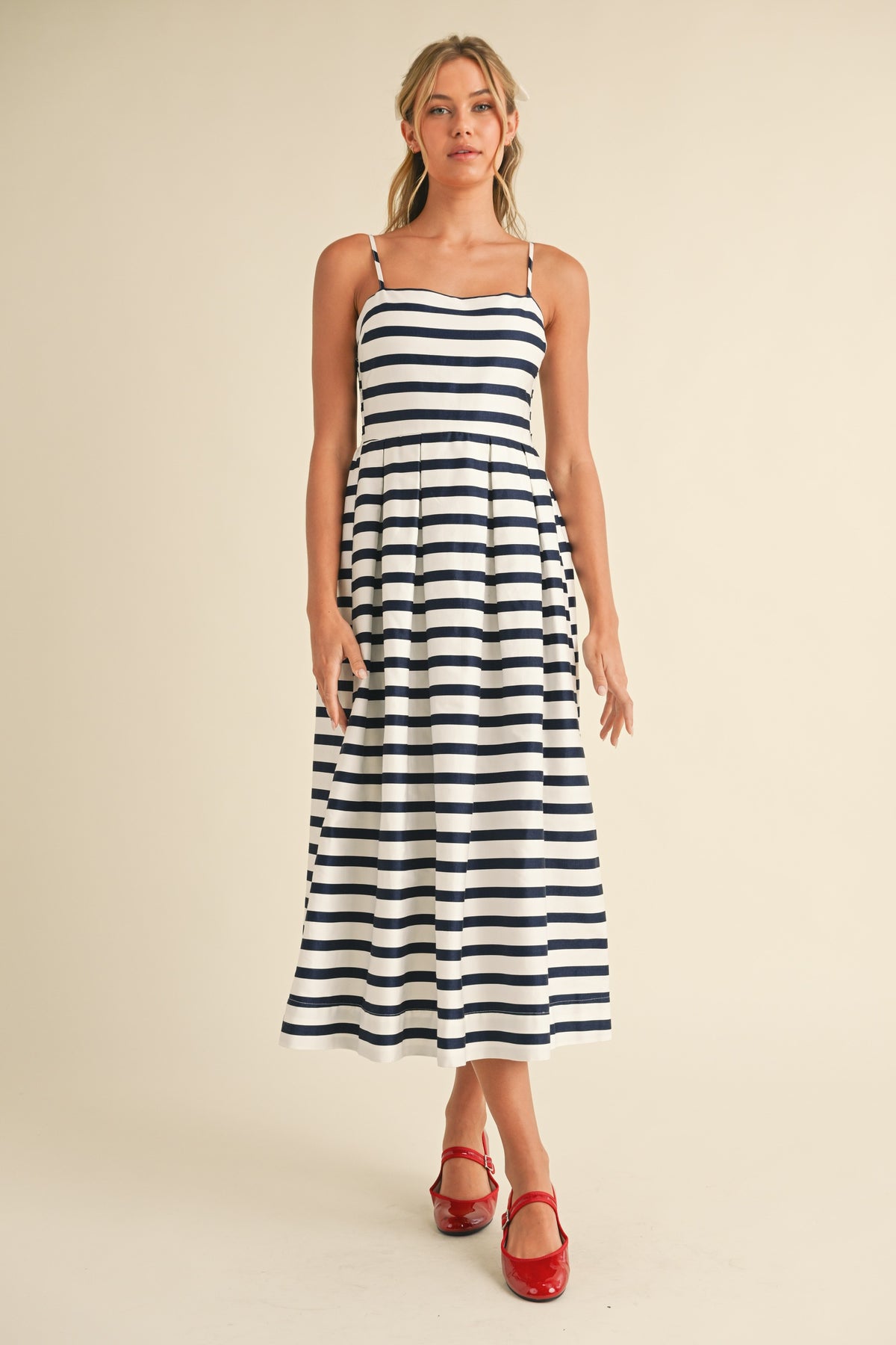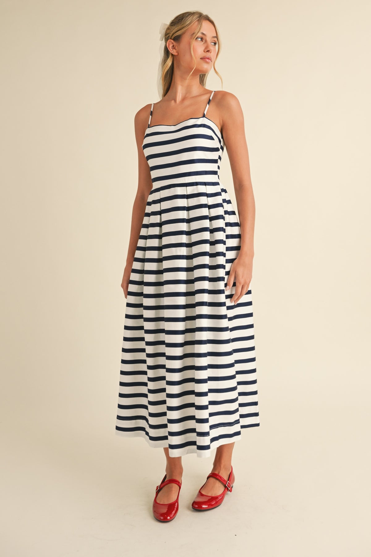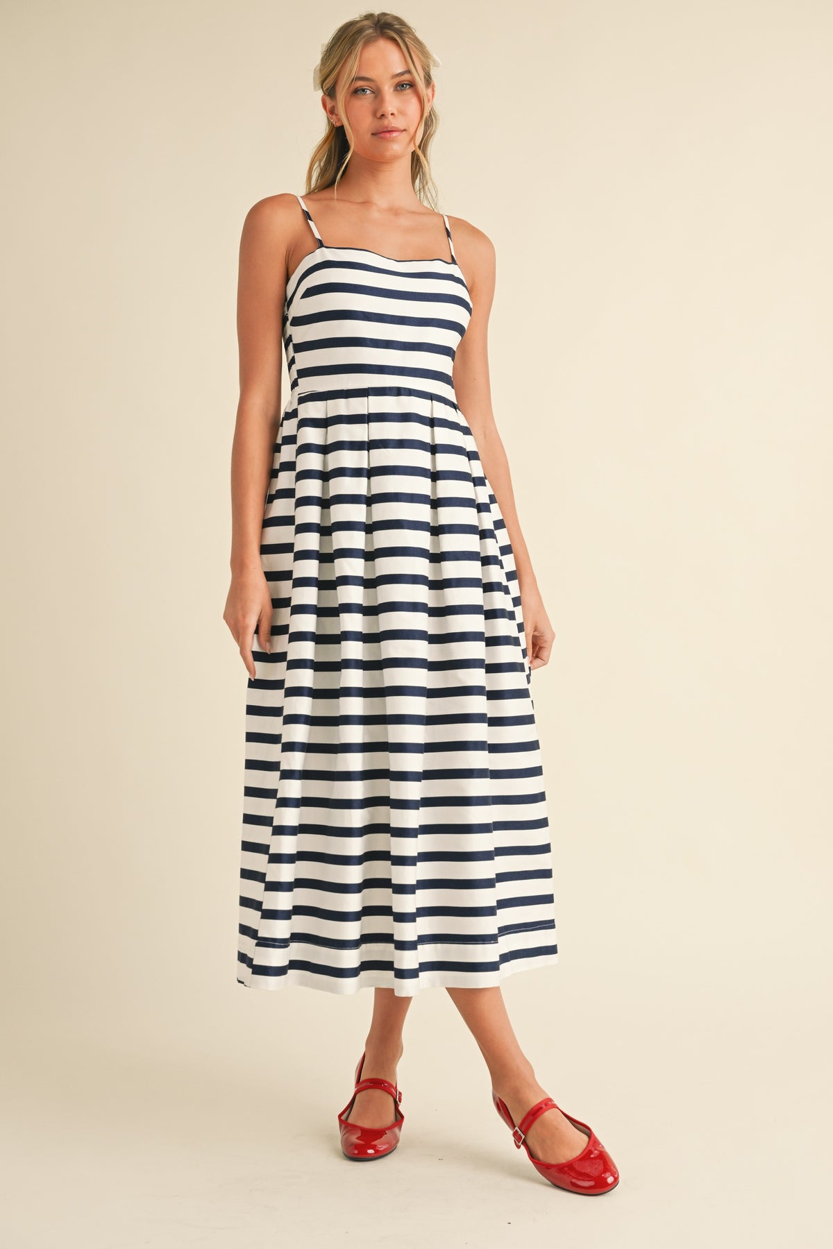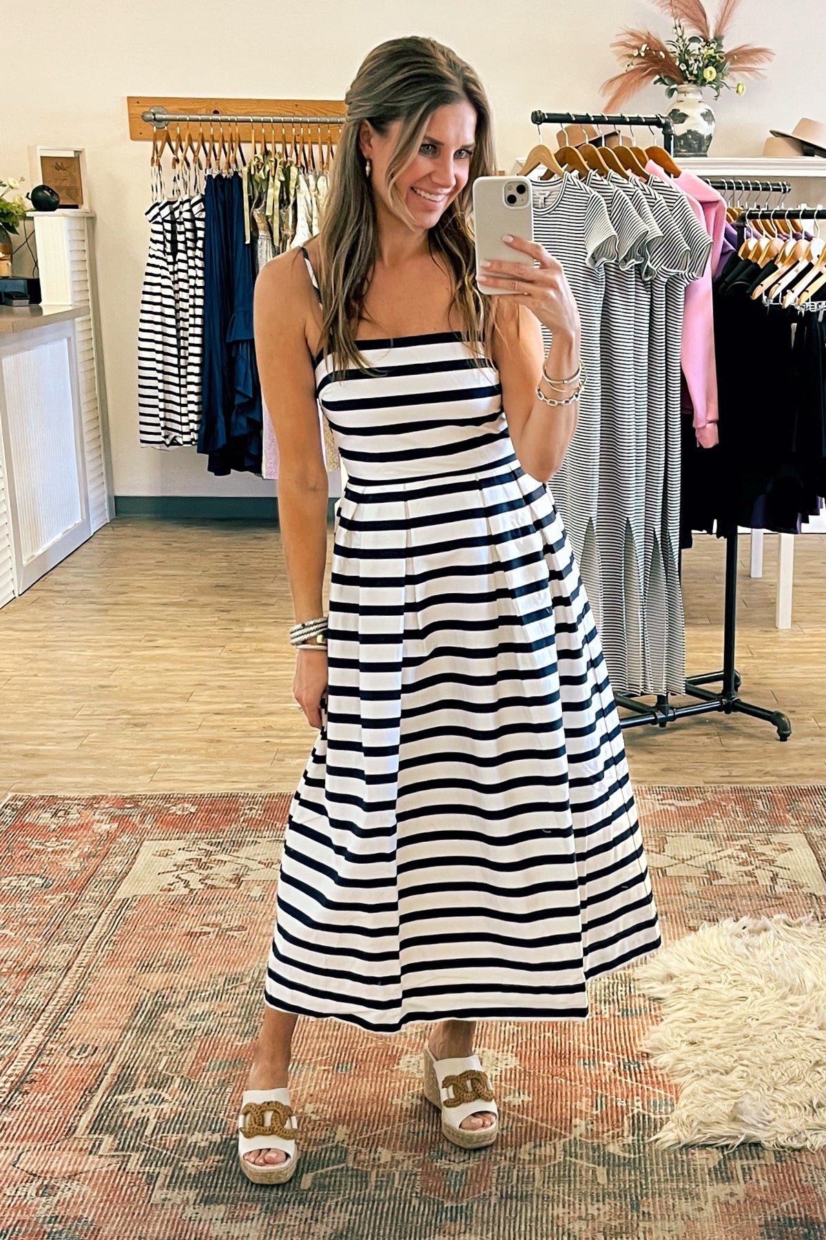 Our Babs Dress is a little bit retro, a lot chic. Navy stripes on an off-white body. Adjustable skinny straps. Midi length. Soft pleats at waist. A-line skirt. Hidden side zipper. Half-skirt lining. Styled with our Aime Wedge.