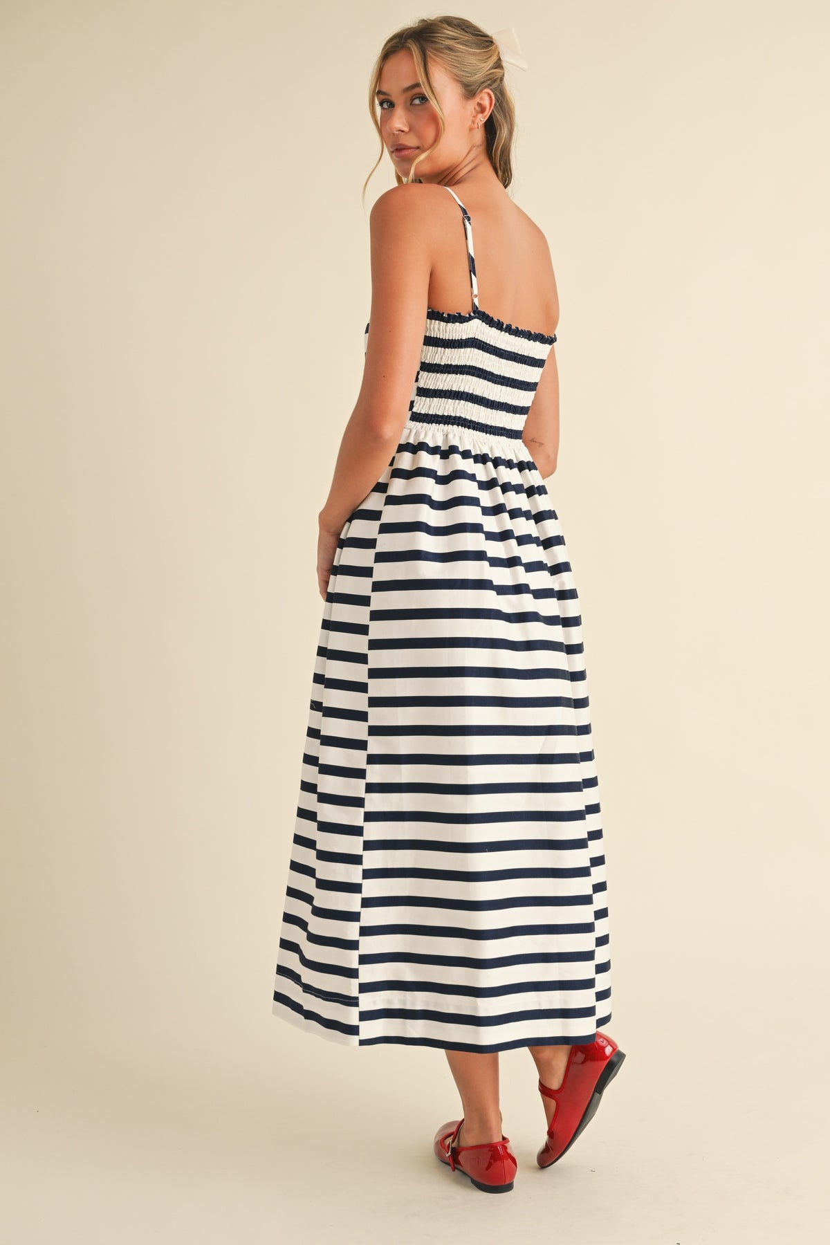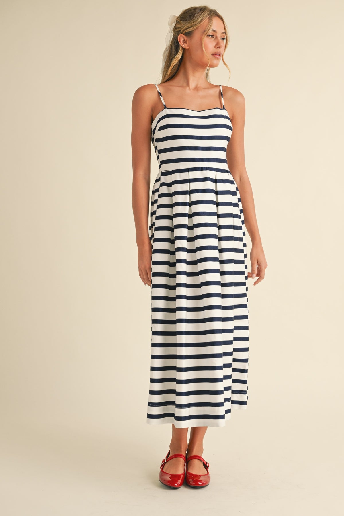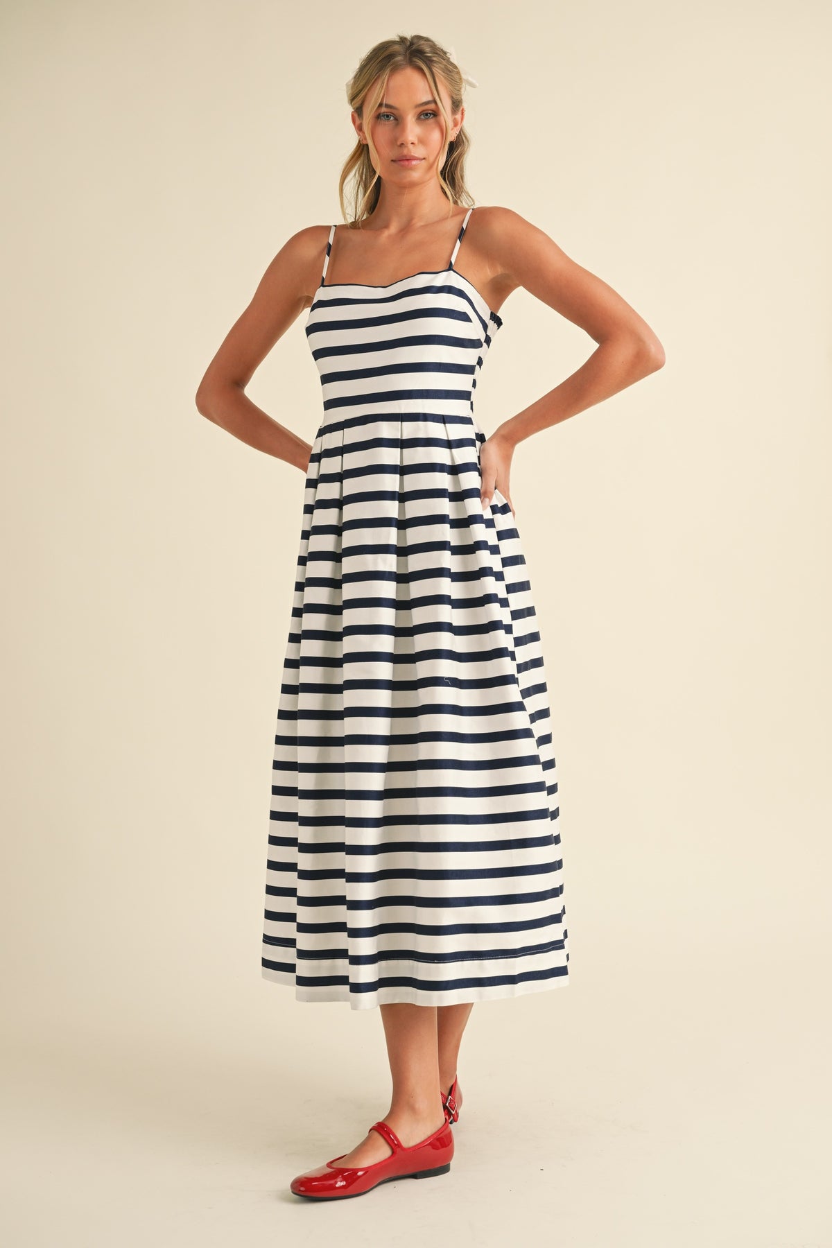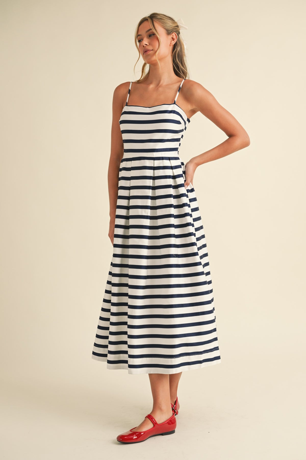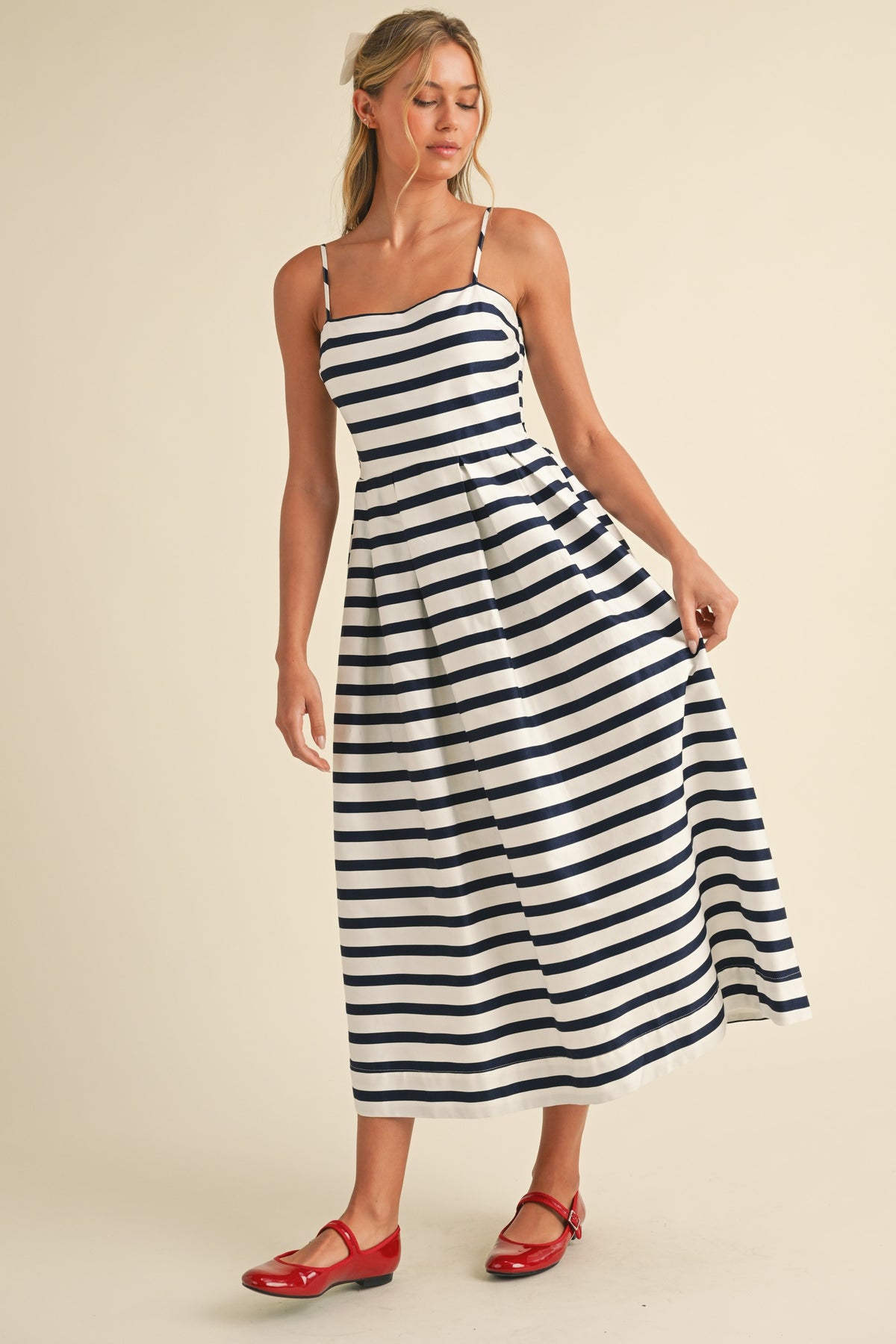 Our Babs Dress is a little bit retro, a lot chic. Navy stripes on an off-white body. Adjustable skinny straps. Midi length. Soft pleats at waist. A-line skirt. Hidden side zipper. Half-skirt lining. Styled with our Aime Wedge.