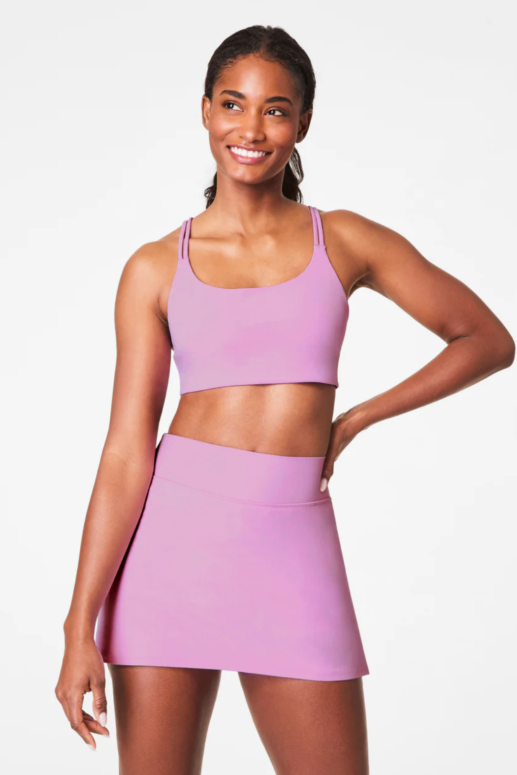 Our SPANXsmooth™ OnForm Skort is made from buttery-soft, lightweight performance fabric that gently smooths. Breathable, sweat-wicking, and crafted with 4-way stretch, this active style features built-in, center-seam-free shorts with side pockets to store your phone, keys, and other essentials while you're out and about. This skort is your go-to for before, during, and after your low-intensity workouts like pilates or yoga. Styled with our matching Spanx Air Essentials Half-Zip Pullover and Deer Striped Sneaker.