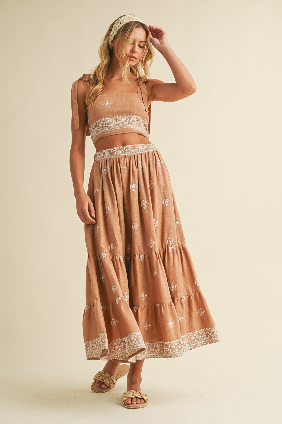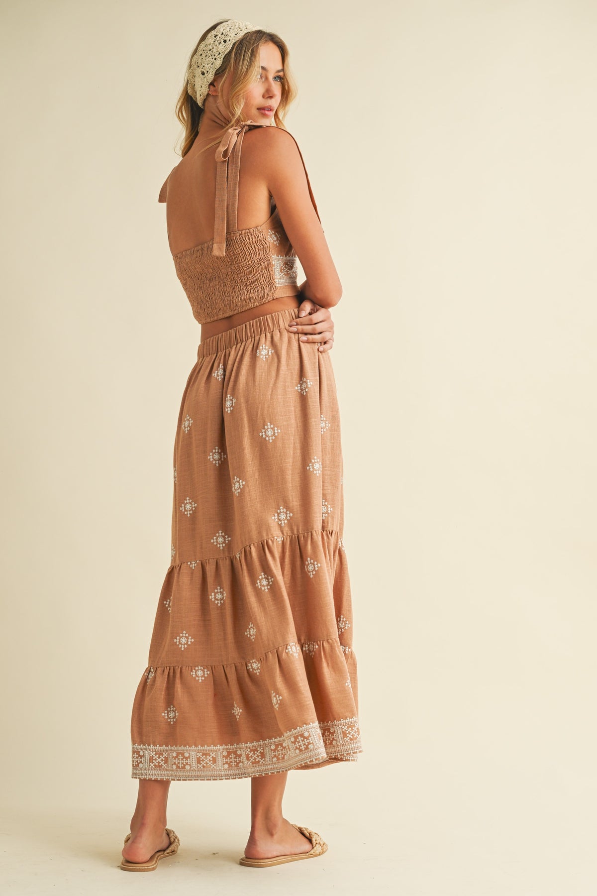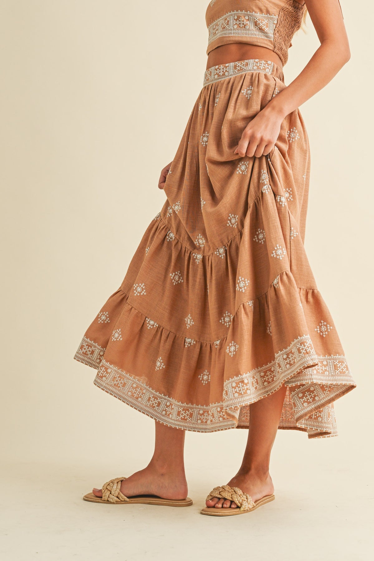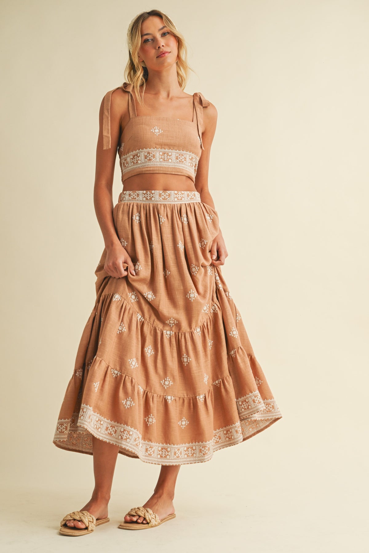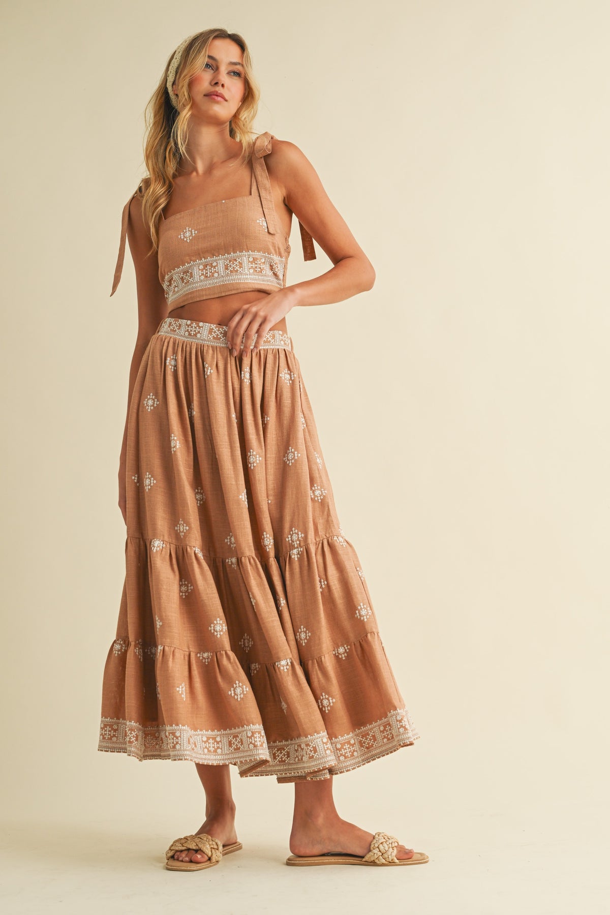 Our Clara Set transitions perfectly from late summer into fall! Skirt features gorgeous embroidery at the waistband and hem, as well as all over. Elastic waistband. Pull-on style (no zipper). Maxi length. No pockets. Styled with our matching Clara Top (sold separately) and Ashlyn Platform Sandal.